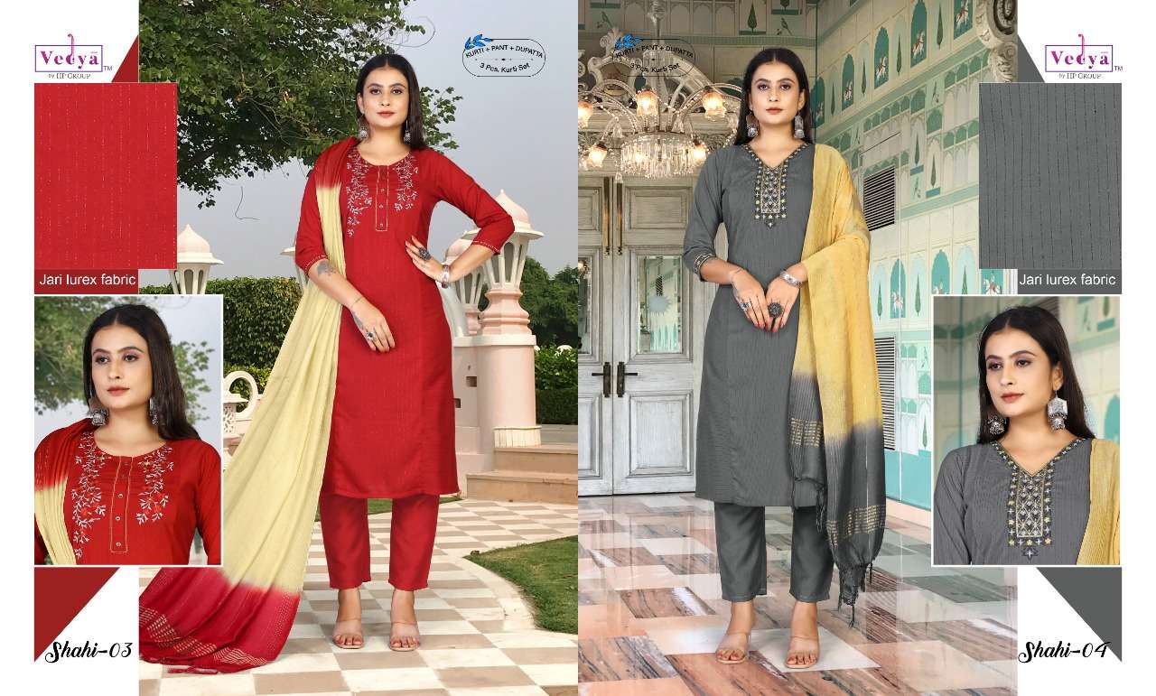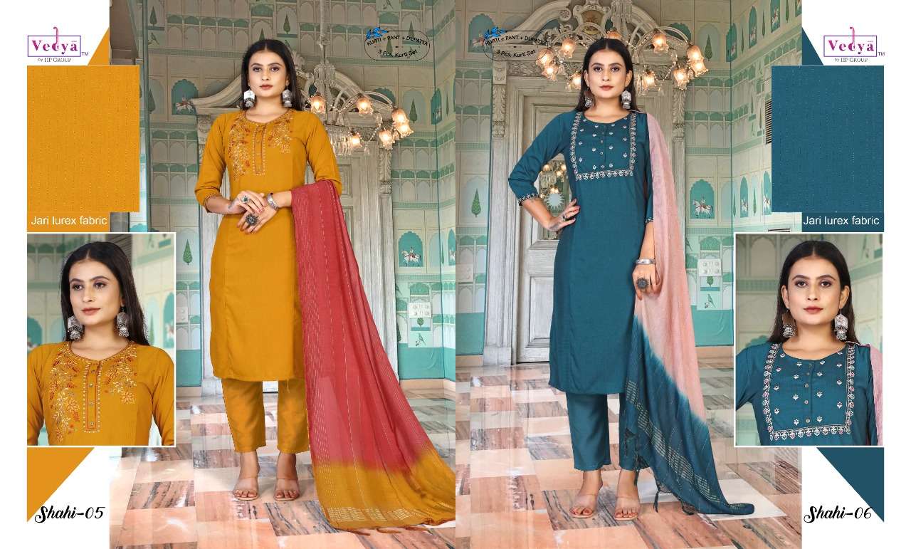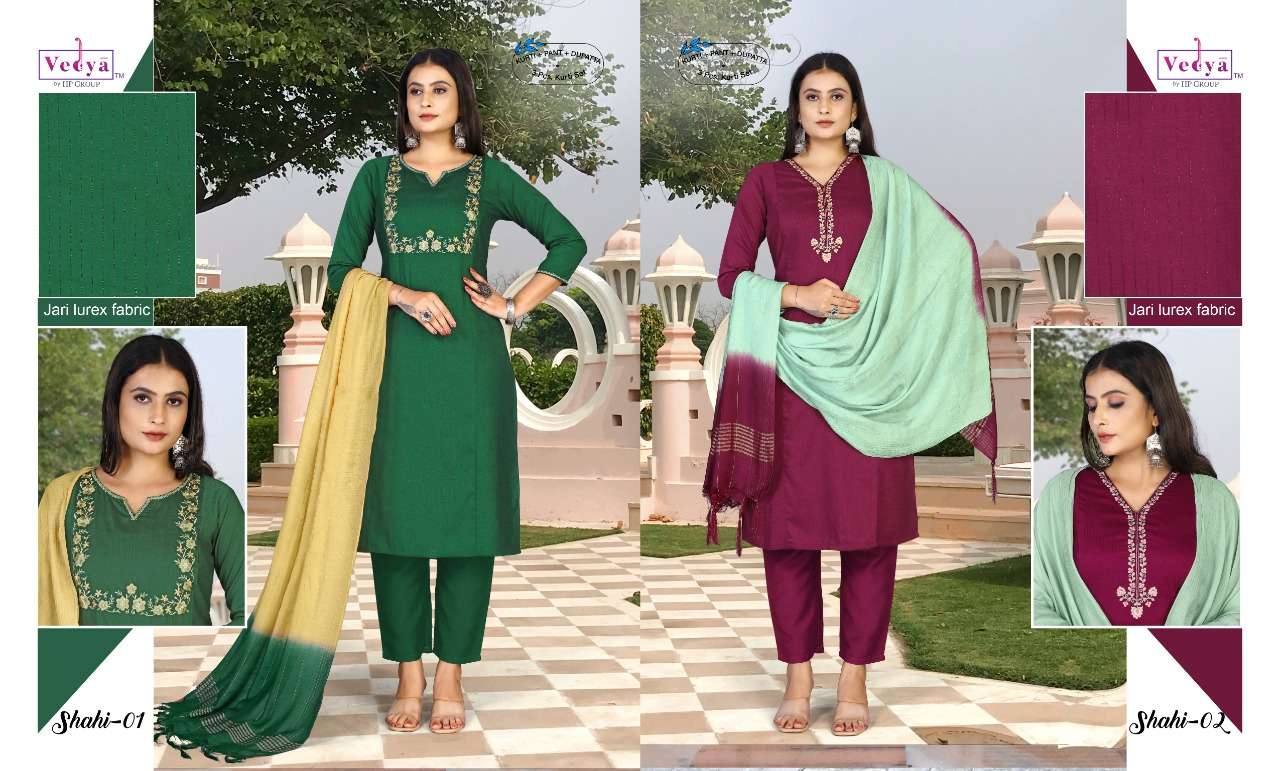VEDYA Presents~ 🌻❀SHAHI❀🌻 ☘️Top - PV Silk Lurex Lining fabric with Embroidery {A-line & Panel Cut Style given} 🌿Bottom - Heavy Santoon 🌱Dupatta - Nylon Fancy Jari Lining with Shading effect 🍁Sizes - M to 3XL 🍂Total 6️⃣ Pcs. per bag 🌼PRICE - 410/- |