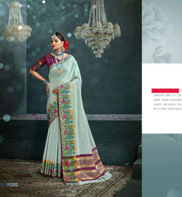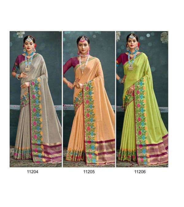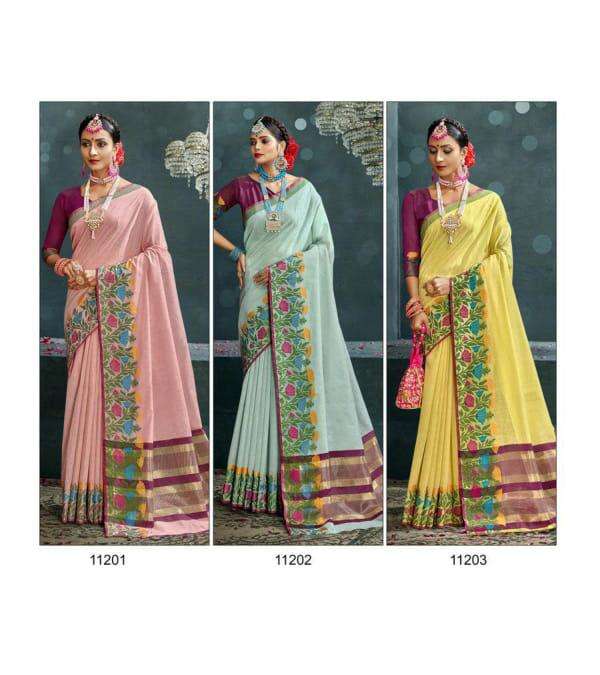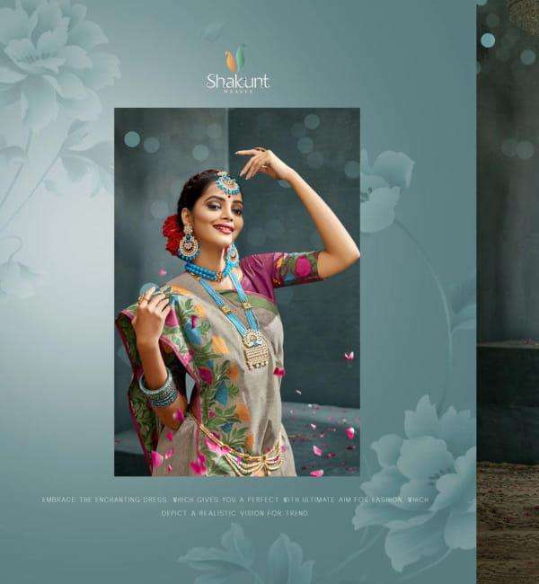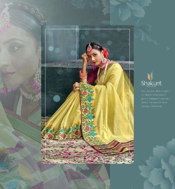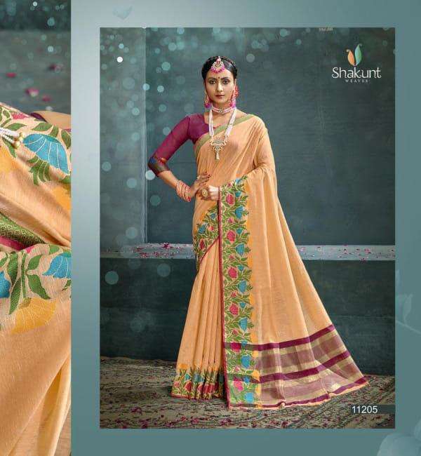 Brand - SHAKUNT. Catlog name - Â * SHREEKUNJ * Fabric- Cotton weavin silk . Rate - 631 per PCs . Set to set. GST 5 Percent Extra. Delivery from today |