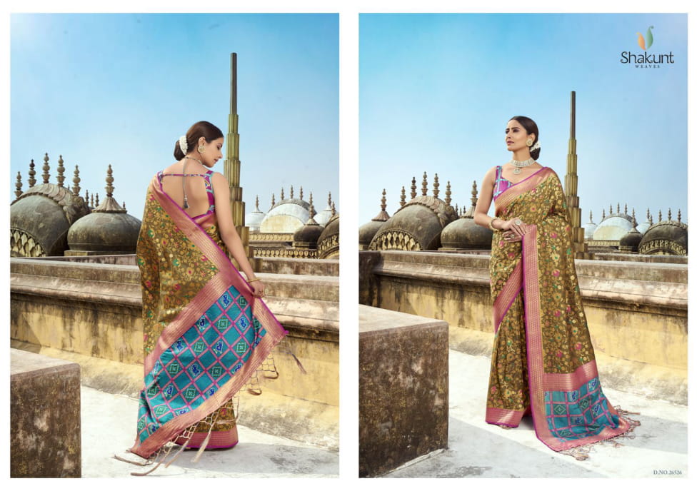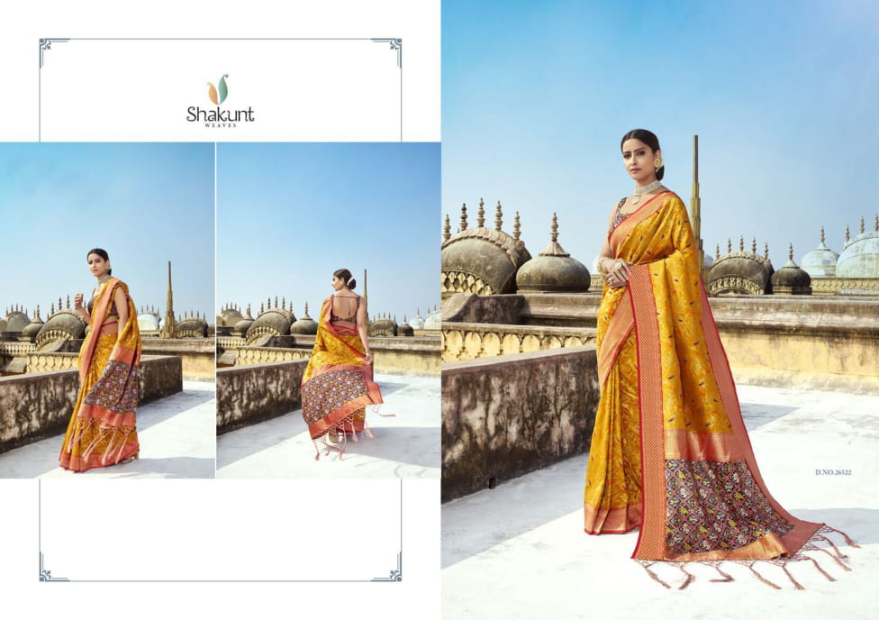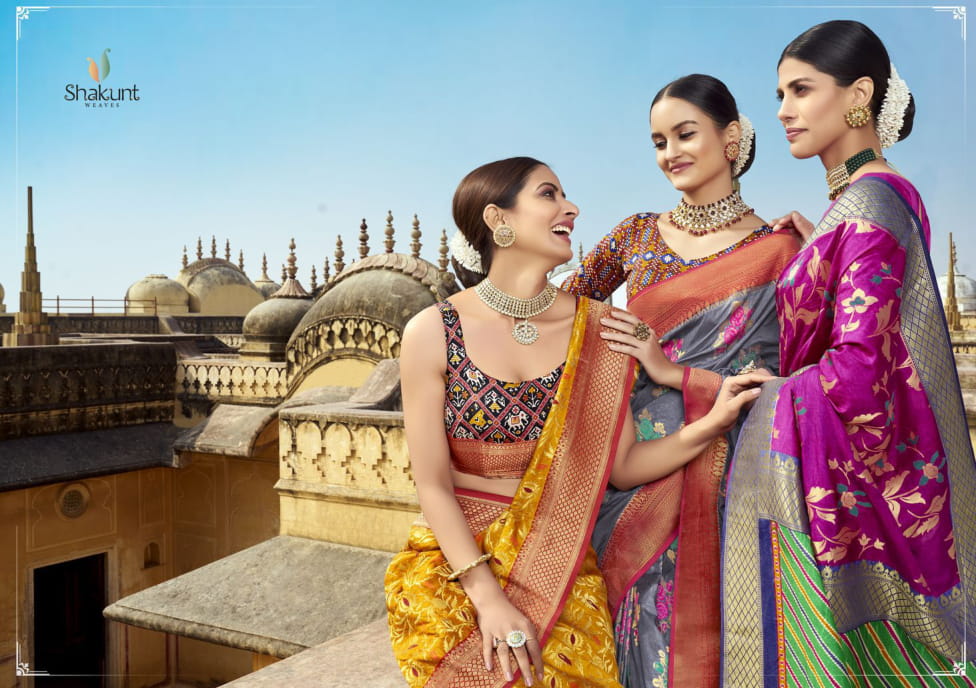 Shakunt Weaves presents Attraction All that is opulent, traditional, contemporary yet rooted. Explore the brilliance of master craftsmen and their traditional Patola art in this latest collection. A set of 5 sarees. Rate -1871 per pcs Set to set . GST 5 Percent Extra . Delivery 2 days T H E H O U S E O F T R I V E N I |