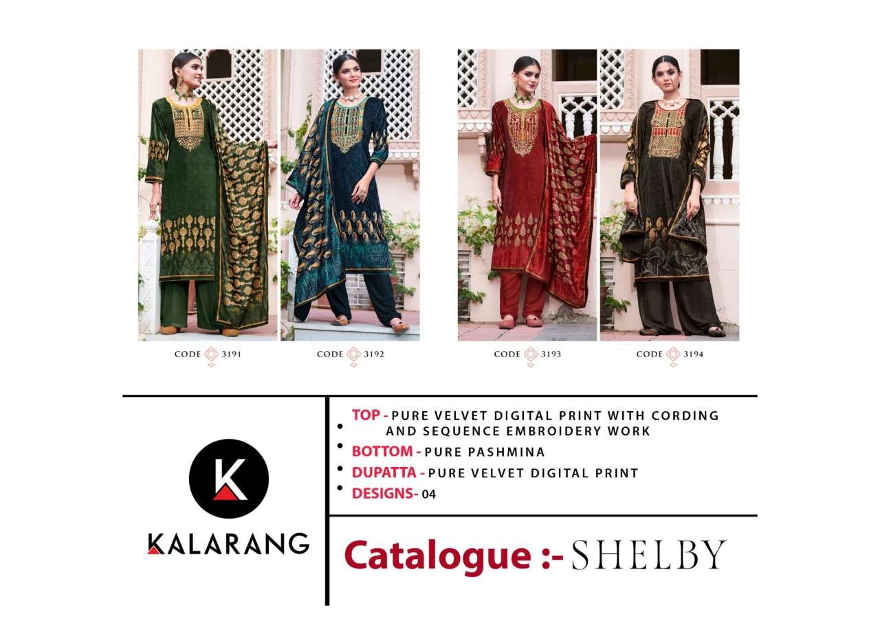 * KALARANG has launched  Catalog name :  * SHELBY* Fabric Details Top:- Pure Velvet Digital Print With Cording And Sequence Embroidery Work Bottom:- Pure Pashmina Dupatta:- Pure Velvet Digital Print           Total Design:- 4  Rate:- 1399/- per pcs Set to set Dispatching 5 to 6 days later |