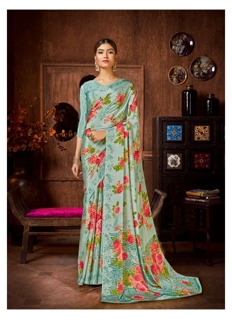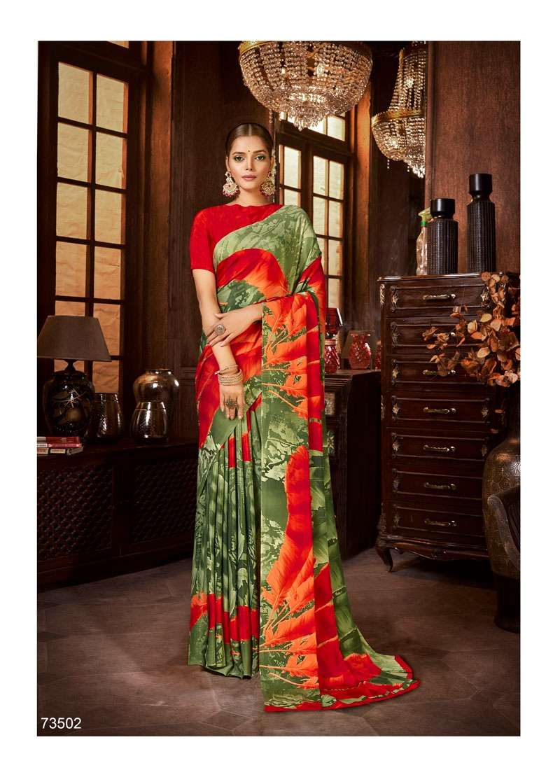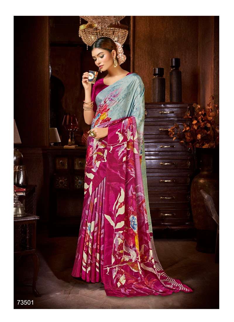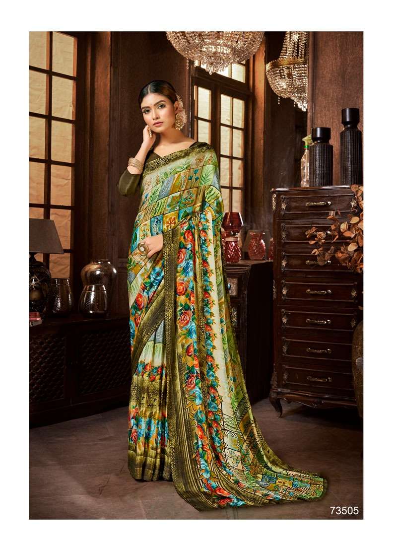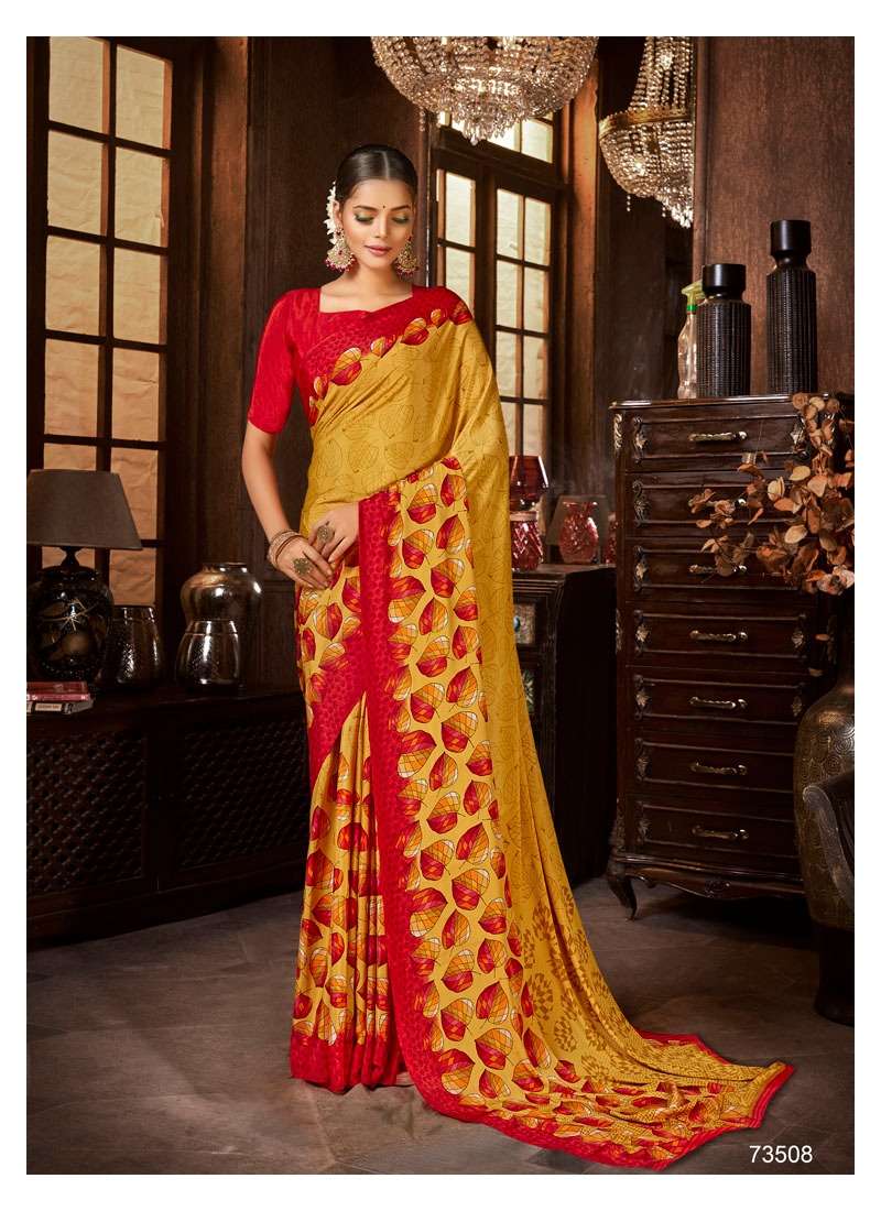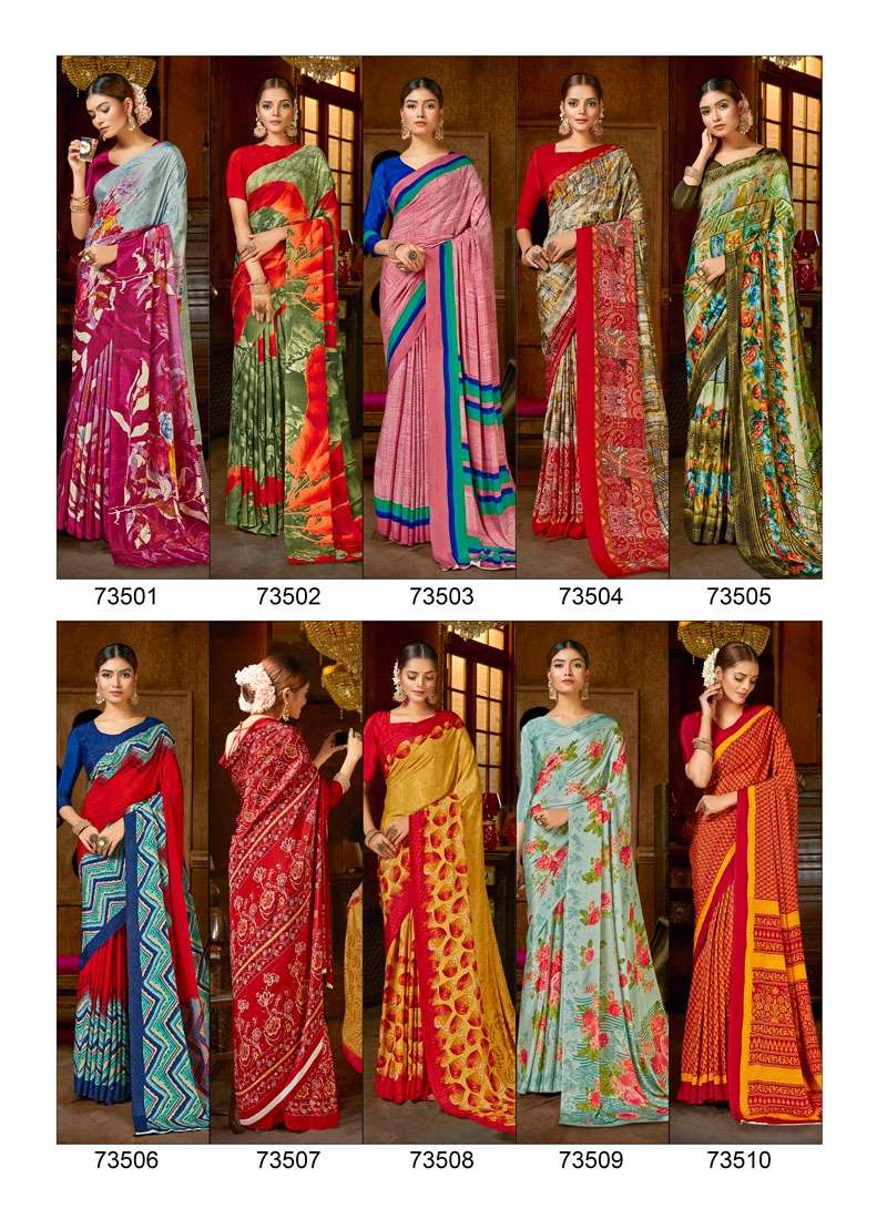 Brand = ANTRA  Catalog :- SHERLYN CRAPE Volume :- 2 Fabric :- KASTURI CRAPE Packing :- BOX Ex-mill Price :- 506 /- Cut/Length :- 6.30 Set to set FANCY SILKY AND PRINTED SAREE PACKING - Today |