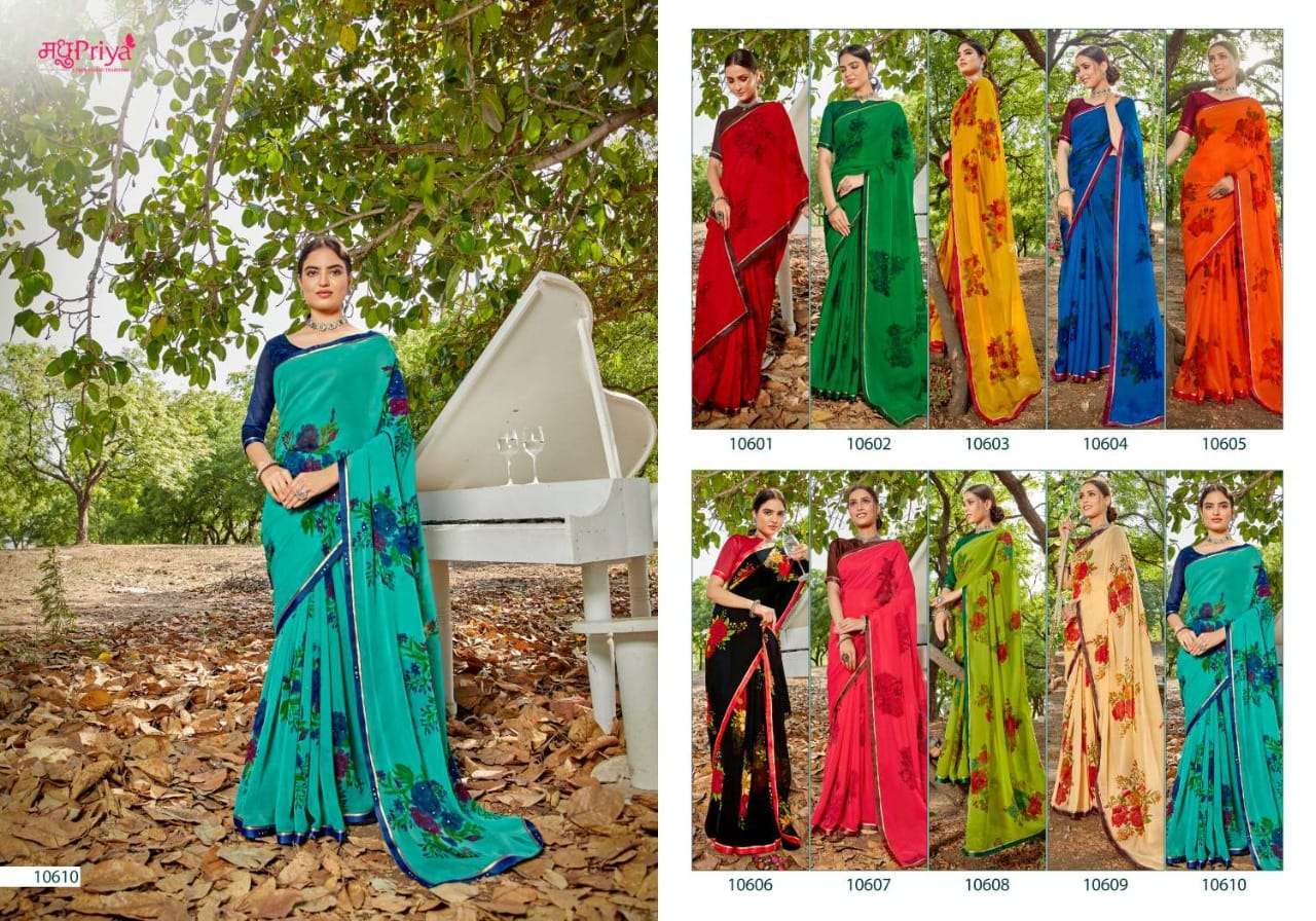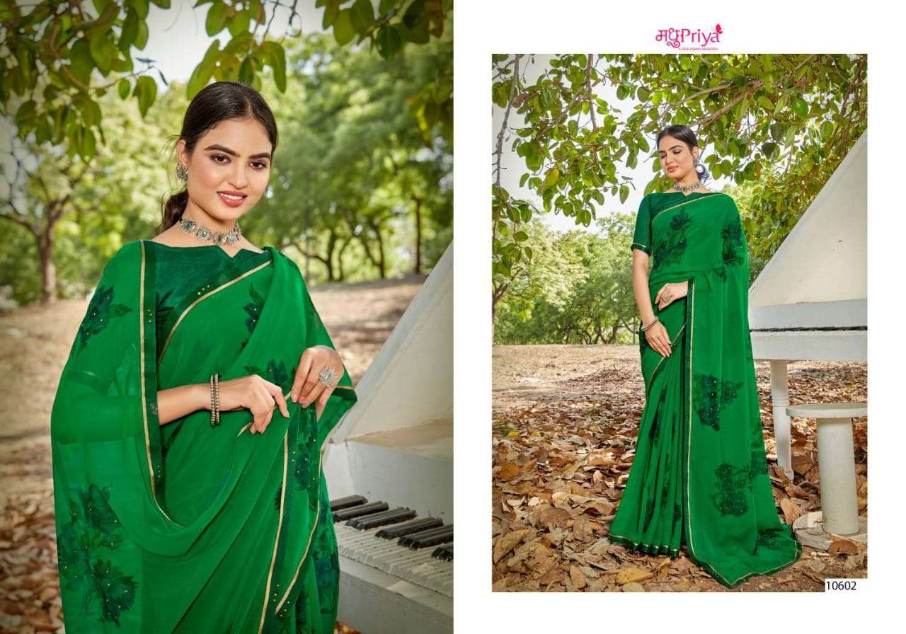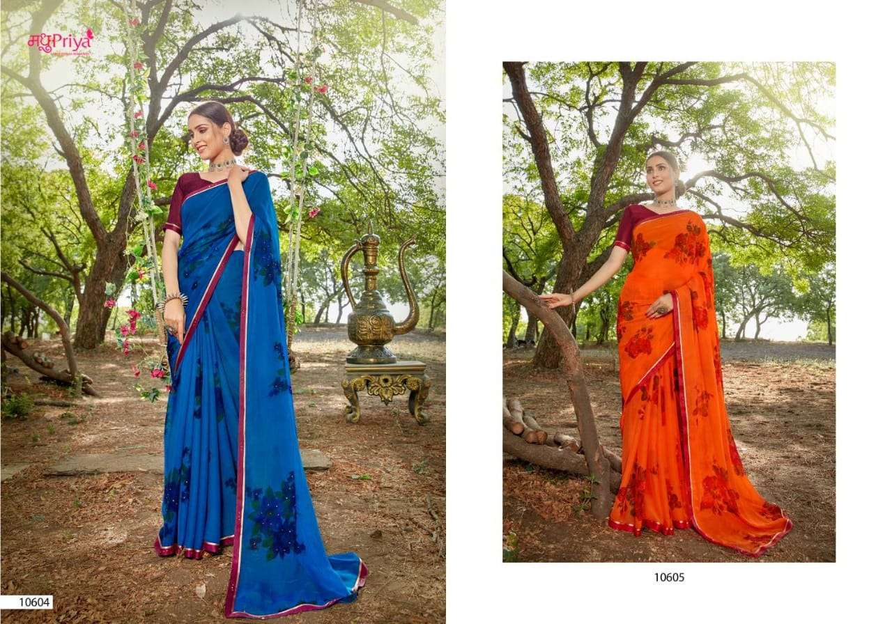 | Other Details | NEW INTRODUCING* SHIKHA Brand:- priya Rate:- 325-/ Set to set Delivery from today Fabric:- 60 GM CHIFFON WITH FLOWER PRINT + FANCY BORDER (FULL SAREE LACE) WITH DIAMOND WORK+ FANCY  BLOUSE Total Designs:- 10 _Packing pcs :- set to set Matching :- SINGLE COLOURS Cut :- 6/30 MT'S |