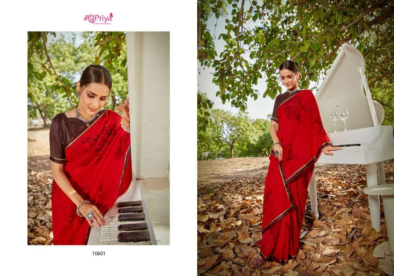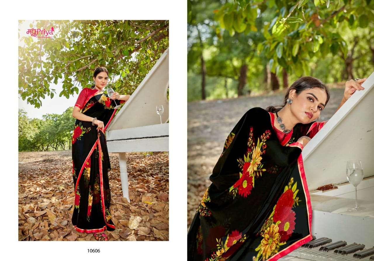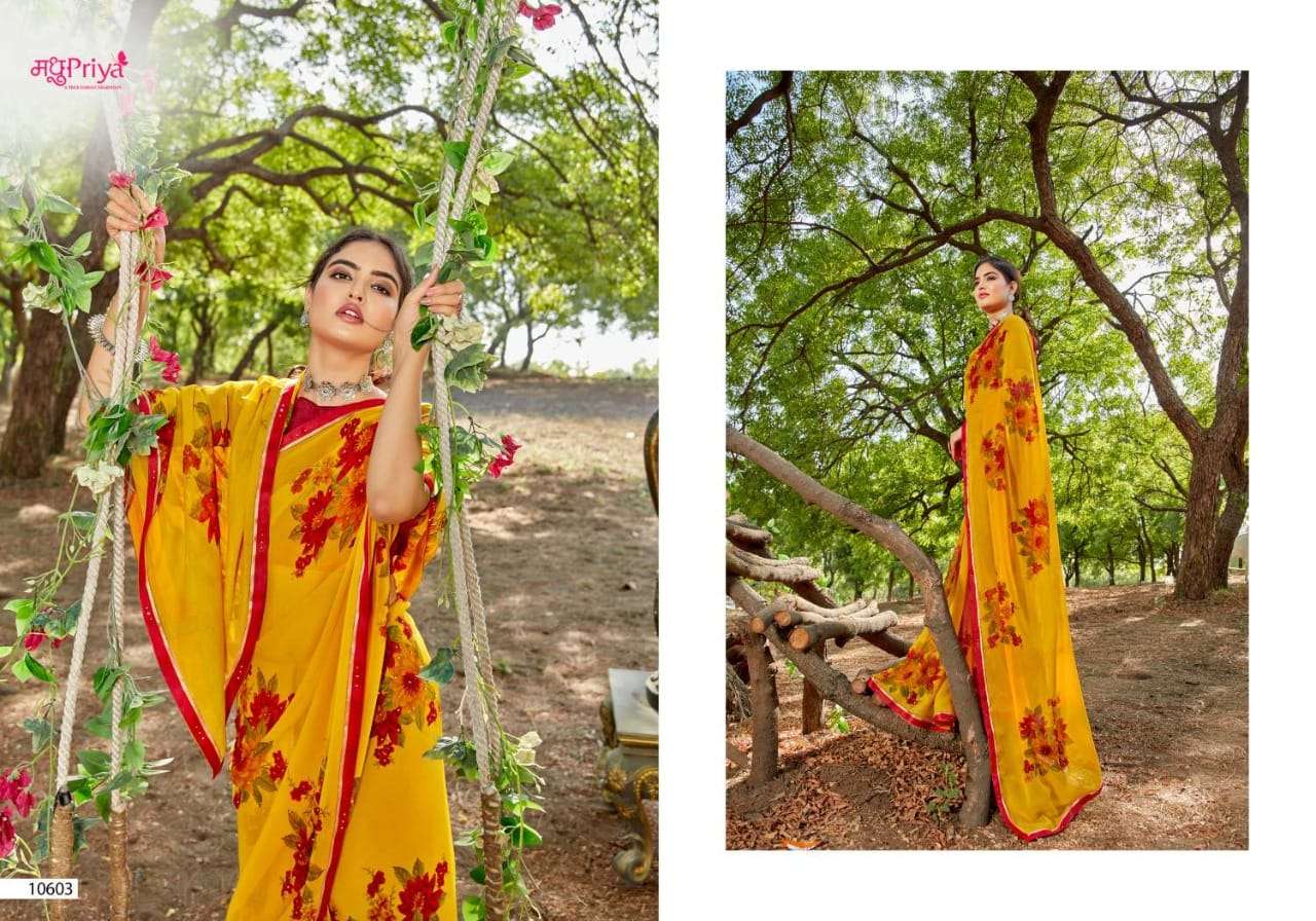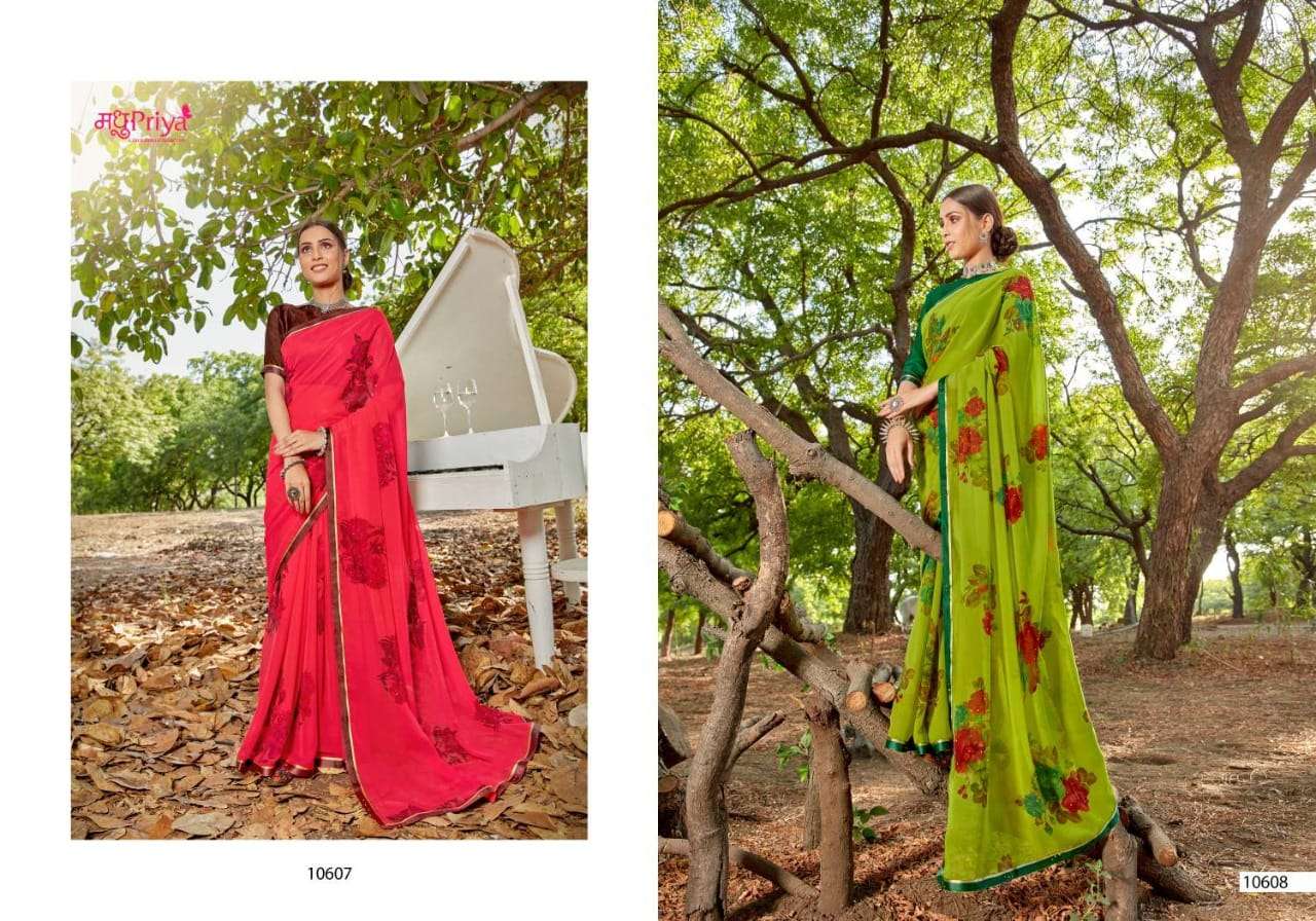 | Other Details | NEW INTRODUCING* SHIKHA Brand:- priya Rate:- 325-/ Set to set Delivery from today Fabric:- 60 GM CHIFFON WITH FLOWER PRINT + FANCY BORDER (FULL SAREE LACE) WITH DIAMOND WORK+ FANCY  BLOUSE Total Designs:- 10 _Packing pcs :- set to set Matching :- SINGLE COLOURS Cut :- 6/30 MT'S |