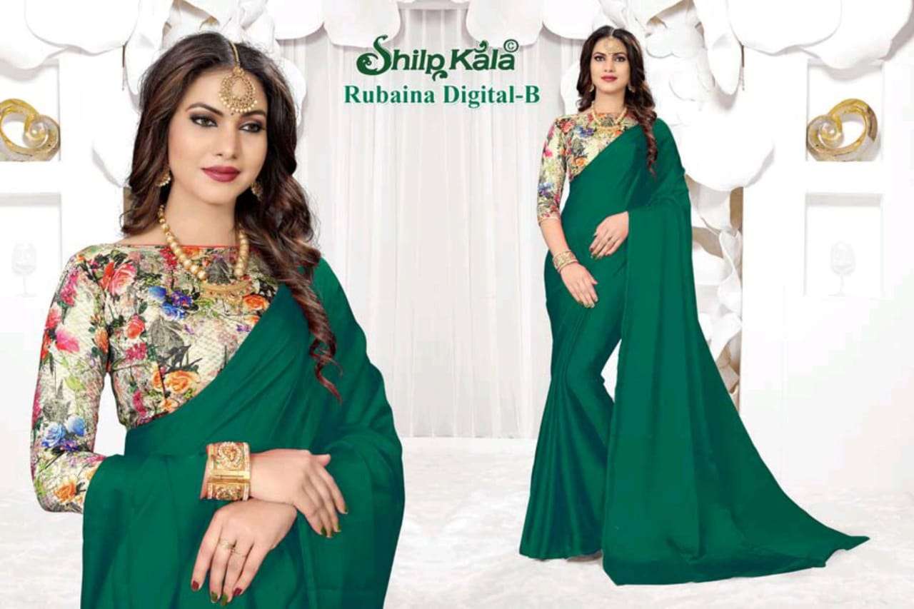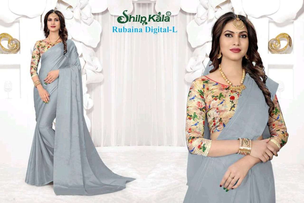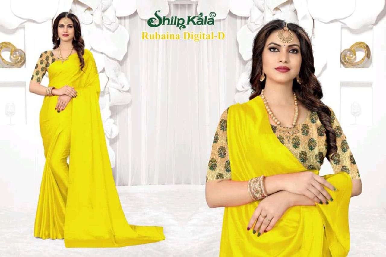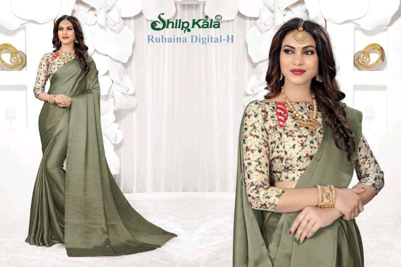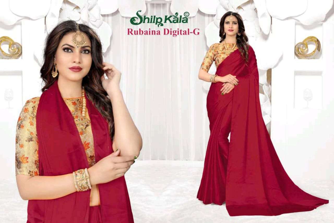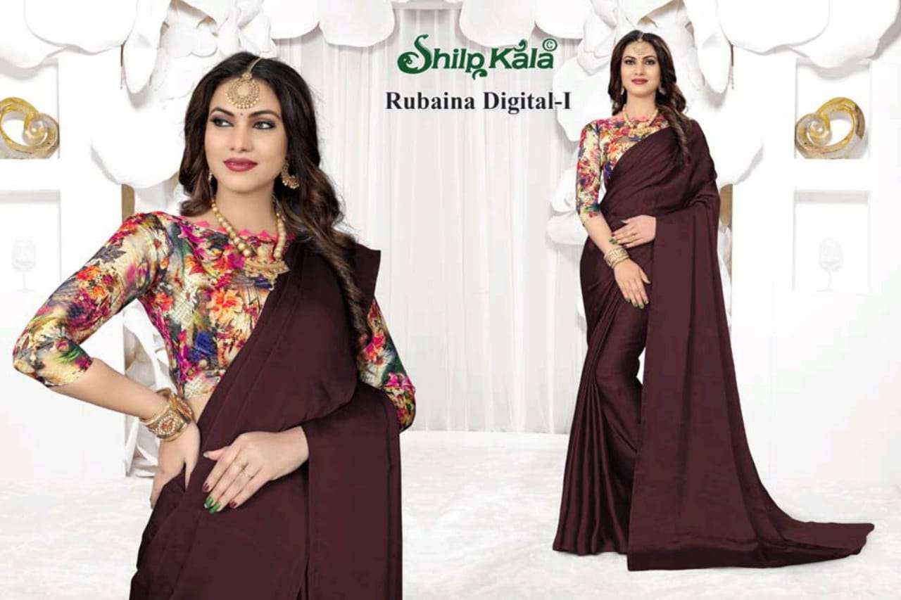 shilp kala present rubaina digital satin plain saree with fancy blouse concept