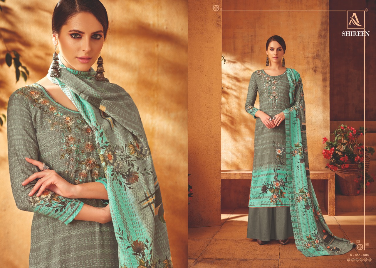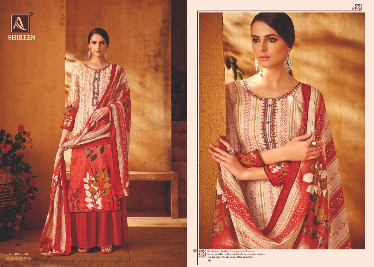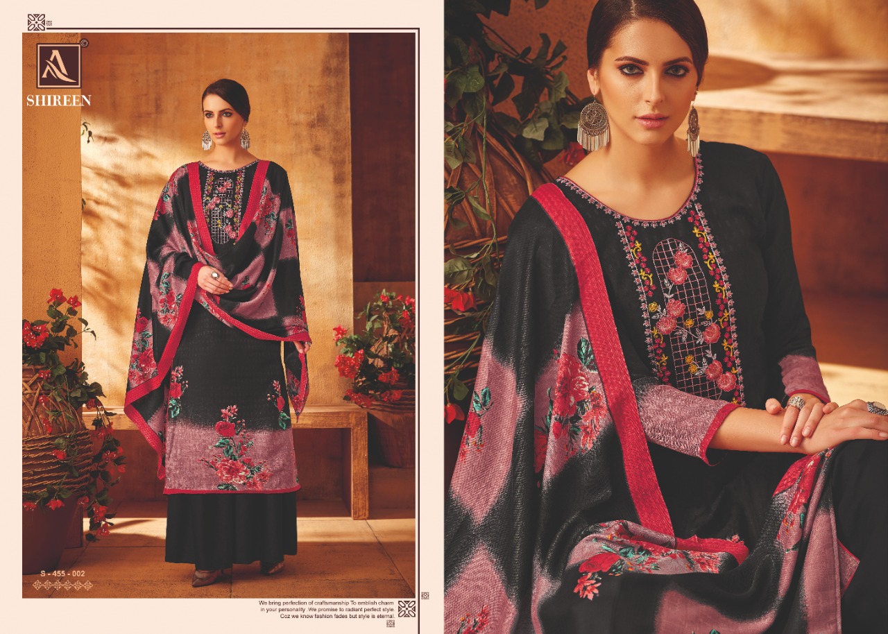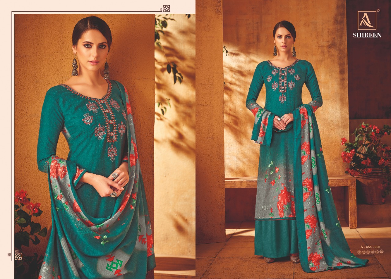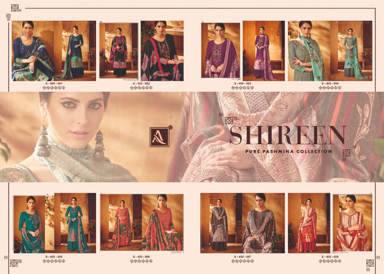 **SHIREEN* - *Incredible Pashmina Collection Here Alok Suit presents a very fresh Pashmina collection - SHIREEN. Chic Pashmina Top with classy bottom and tempting Dupatta is surly going to give you best comfort with style. Fabric Details: Top: Pure Pashmina Jacquard Digital floralPrint with Embroidery Bottom: Pure Pashmina solid Dupatta: Pure Pashmina Jacquard Shawl Designer Print Dupatta with four side lace The single set of dresses contains: 8⃣Pcs Make it yours with really affordable rate: ₹5⃣5⃣0⃣ + 5⃣% GST |
