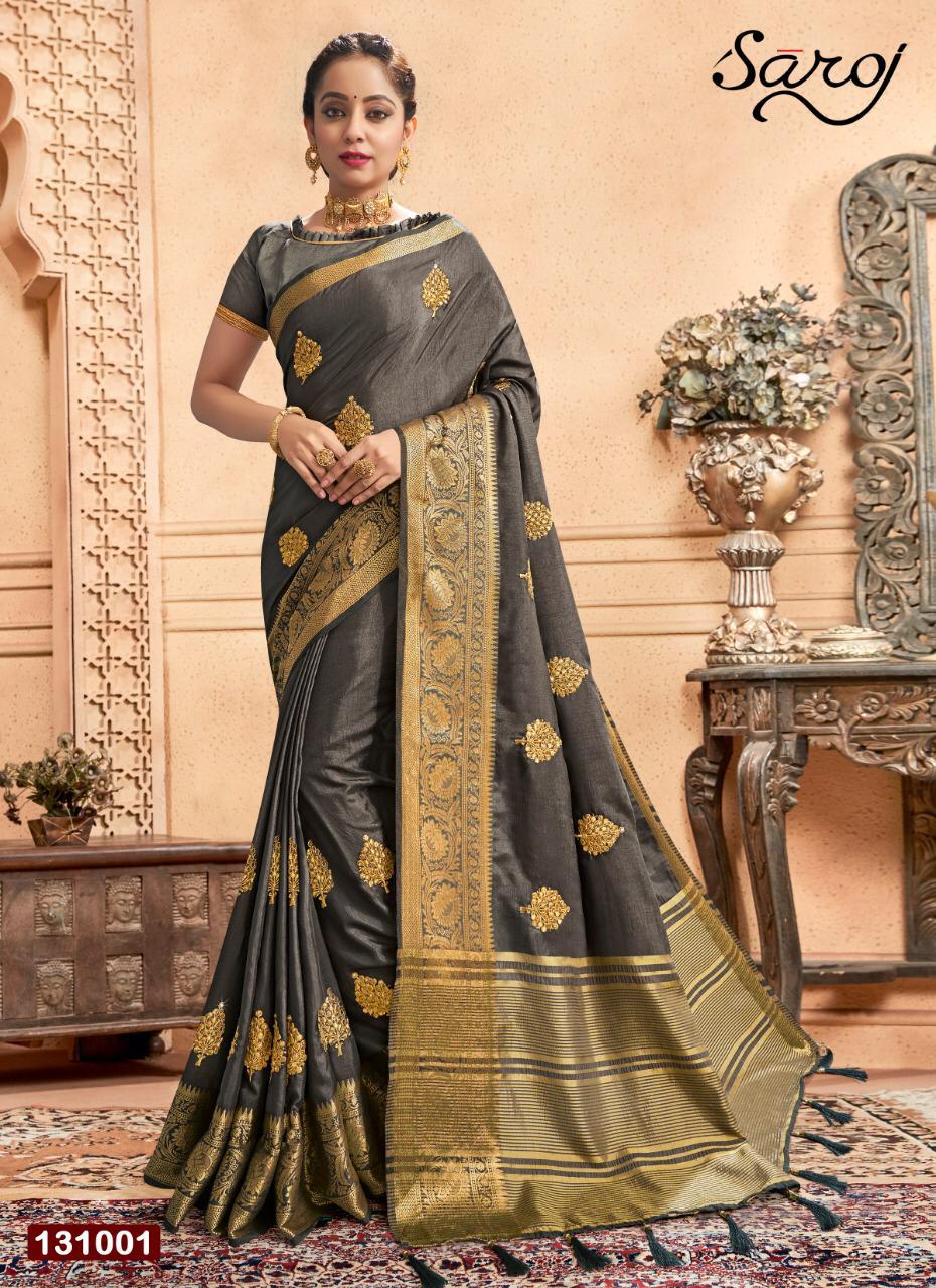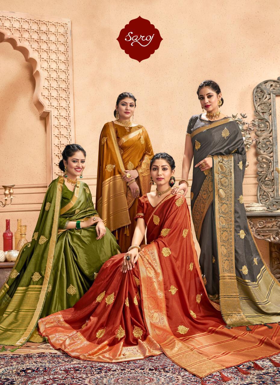 *Shivika by Saroj * Rate - 1290 per Pcs . Fabric: Dola Silk, Chit Pallu with Jari Work. Blouse: Banglori Silk. 4 Designs in set . Set to set. GST 5 Percent Extra Delivery 3-4 days |