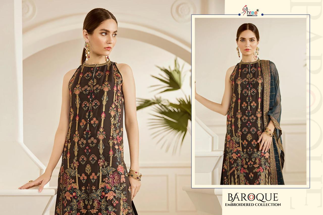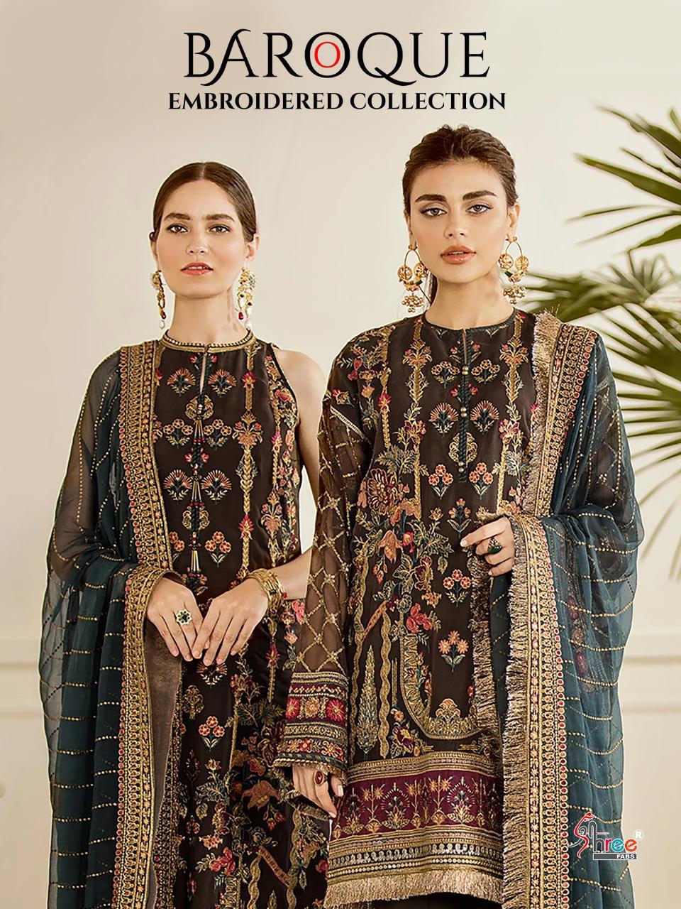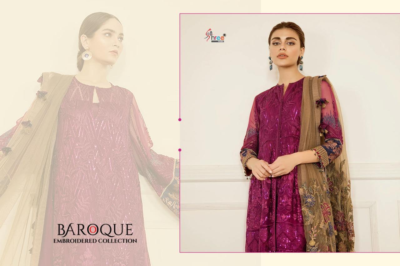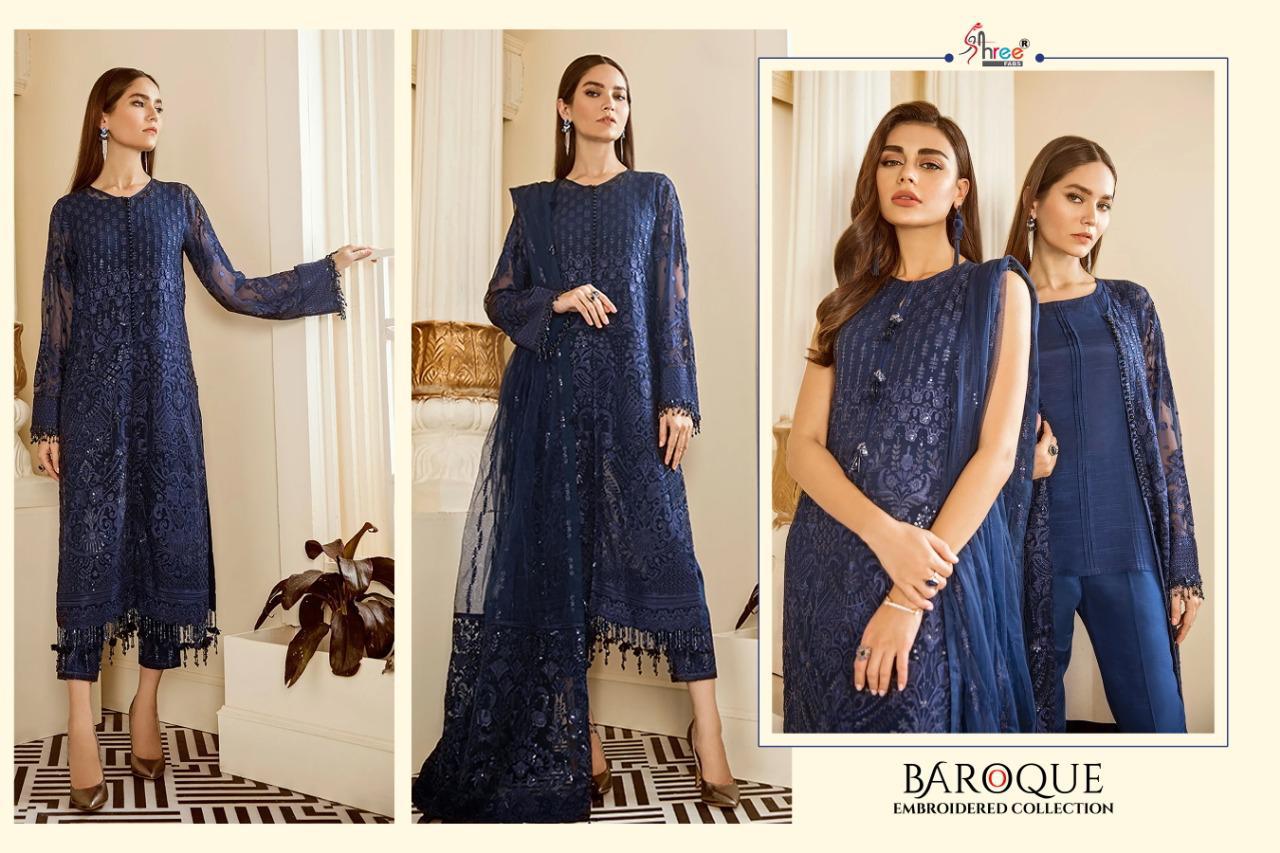 BAROQUE EMBRODERD COLLECTION TOP HEAVY JORGET WITH EMBRODERY BOTTOM INNER SANTOON DUPPTA NET & NAJMIN EMBRODERD DES 4 RATE 1299 SHREE FABS SURAT |