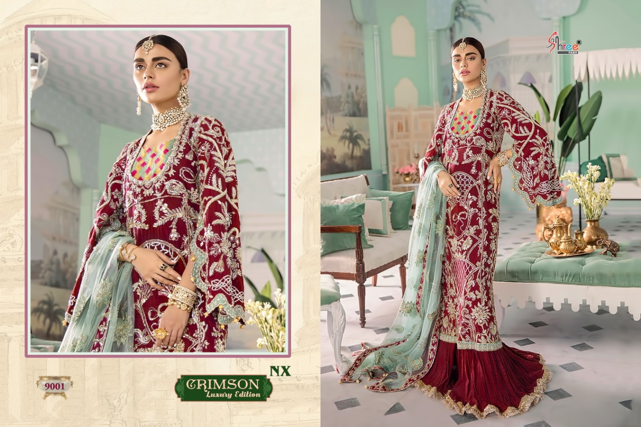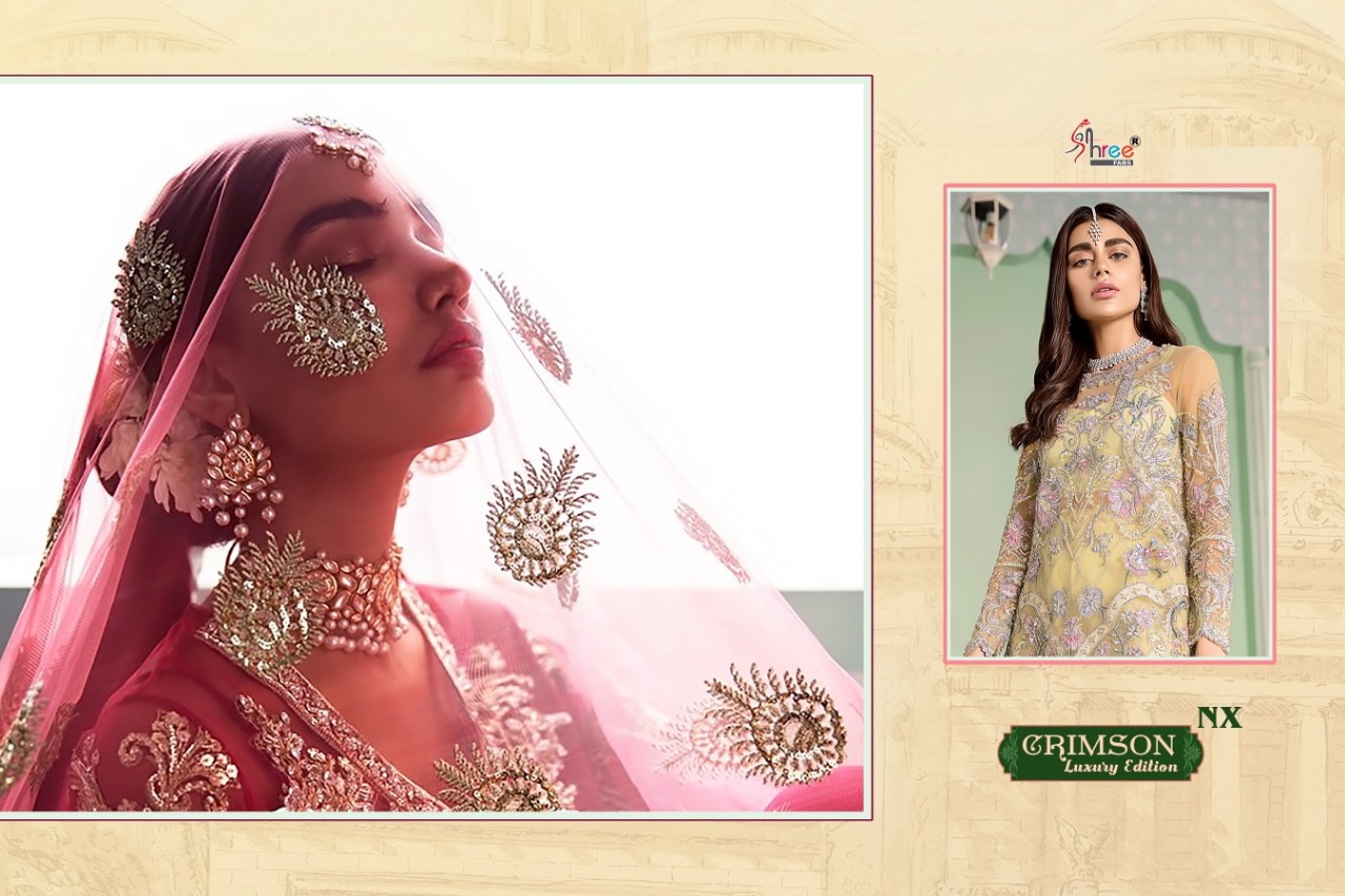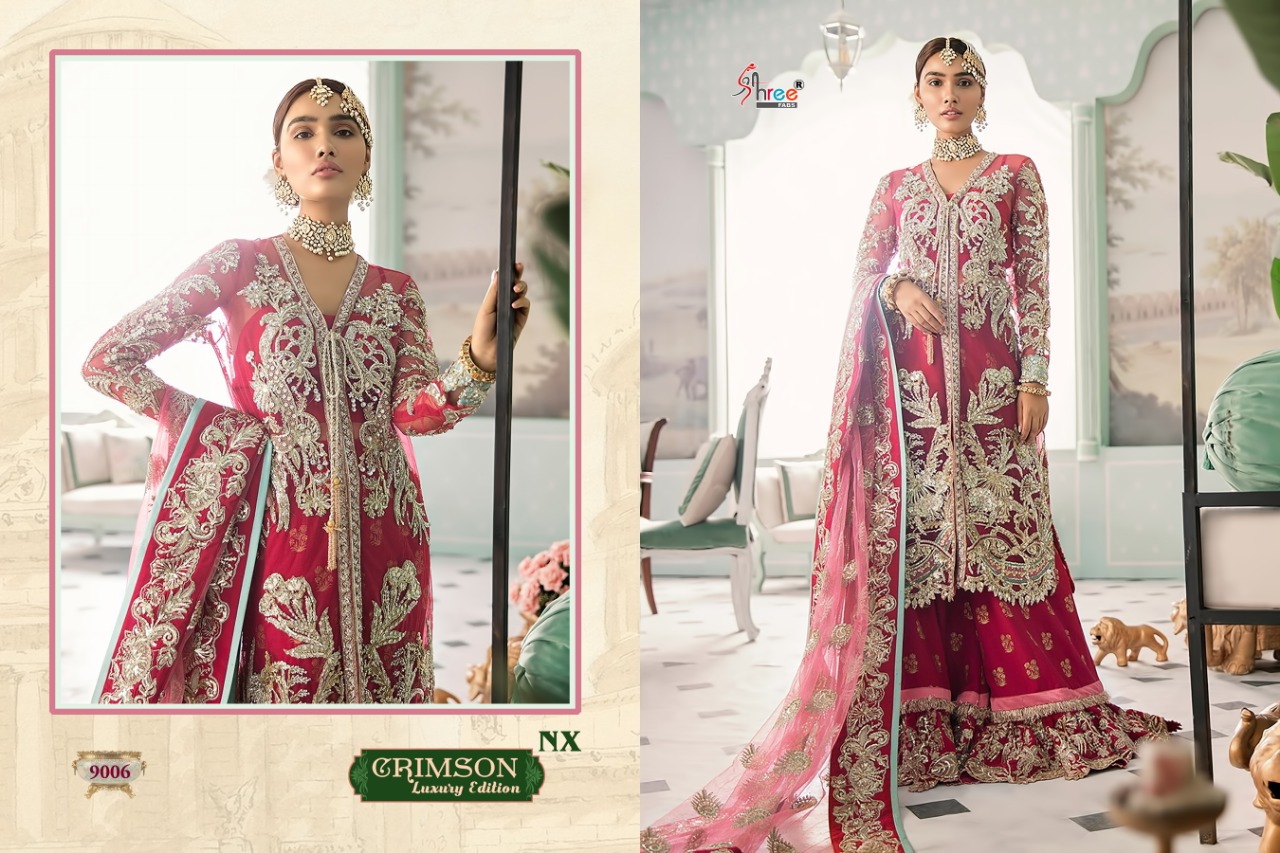 Shree fabs present SUPER hit catlouge CRIMSON LUXURY EDITION NX Top heavy net with heavy embrodery & addition work Bottom inner santoon & fancy fabric Duppta embrodery net Designs 5 Rate 1650 LIMITED STOCK |