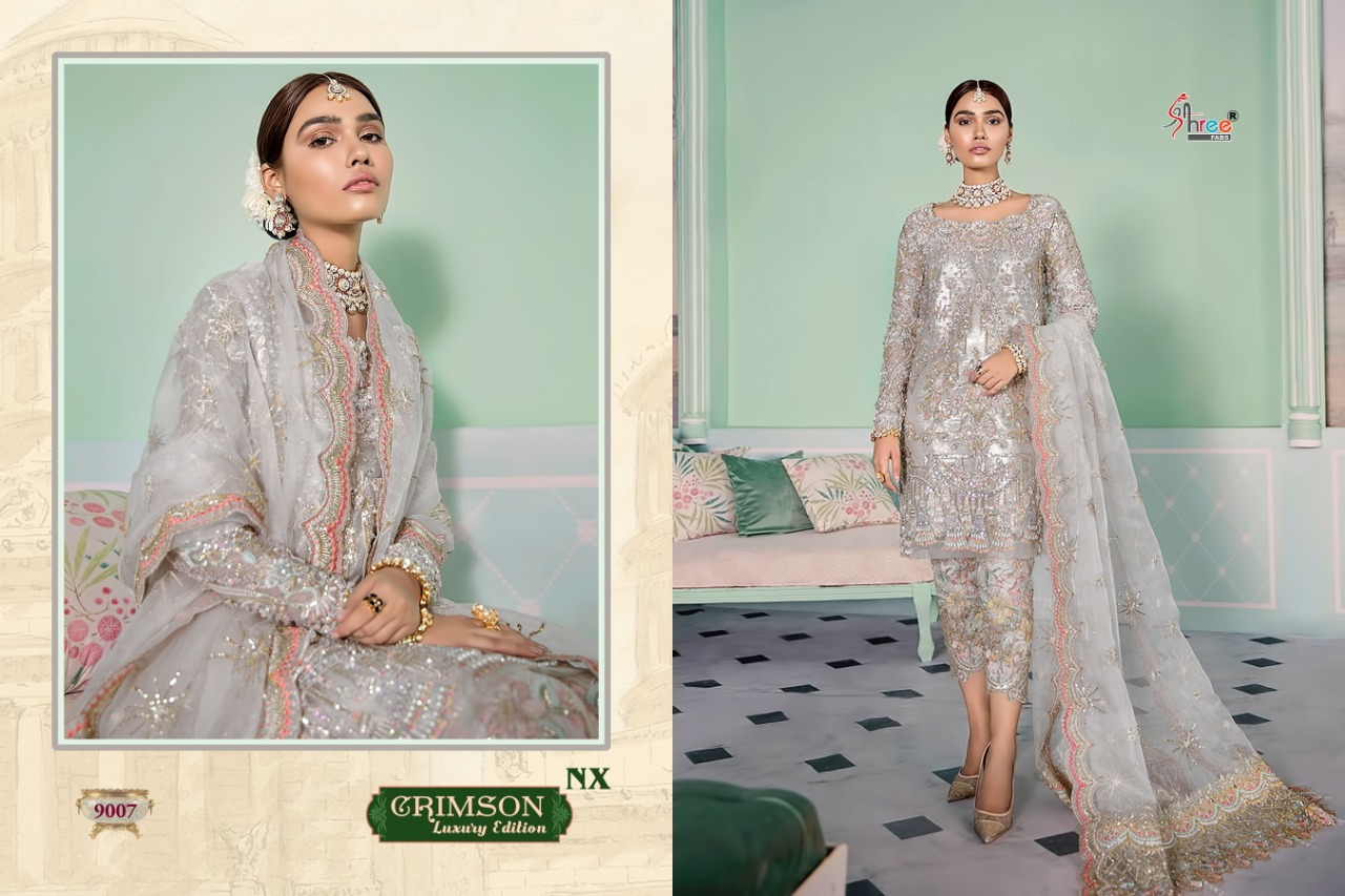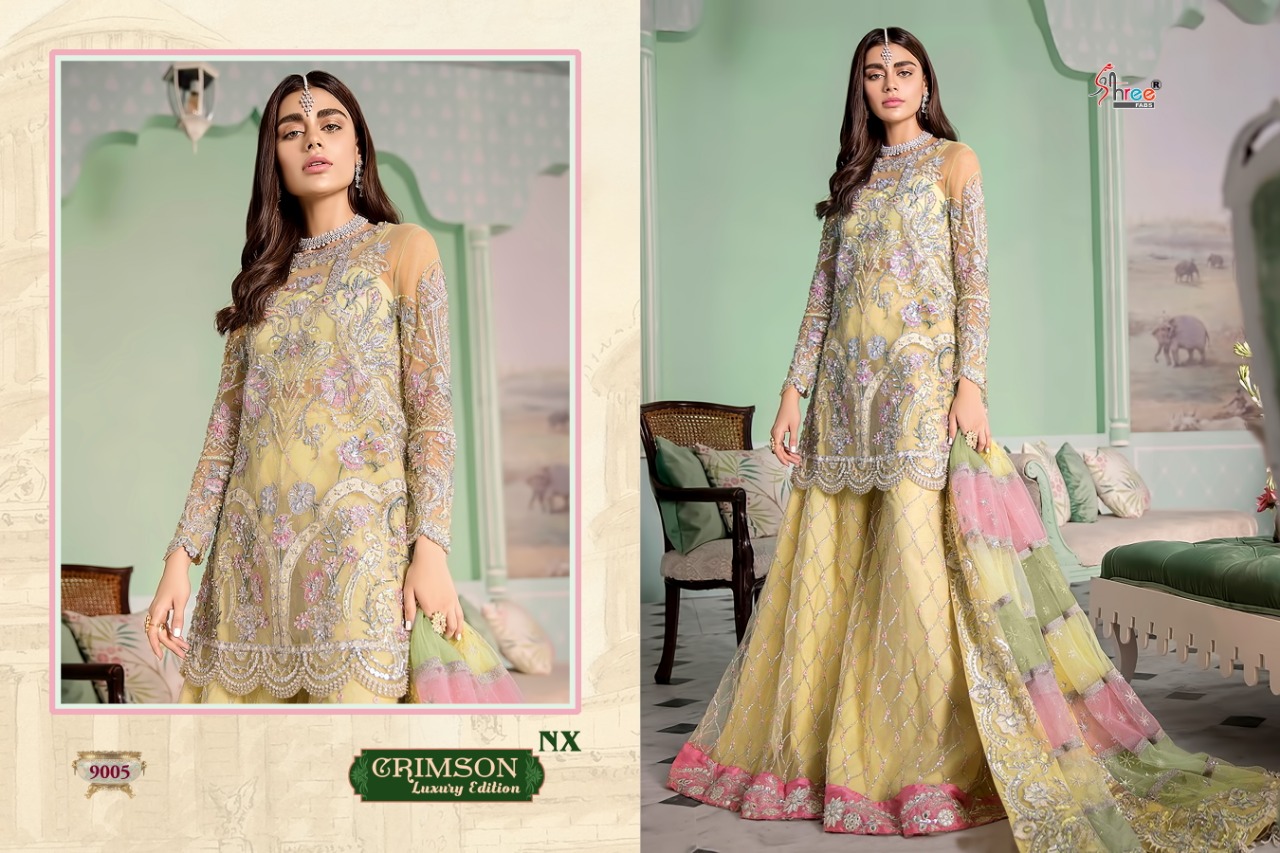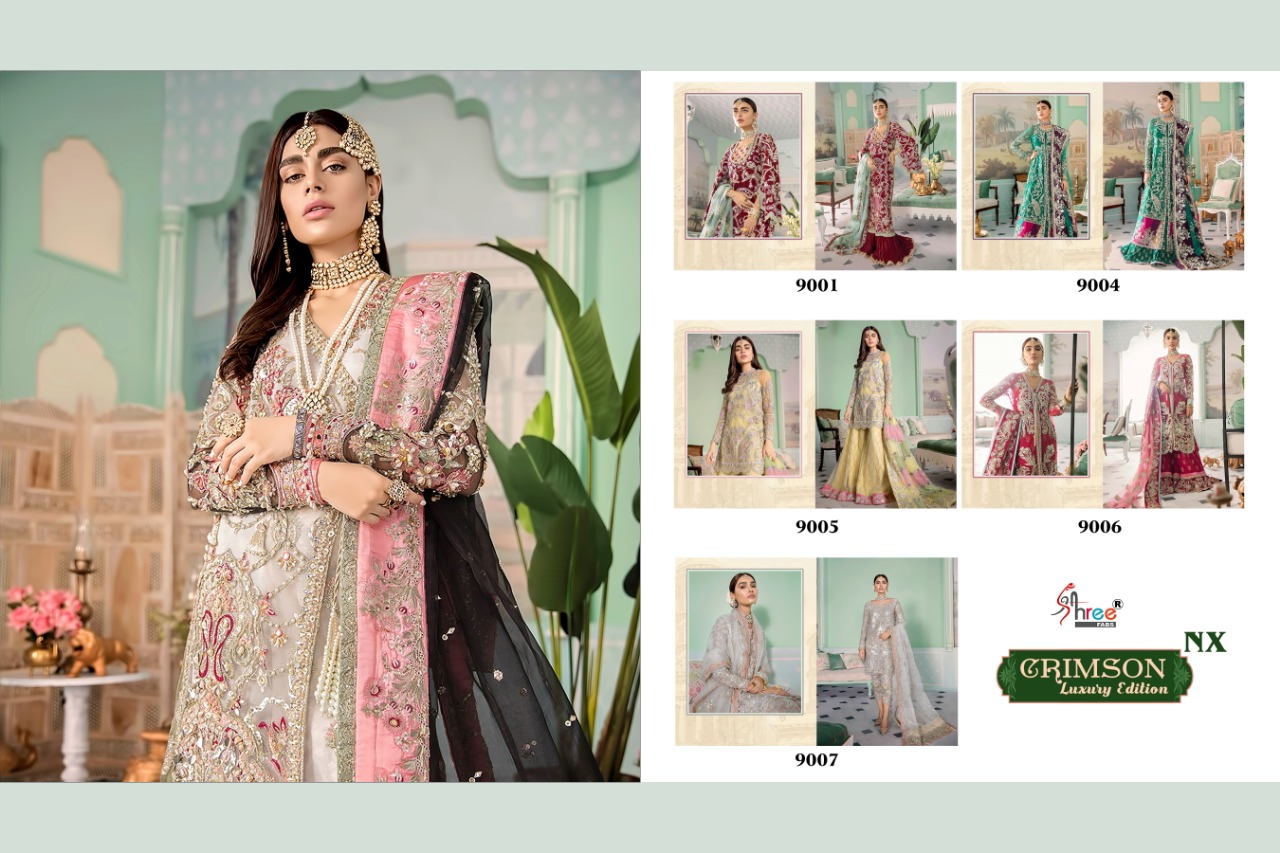 Shree fabs present SUPER hit catlouge CRIMSON LUXURY EDITION NX Top heavy net with heavy embrodery & addition work Bottom inner santoon & fancy fabric Duppta embrodery net Designs 5 Rate 1650 LIMITED STOCK |
