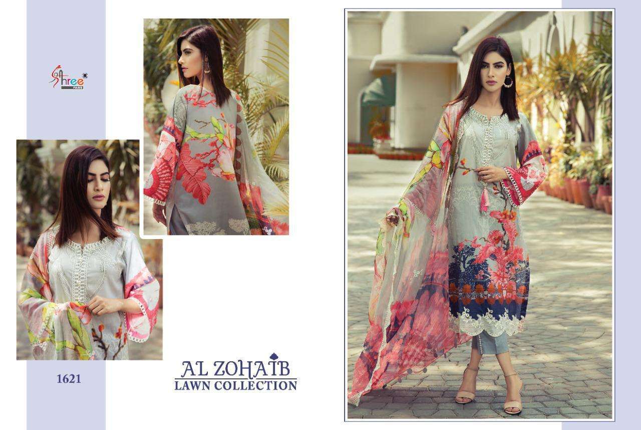 AL ZOHAIB LAWN COLLECTION TOP PURE COTTON PRINT WITH PATCH EMBRODERY BOTTOM SEMILAWN DUPPTA SILVER SIFFON/ COTTON MALMAL RATE 551+ gst SIFFON DUPTTA Design 8 SHREE FABS SURAT |