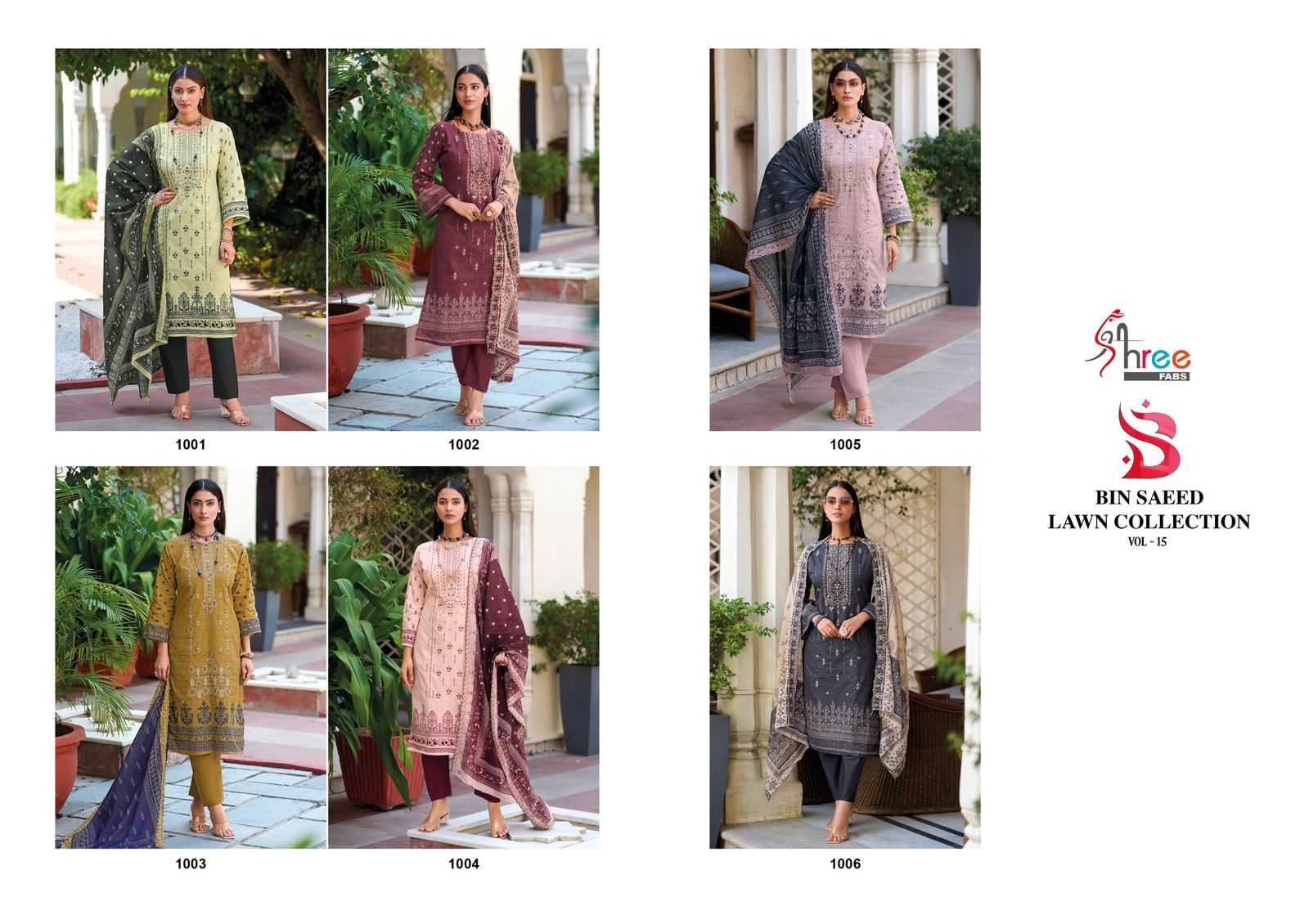 BIN SAEED LAWN COLLECTION VOL-15 TOP PURE COTTON PRINT WITH EXCLUSIVE SELF EMBRODERY BOTTOM SEMILAWN DUPPTA PURE MALMAL PRINT WITH EMBRODERY DESIGNS 6 RATE 999 + GST Shree fabs surat©️ |