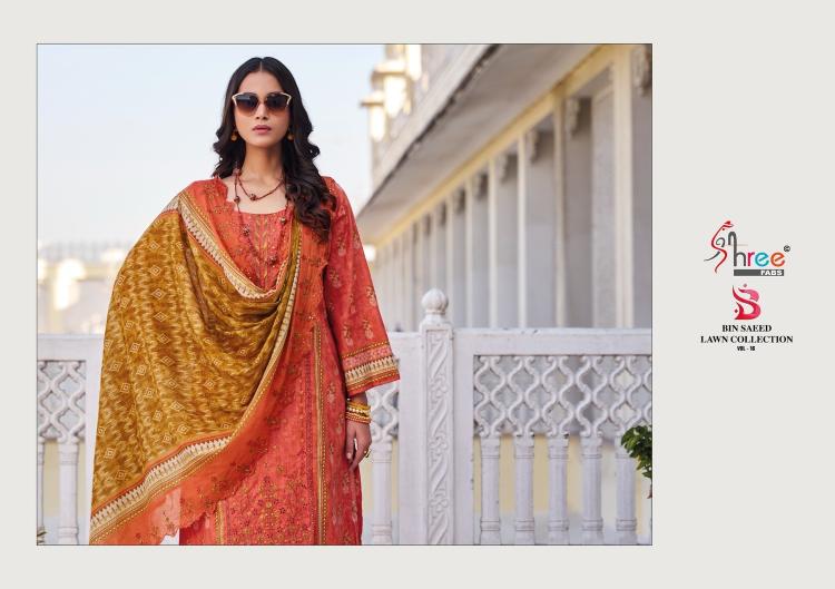 BIN SAEED LAWN COLLECTION VOL-16 TOP PURE COTTON PRINT WITH EXCLUSIVE SELF EMBRODERY BOTTOM SEMILAWN DUPPTA PURE MALMAL PRINT WITH EMBRODERY DESIGNS 6 RATE 999 + GST Shree fabs surat |