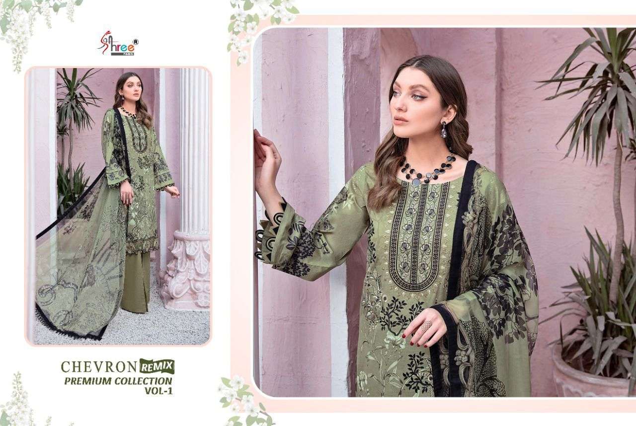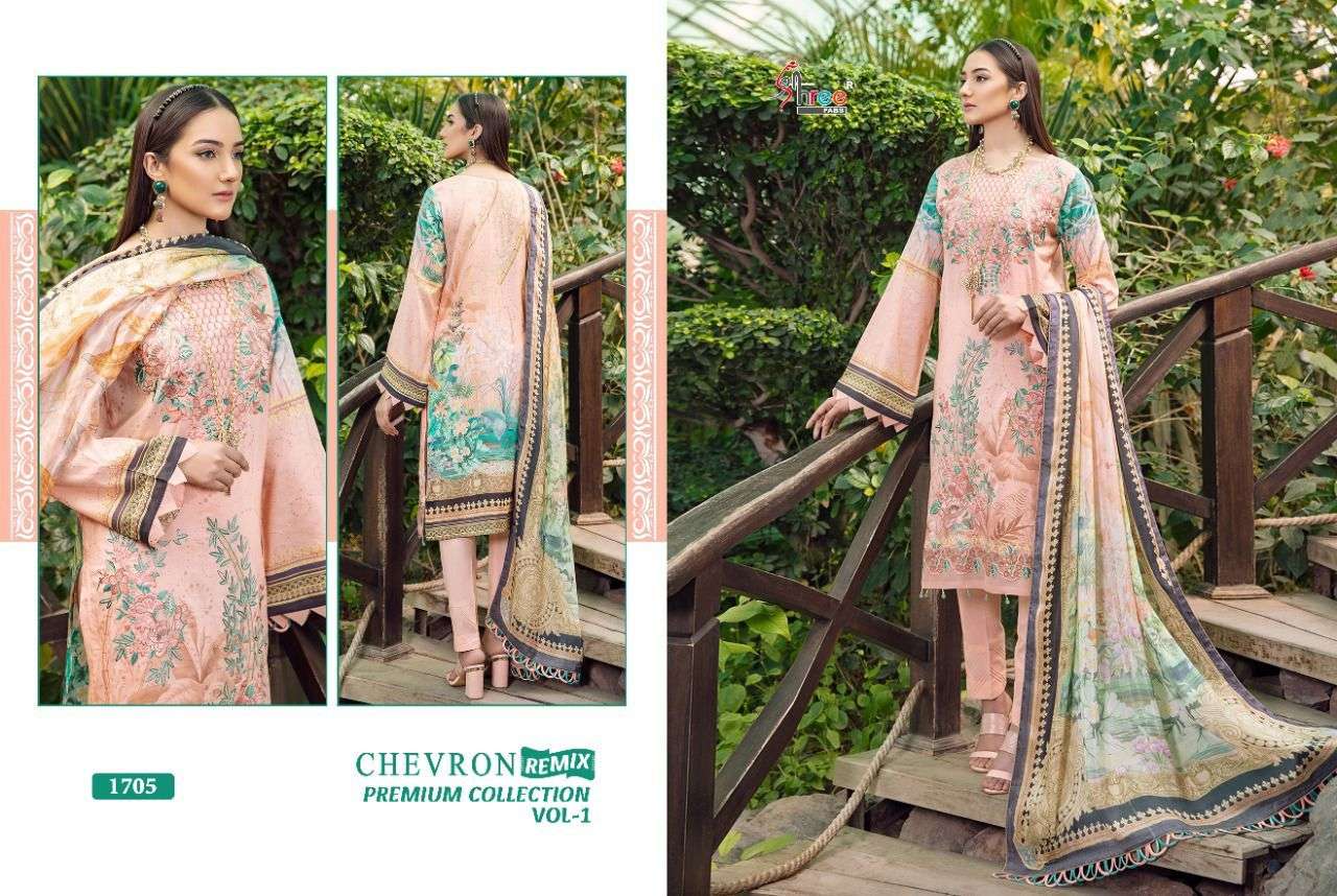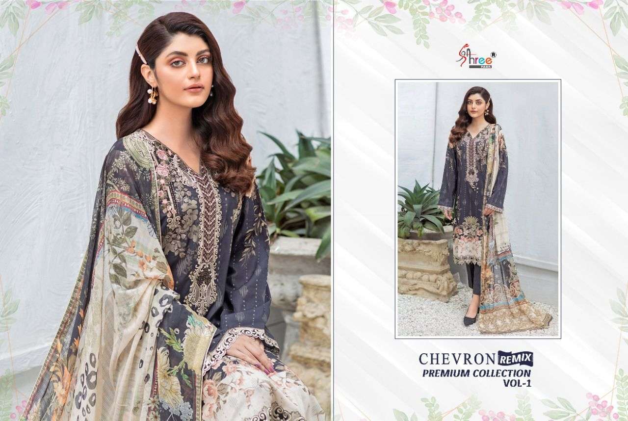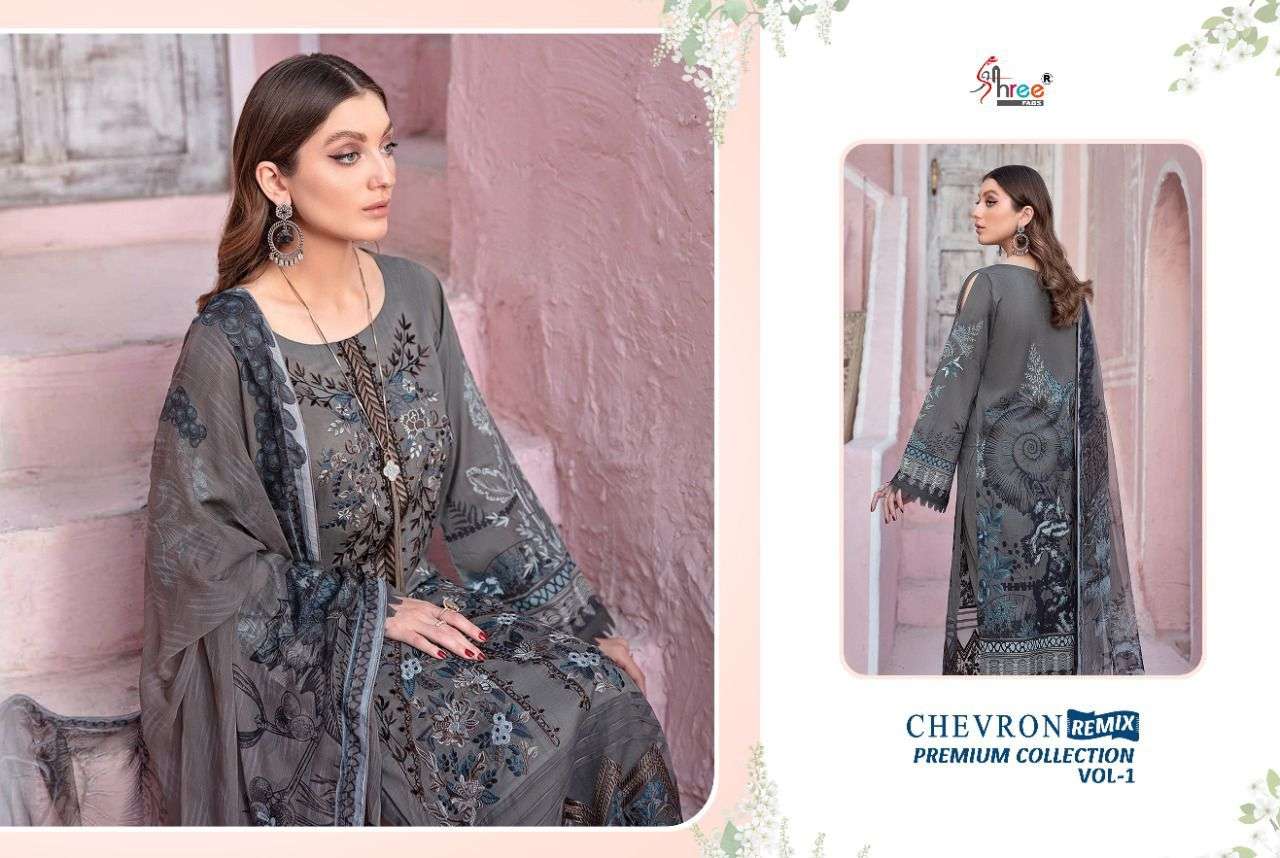 CHEVRON REMIX PREMIUM COLLECTION-01 TOP PURE LAWN COTTON WITH HEAVY SELF EMBROIDERY BOTTOM SEMILAWN DUPPTA SIFFON / COTTON DESIGNS 6 RATE SIFFON 851+gst Shree fabs surat |