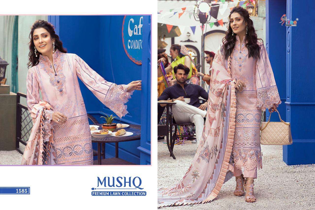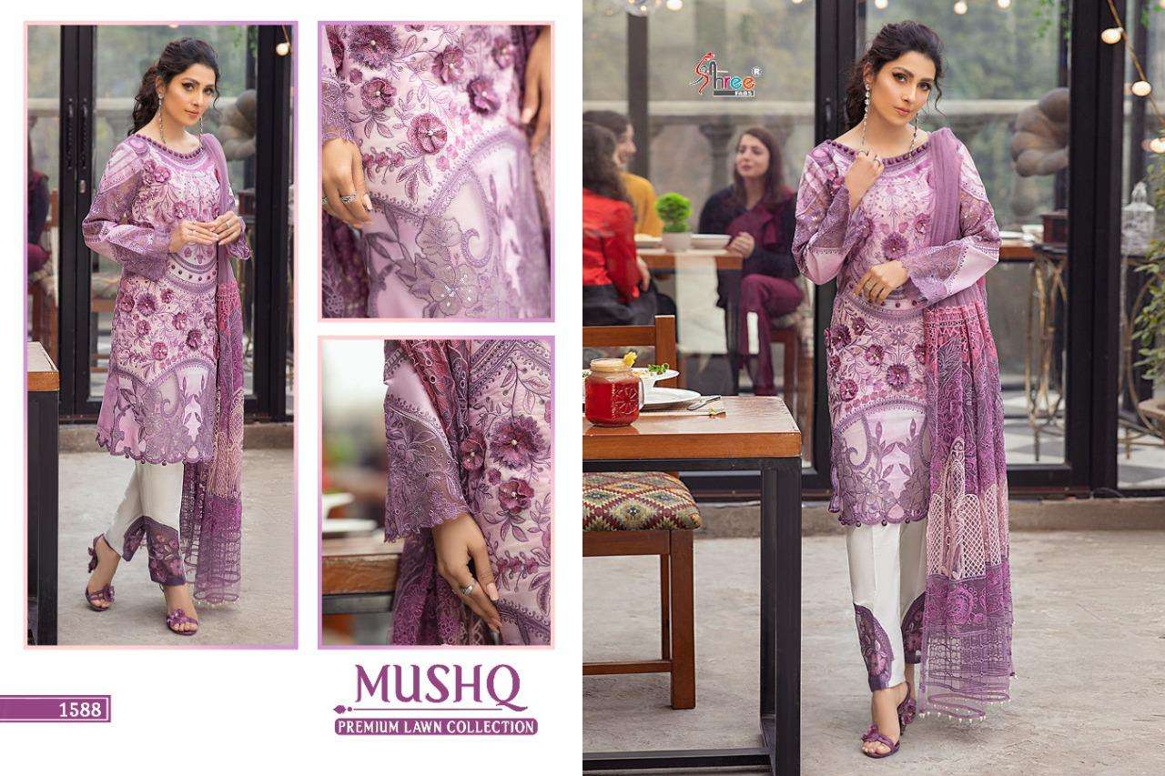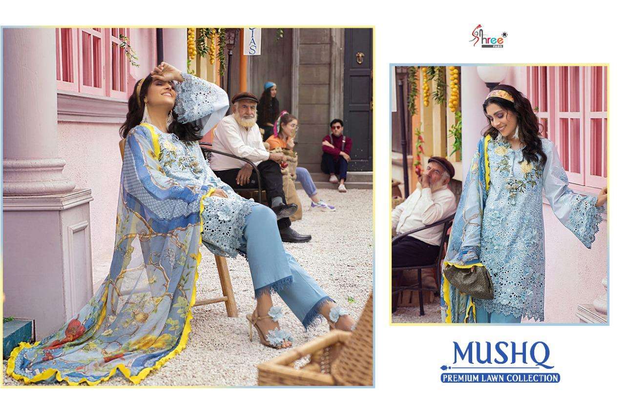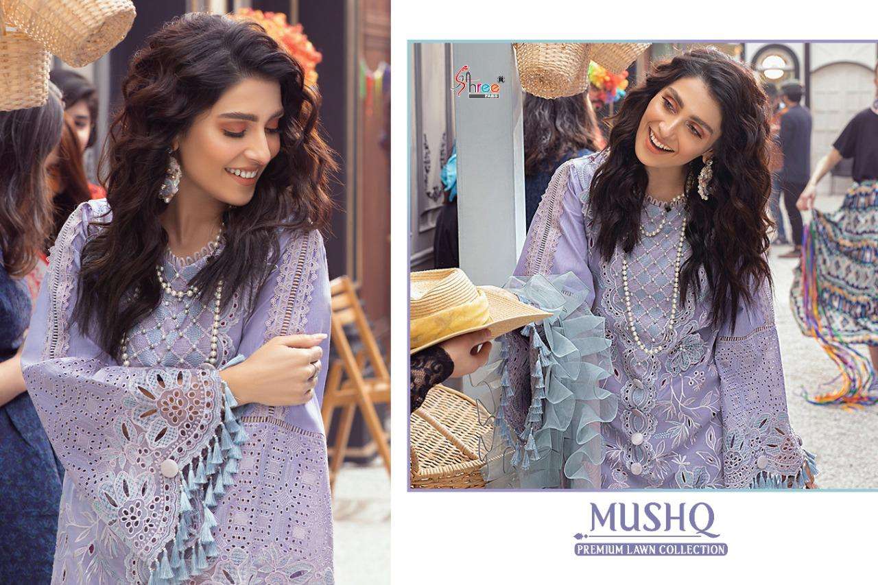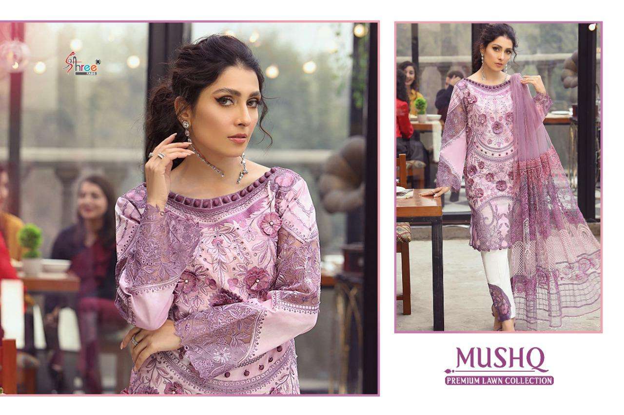 MUSHQ PREMIUM LAWN COLLECTION TOP PURE LAWN WITH EXCLUSIVE SELF EMBRODERY BOTTOM SEMILAWN DUPPTA EMBRODERD NET & TABY SILK RATE 1151+gst SHREE FABS SURAT |