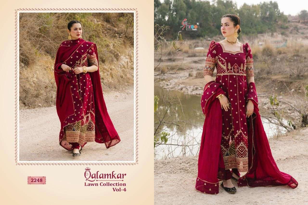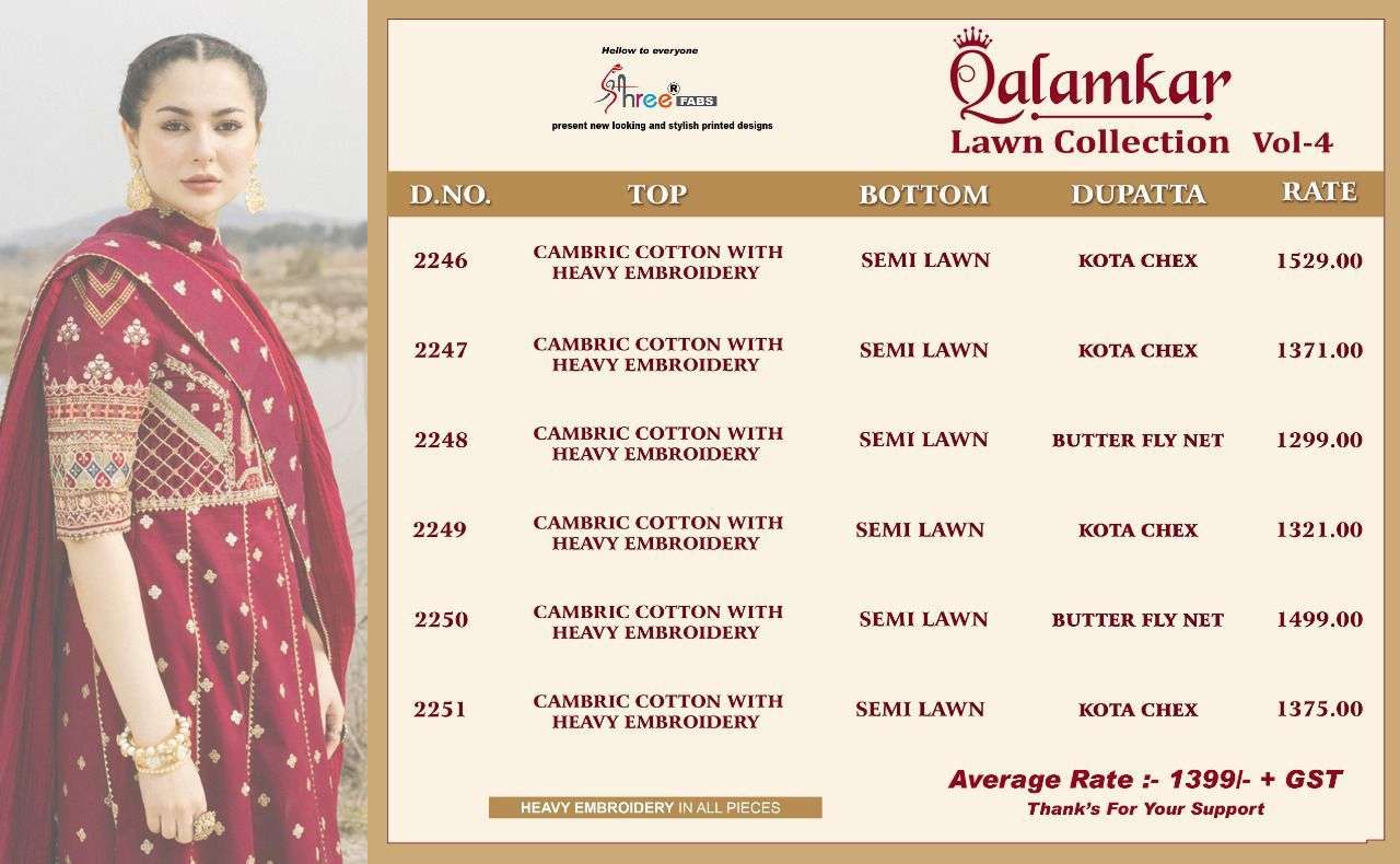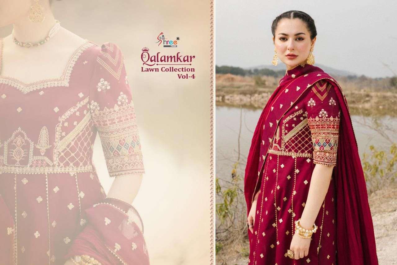 QALAMKAR LAWN COLLECTION VOL-04 TOP PURE LAWN COTTON WITH HEAVY EXCLUSIVE SELF EMBRODERY BOTTOM SEMILAWN DUPPTA NET / KOTA CHEKS EMBRODERED RATE 1399+ gst Shree fabs surat ®️ |