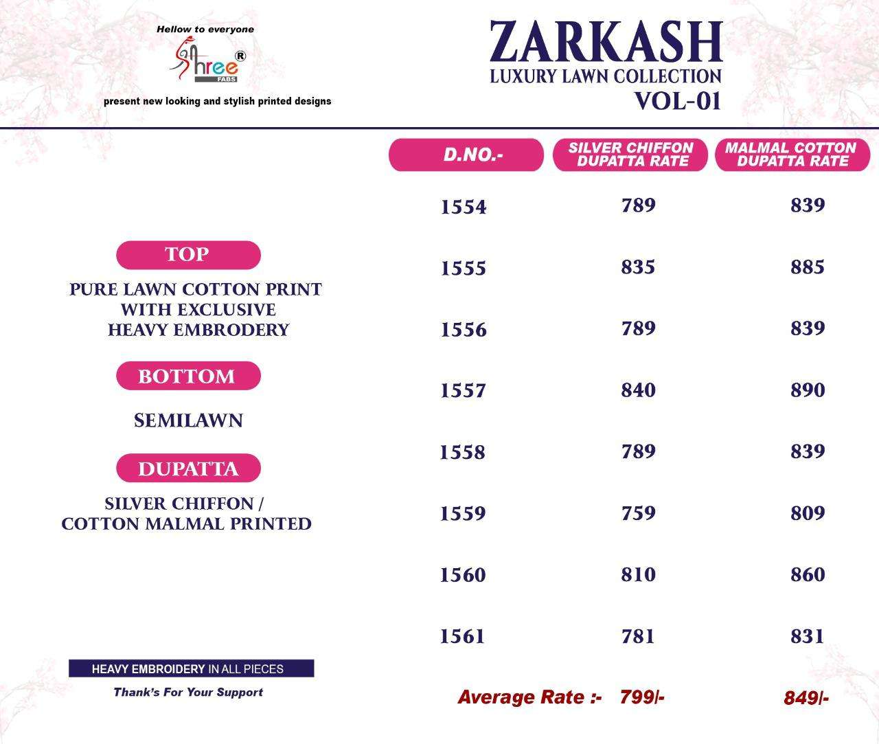 ZARKASH LUXURY LAWN COLLECTION VOL-01 TOP PURE LAWN COTTON PRINT WITH EXCLUSIVE EMBRODERY BOTTOM SEMILAWN DUPPTA SIFFON/ COTTON MALMAL PRINT DES 8 RATE 799+ GST SIFFON DUPPTA SHREE FABS SURAT |