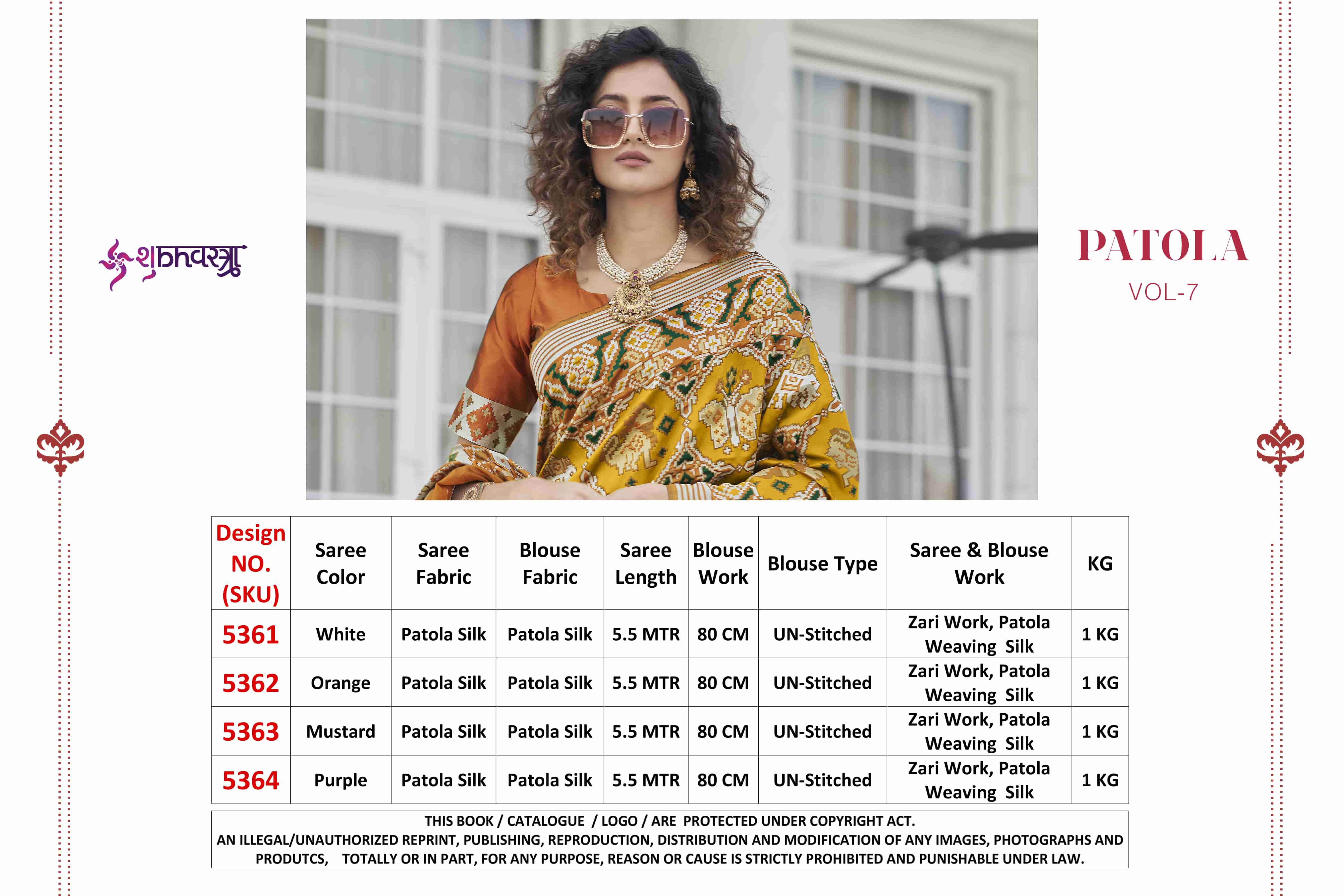🌺 *SHUBHVASTRA* 🌺 👗 *New Exclusive Patola Silk Saree Collection* 👗 💰 *PATOLA VOL. 7 - RATE LIST* 💰 *5361: 1600/-* *Saree Length:* 5.5 MTR. Real Pic Available. 👗 ⚠️ *NOTE::* ⚠️ |