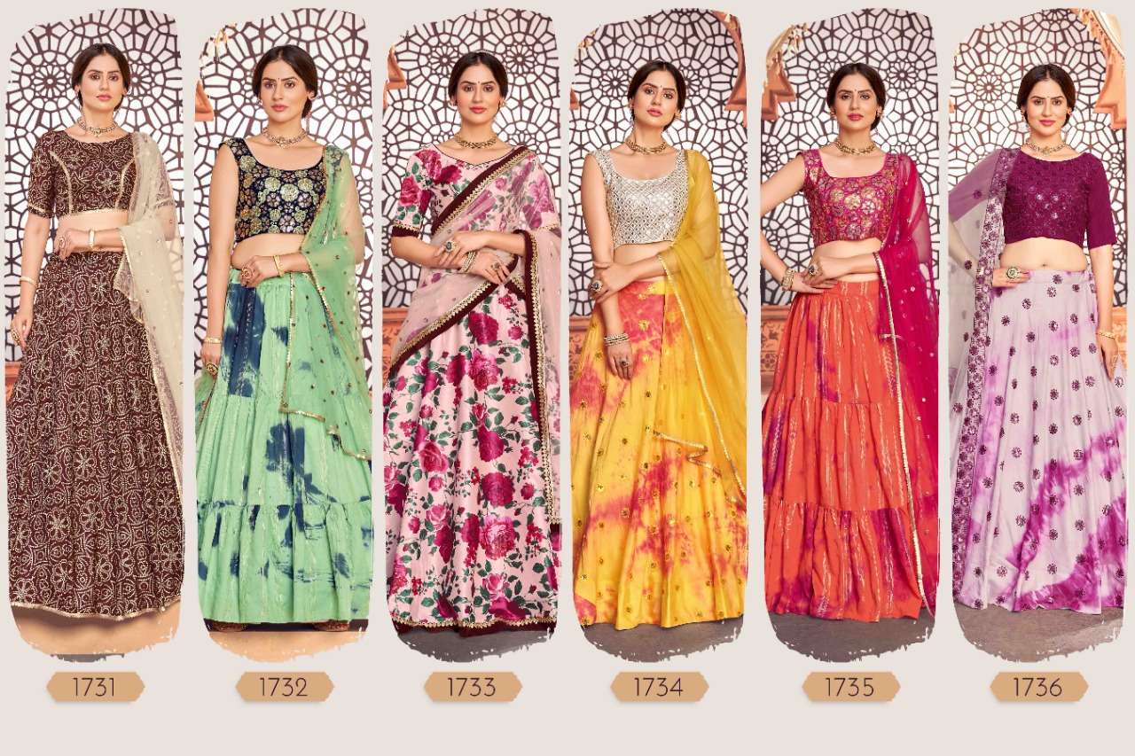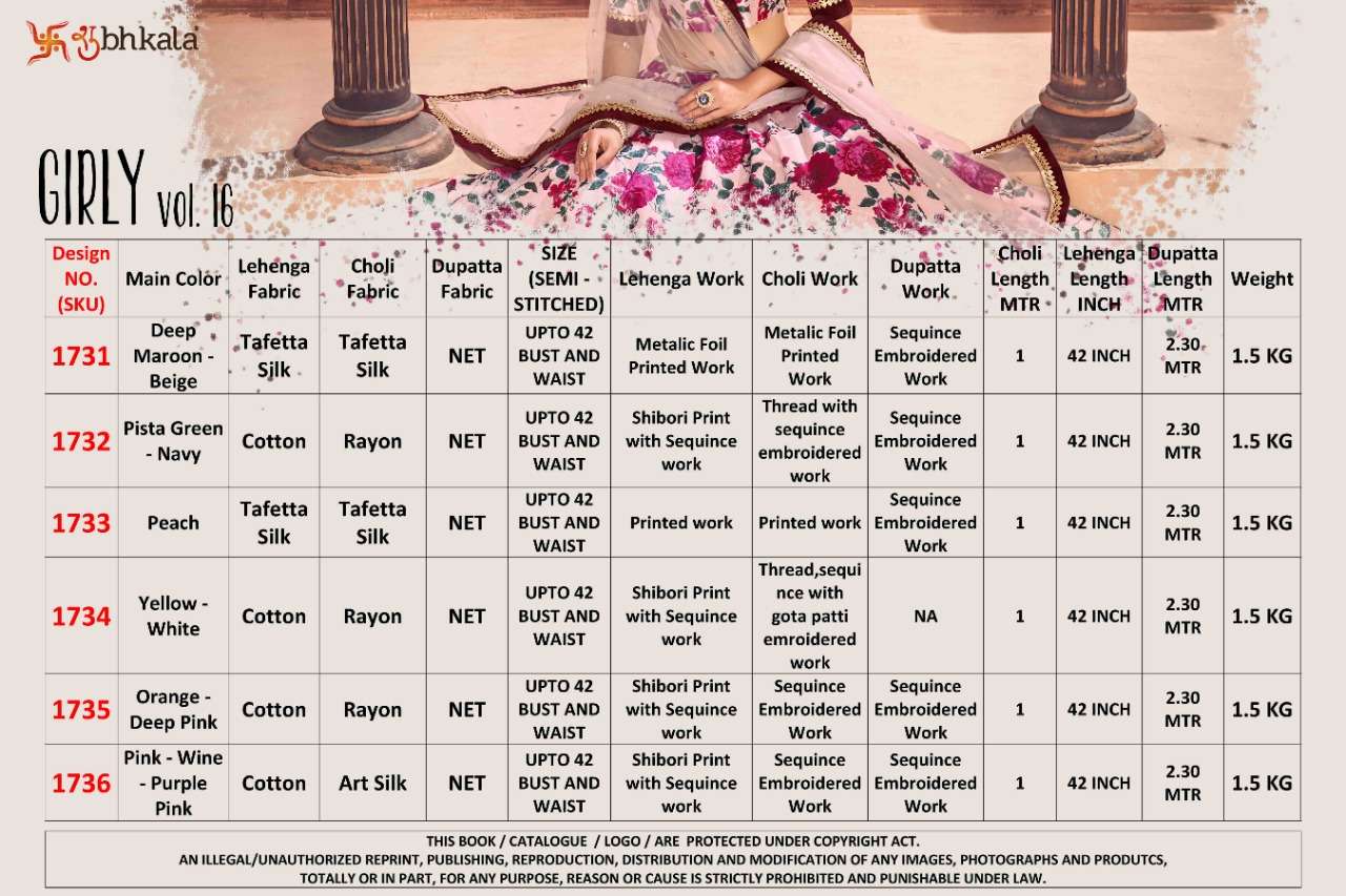 SHUBHKALA Â New Exclusive Sequance with Thread Embroidered Semi Stitched Lehenga Choli Collection GIRLY VOL. 16 - RATE LIST 1731: Â 1500/- 1732: Â 2000/- 1733: Â 2000/- 1734: Â 2000/- 1735: Â 2000/- 1736: Â 2000/- Choli Length: 1 MTR. Lehenga Length: 42 INCH. Dupatta Length: 2.30 MTR. Weight: 1.5 KG. Real Pic Available. Assured Quality Product. Authentic Original Product. Ready to Ship World Wide. MADE IN INDIA Wash & Care Instructions. - Do not Bleach. - Cool Iron. - Do Not Tumble Dry. - Delicate Dry Clean. - Do Not Wring. - Professional Wash with Water (Delicate). - Hang For Drying in the Shade. Â NOTE:: THIS BOOK / CATALOGS Â / LOGO / ARE Â PROTECTED UNDER COPYRIGHT ACT. AN ILLEGA/UNAUTHORIZED REPRINT, PUBLISHING, REPRODUCTION, DISTRIBUTION AND MODIFICATION OF ANY IMAGES, PHOTOGRAPHS AND PRODUCTS, Â TOTALLY OR IN PART, FOR ANY PURPOSE, REASON OR CAUSE IS STRICTLY PROHIBITED AND PUNISHABLE UNDER LAW. |