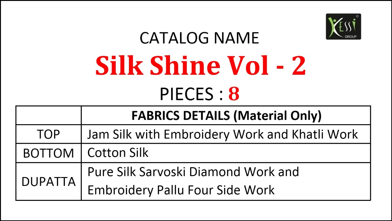Kessi Fabrics Pvt. Ltd. has launched Catalog name : Silk Shine Vol - 2 Fabric Details ▪Top:- Jam Silk with Embroidery Work and Khatli Work ▪Bottom:- Cotton Silk ▪Dupatta:- Pure Silk Sarvoski Diamond Work and Embroidery Pallu Four Side Work ▪Total Design:- 8 Rate -: 899/- |
