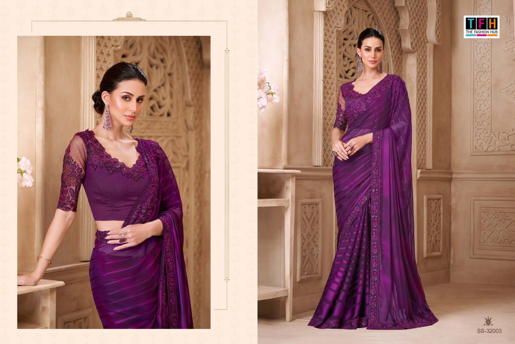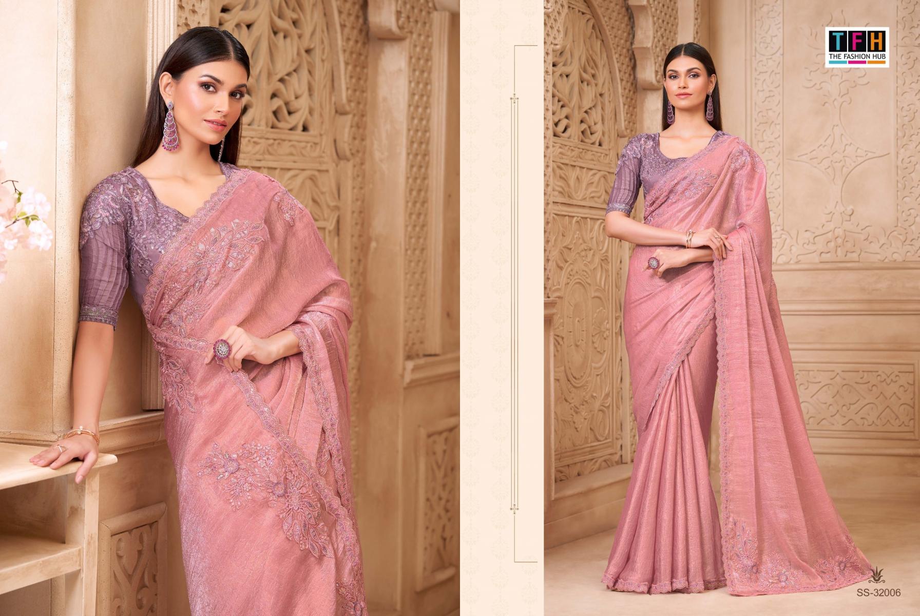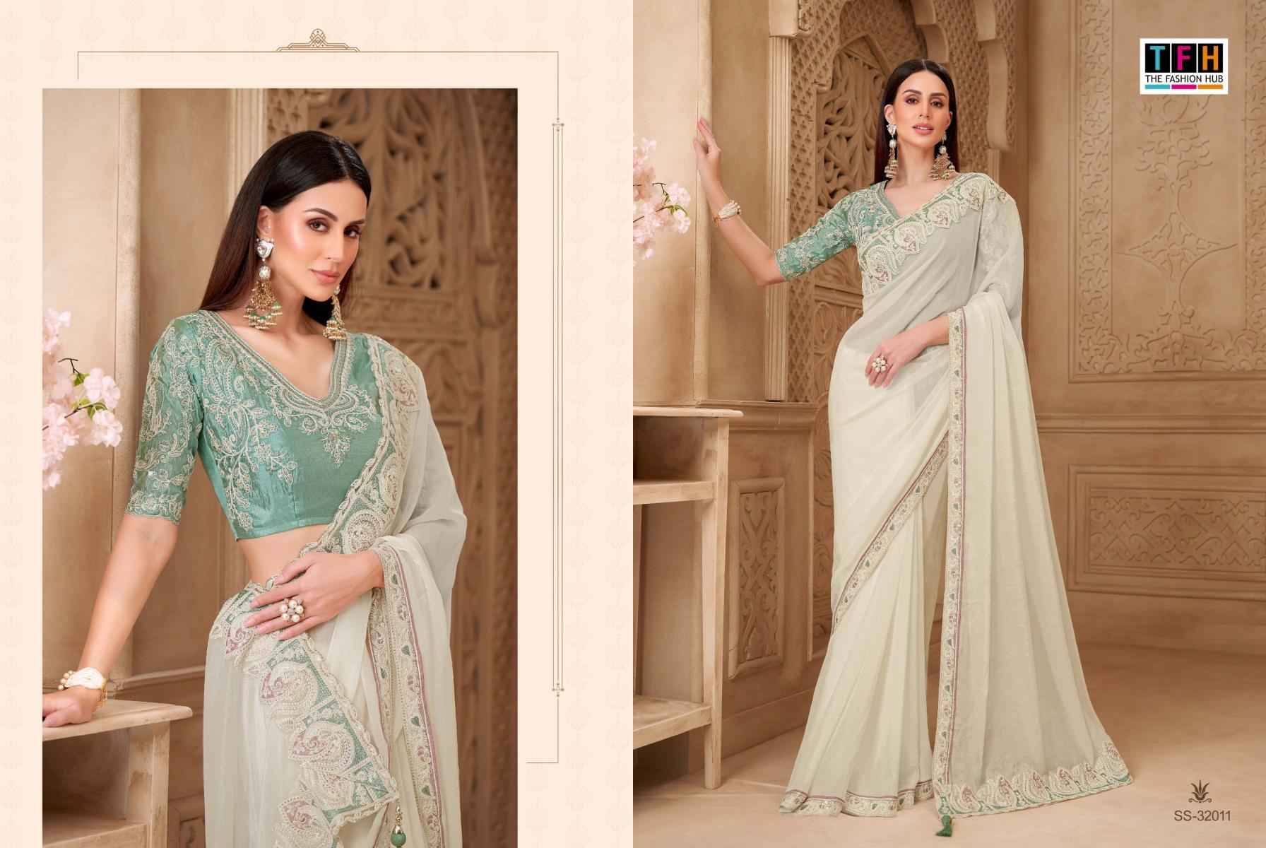 Step into the spotlight and make a statement in this exquisite party wear saree. From the luxurious fabric to the intricate embellishments, every detail is designed to elevate your elegance and grace. Brand Name : Tfh Catalogue Name: Silver Screen -22 (32000 Series) Series : 32001 to 32018 Price : List Attached+5%GST Fabric : Fabric List Attached 5% Gst Occasion : Festival wear, Carnival Wear, Party Wear |