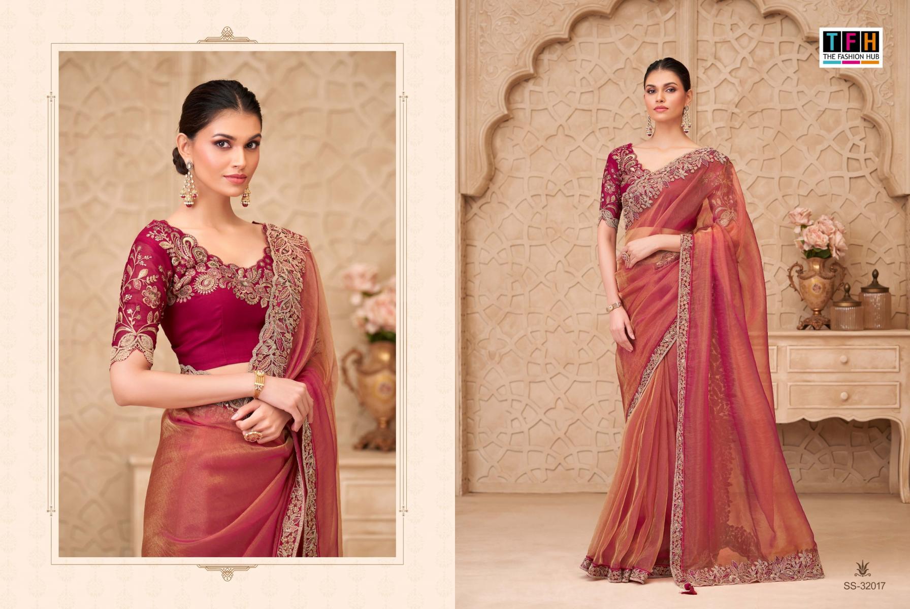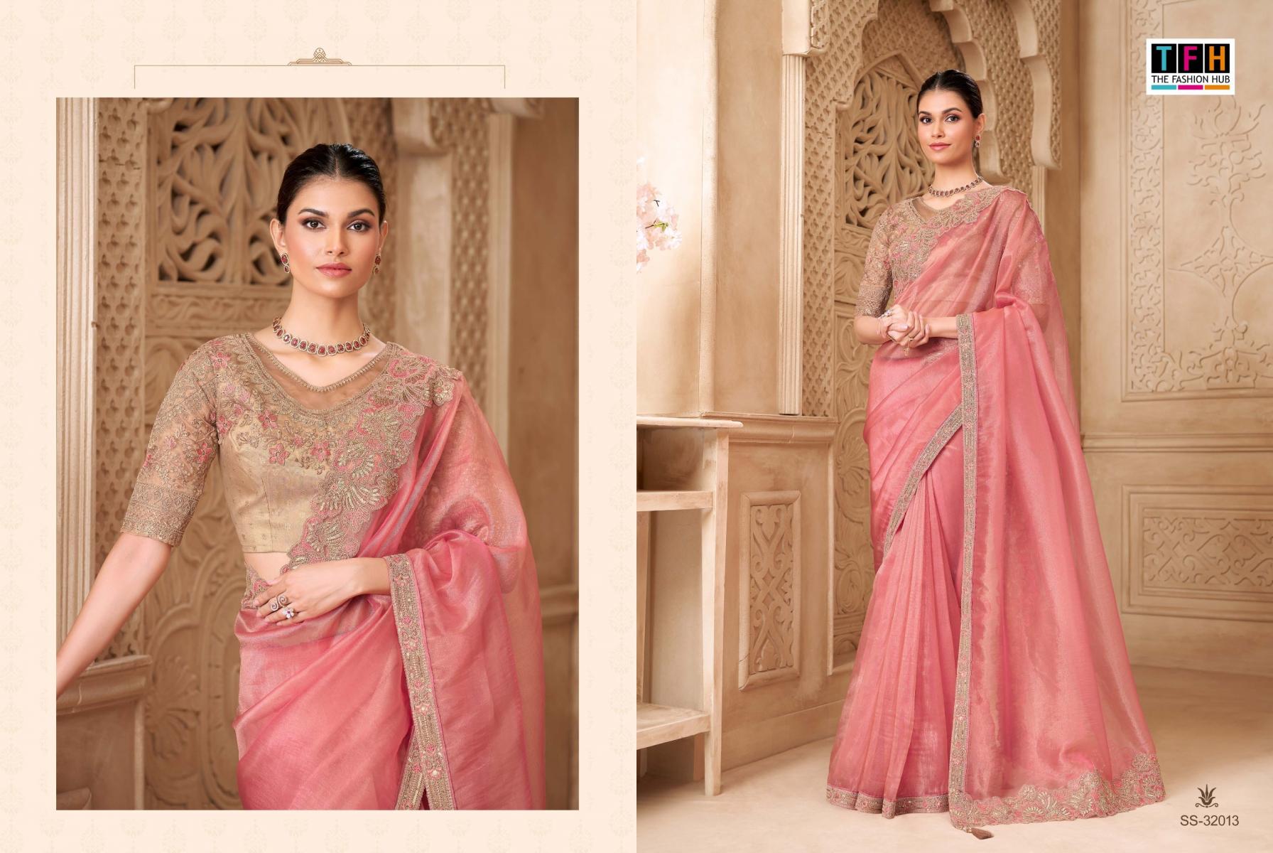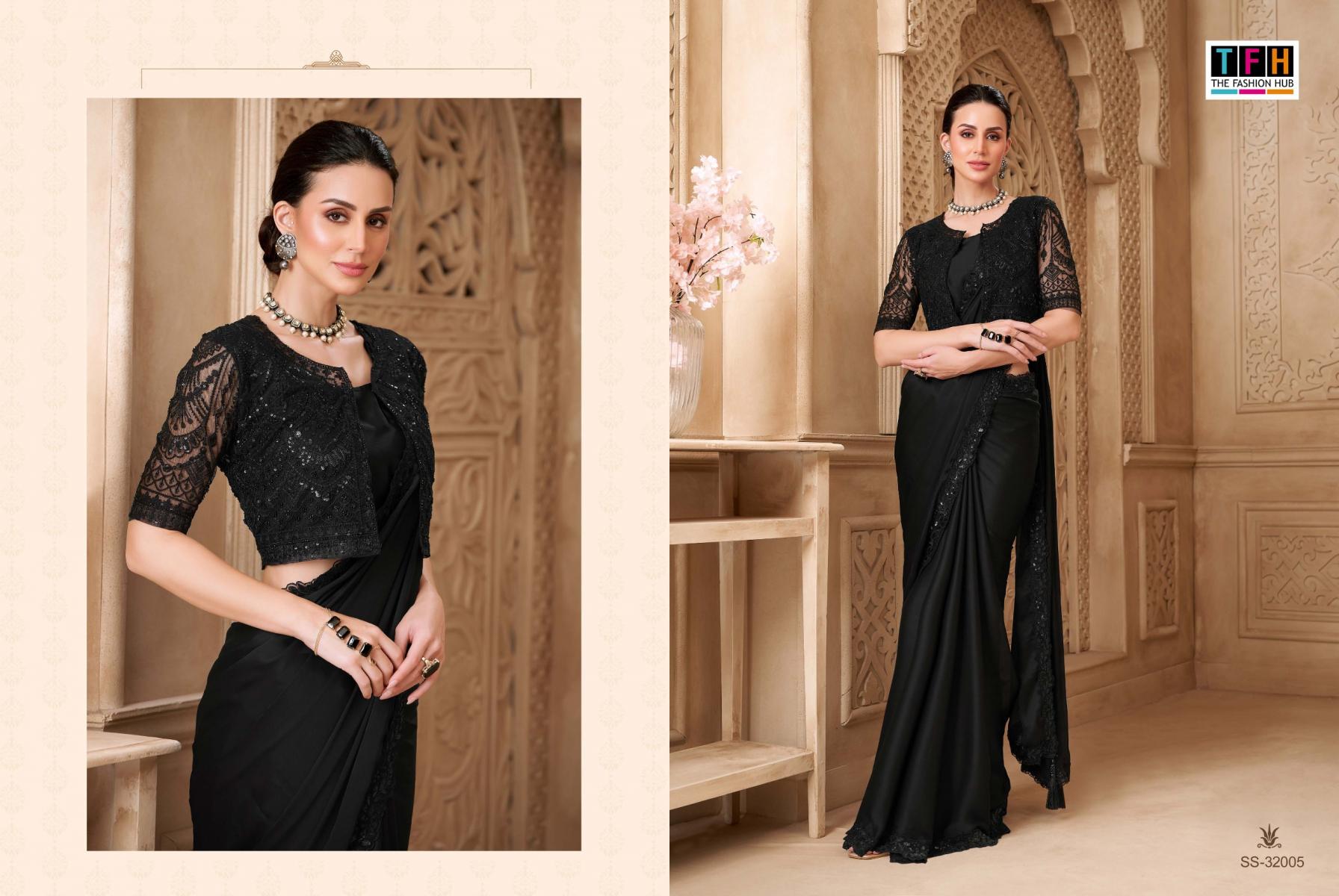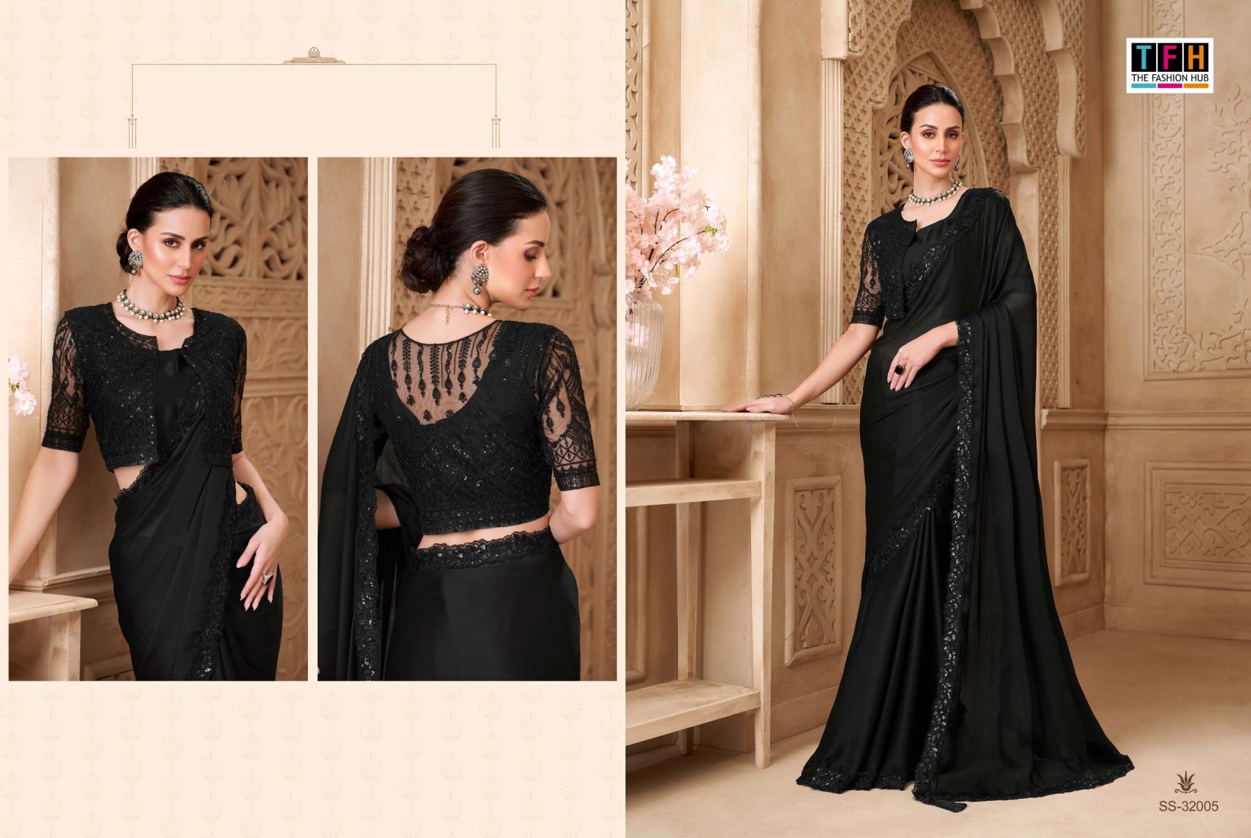 Step into the spotlight and make a statement in this exquisite party wear saree. From the luxurious fabric to the intricate embellishments, every detail is designed to elevate your elegance and grace. Brand Name : Tfh Catalogue Name: Silver Screen -22 (32000 Series) Series : 32001 to 32018 Price : List Attached+5%GST Fabric : Fabric List Attached 5% Gst Occasion : Festival wear, Carnival Wear, Party Wear |