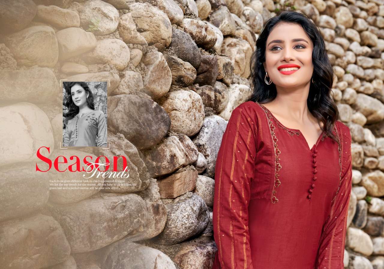 Brand name- SELESTA Catalog- SIMRAN Top fabric - *HEAVY CHANDERI ( weaving) WITH COTTON INNER AND Â WITH HANDWROK * Size- M Â L Â XL XXL Â Â Â Â Â 38 Â 40 42 44 Rate - 565/- Gst 5% 5pcs |