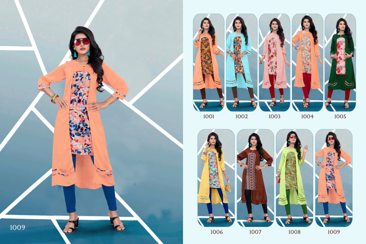 âÂÂSINZARAâ BY âÂÂRACHNAâ Presents New Designer Kurtis Collection "GLORY" No of pcs: 9 Fabric:- Satin Work: Digital Printed Size: âÂÂM-38â âÂÂL-40â âÂÂXL-42â âÂÂXXL-44â Price :- 545/-Per pcs |
