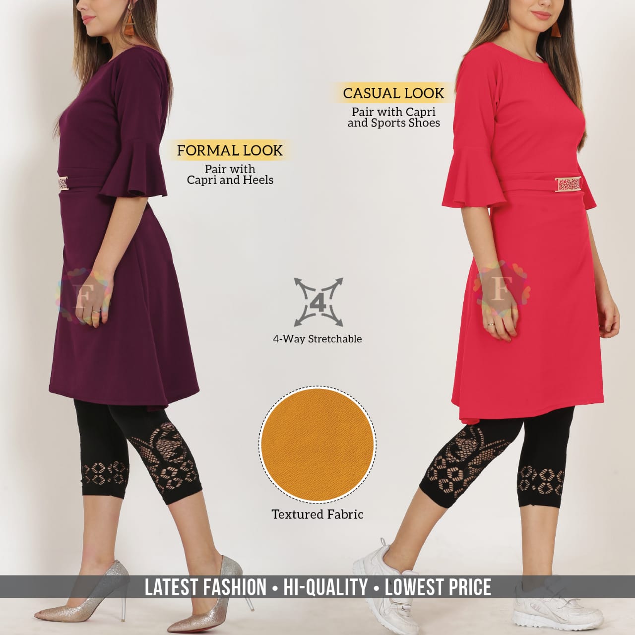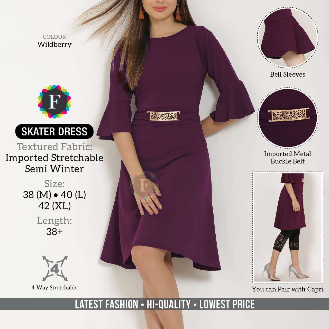 Fabric: Textured Imported Stretchable USP1: Bell Sleeves USP2: Metal Buckle Belt Size: 38 (M) • 40 (L) • 42 (XL) Length: 38+ inchAvailable in 8 colours wholesale price ₹450/- GST 5% EXTRA Happy Selling |