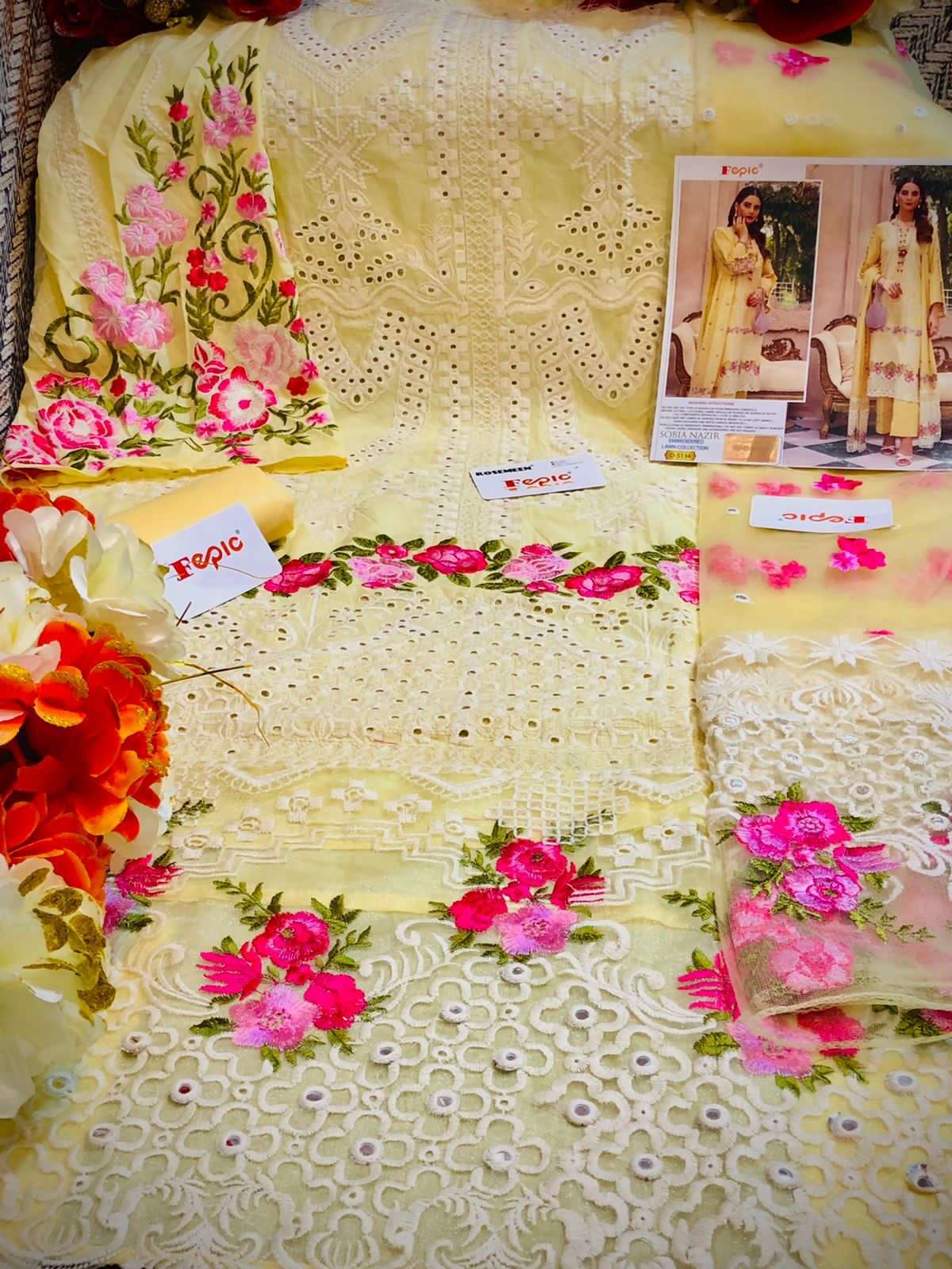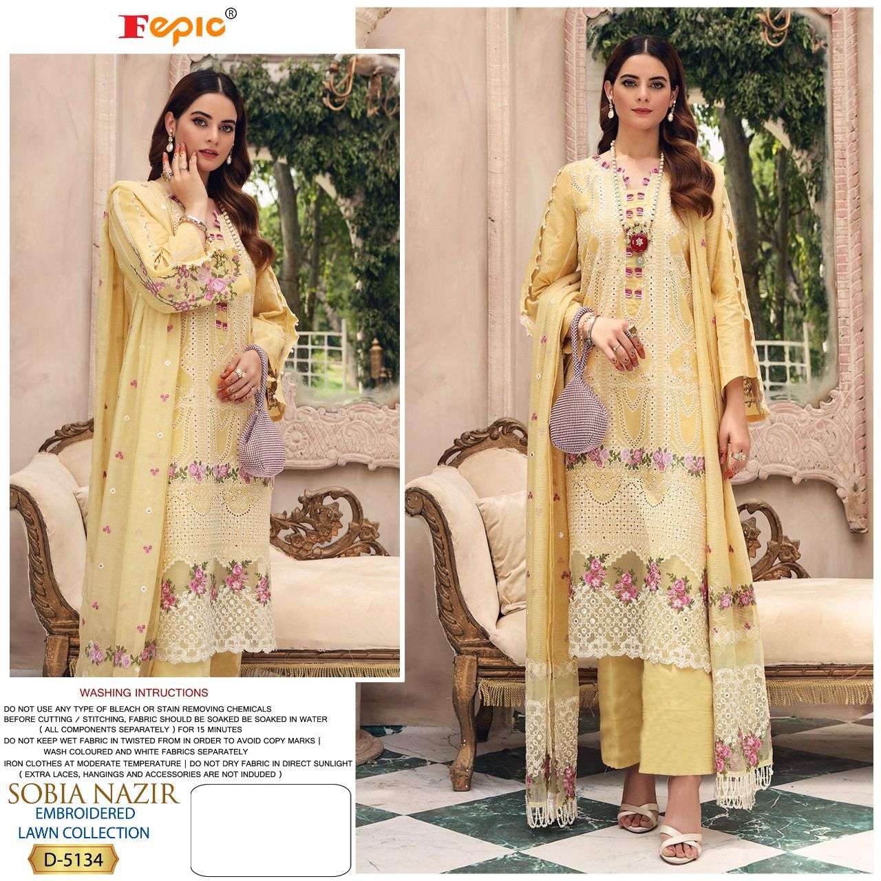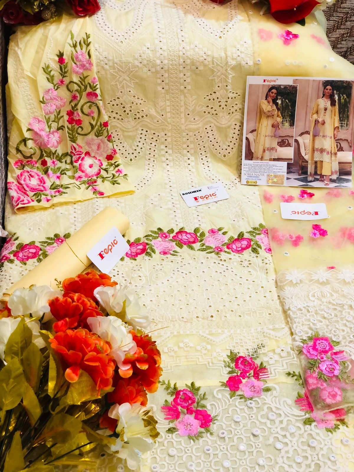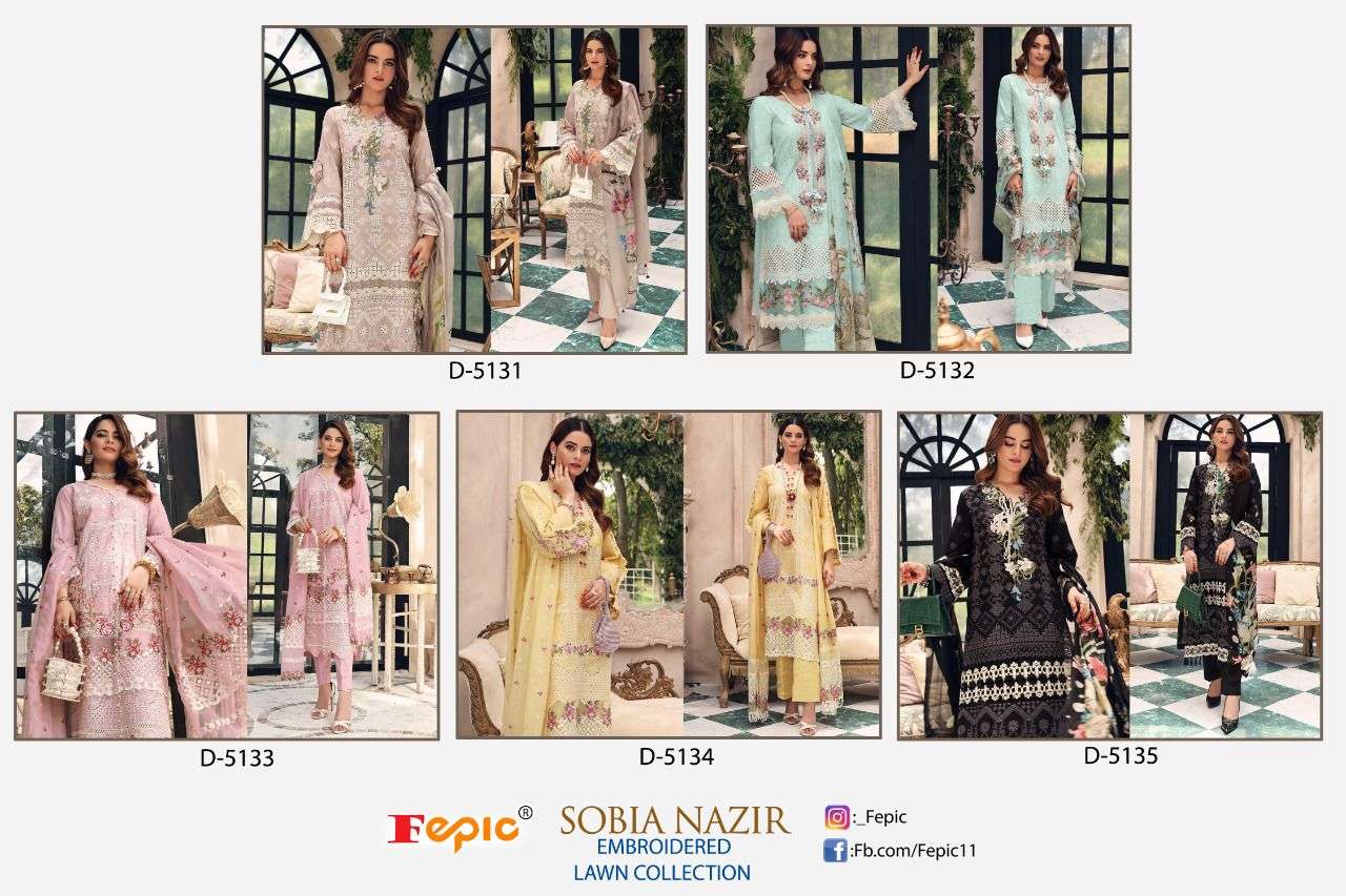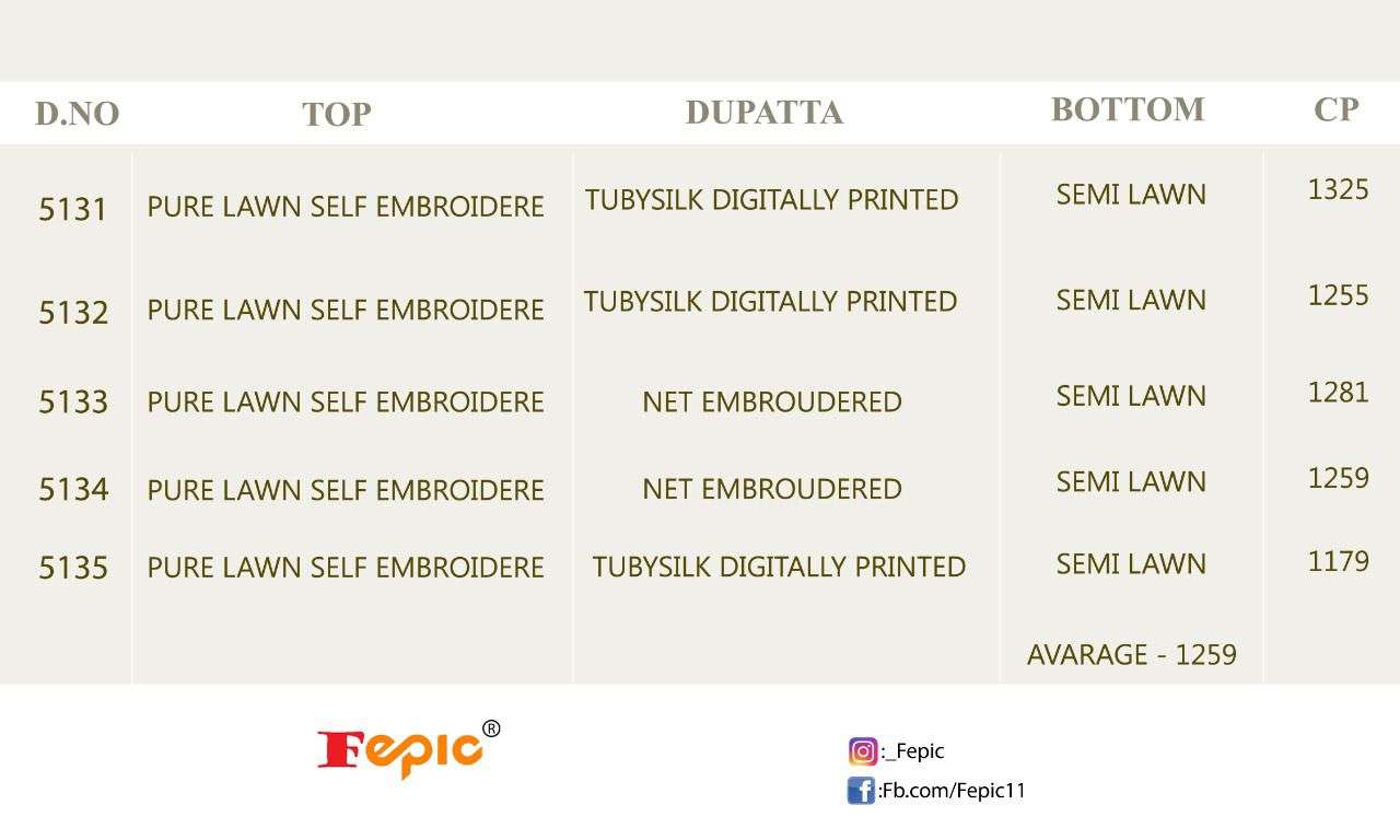 FEPIC Catalogue Name:-  *ROSEMEEN SOBIA NAZRIR * ( EMBROIDERED LAWN COLLECTION )    Fabric details Top : PURE COTTON EMBROIDERED Bottom  :SEMI LAWN â Dupatta : TUBBY SILK DIGITALY PRINTED / NET EMBROIDERED ©Company average Rate :1259/- Dispatch _STARTS  SATURDAY _ |