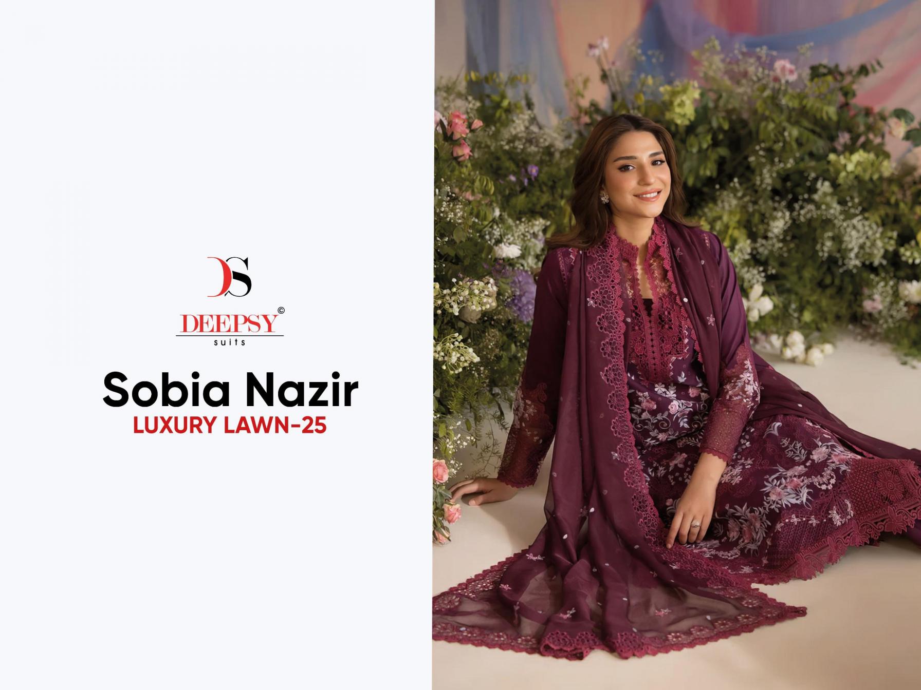 Sobia Nazir Lawn 25 by DEEPSY SUITS Top - Pure cotton with heavy self embroidery attached emb patches Bot - cotton solid / 2 des heavy plazzo style work Dup - Kota with heavy four side embroidery (Fully finished dup ) Pcs: 6 *Rate - 1299+Gst Splendid Quality With Digitally Printed Fabric Quilted Fabric Used For best quality results