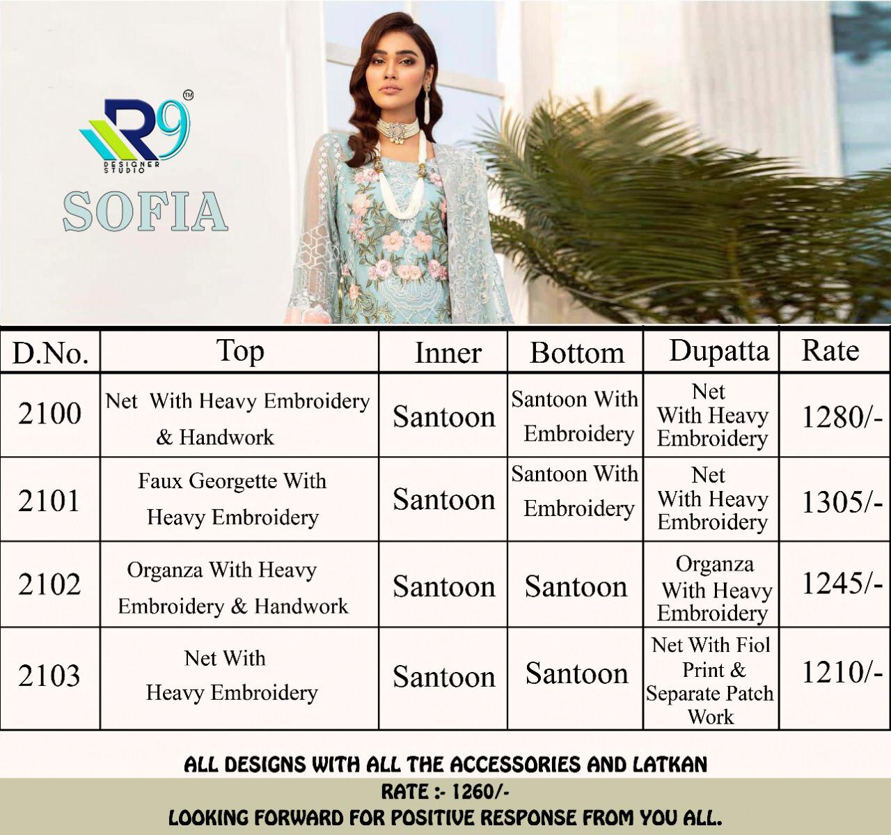 âÂÂR9â brand presents our new catalog new HIT colours & pattern CatalogâÂÂâÂÂâÂÂ- SOFIA fabricsâÂÂâ Top-faux georgette,heavy net,organza with heavy embroidery & handwork Inner- santoon Bottom-santoon santoon with embroidery Dupatta- soft net with embroidery Organza with embroidery Net with foil print & seperate embroidery patch work RateâÂÂâÂÂâÂÂ-1260/- desâÂÂâÂÂâÂÂâÂÂ-4 pcs only Dispatchingâ SATURDAY Note:-All design with all the accessories,pattern and handwork |