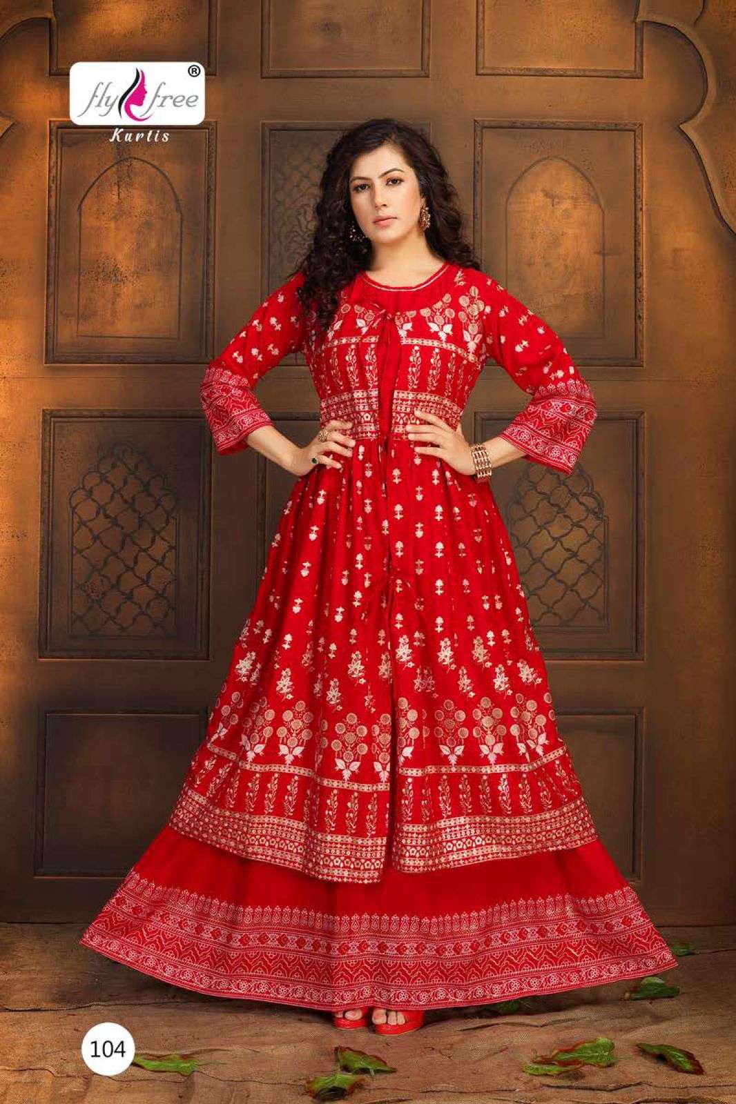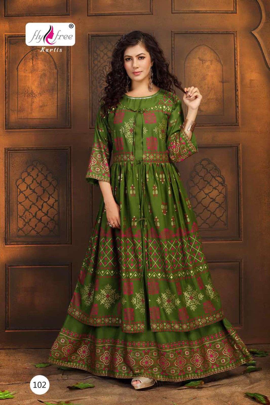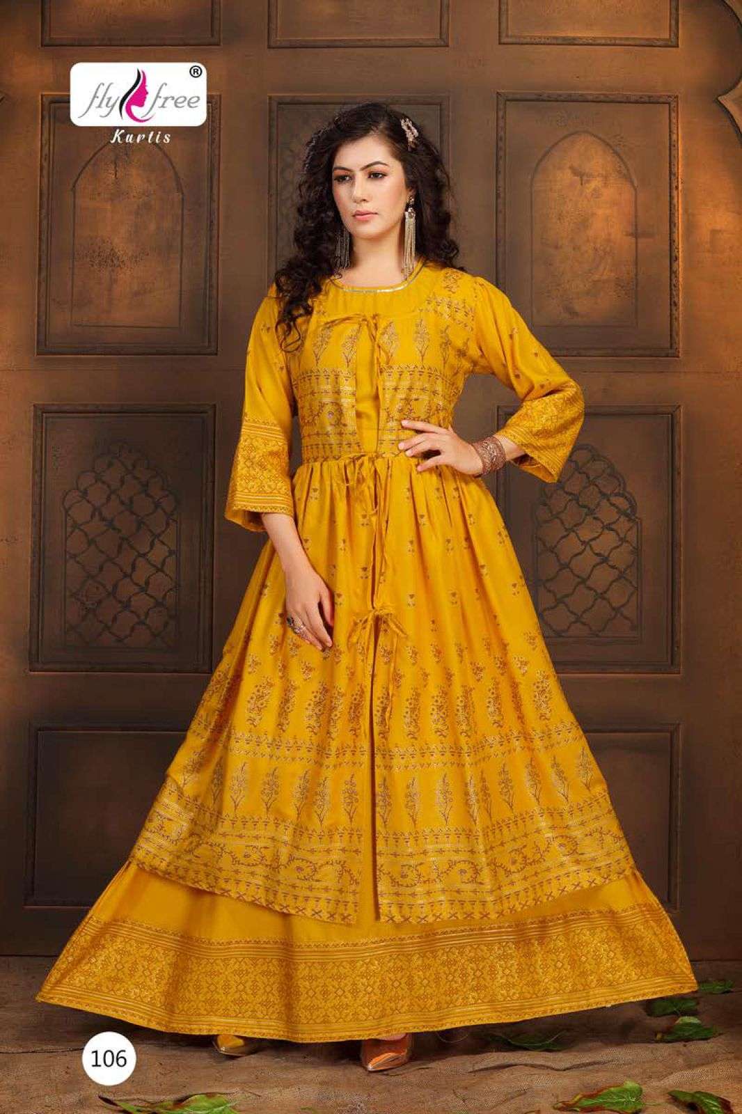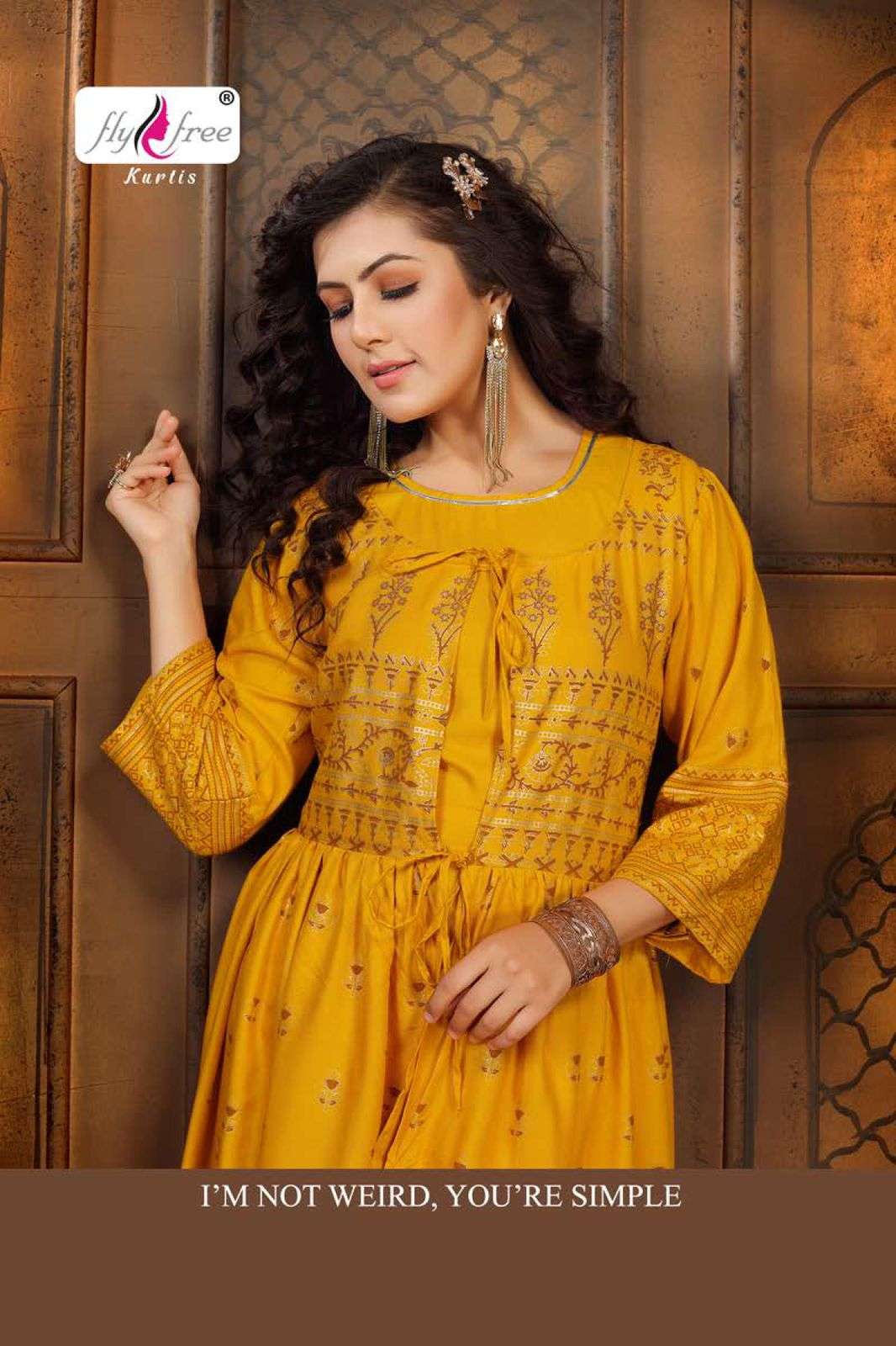 SOLAR BY FLY FREE HEAVY RAYON GOLD PRINT WITH JACKET KURTI CATALOG