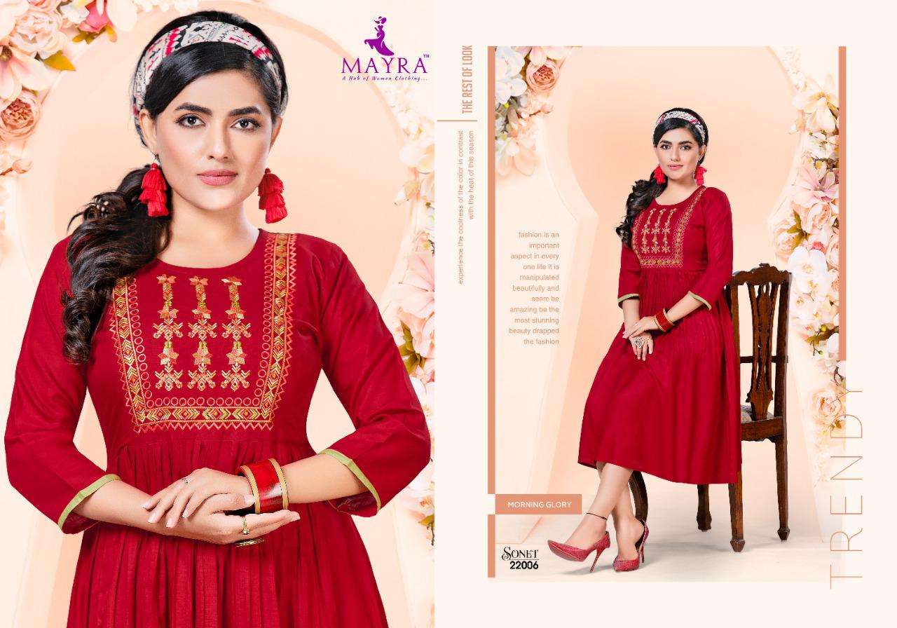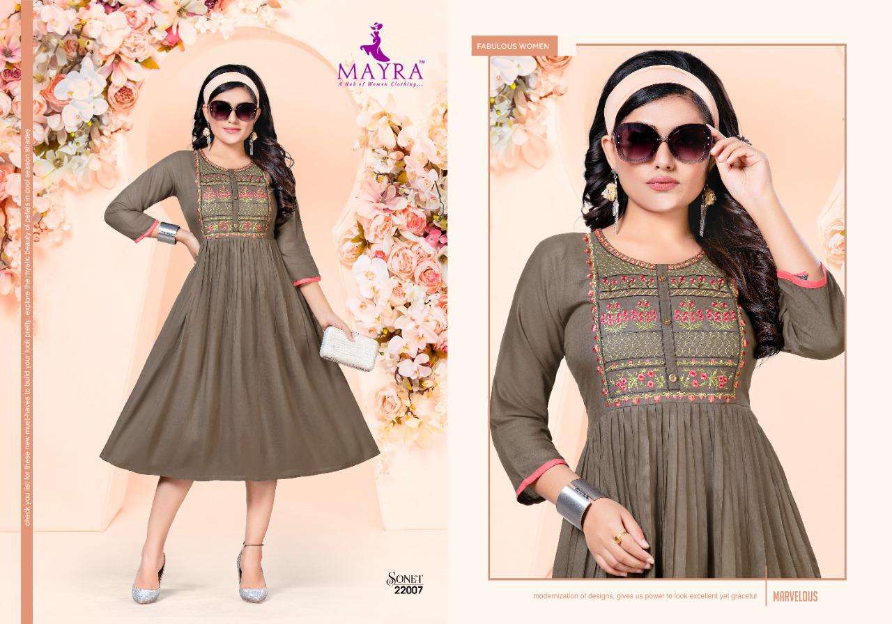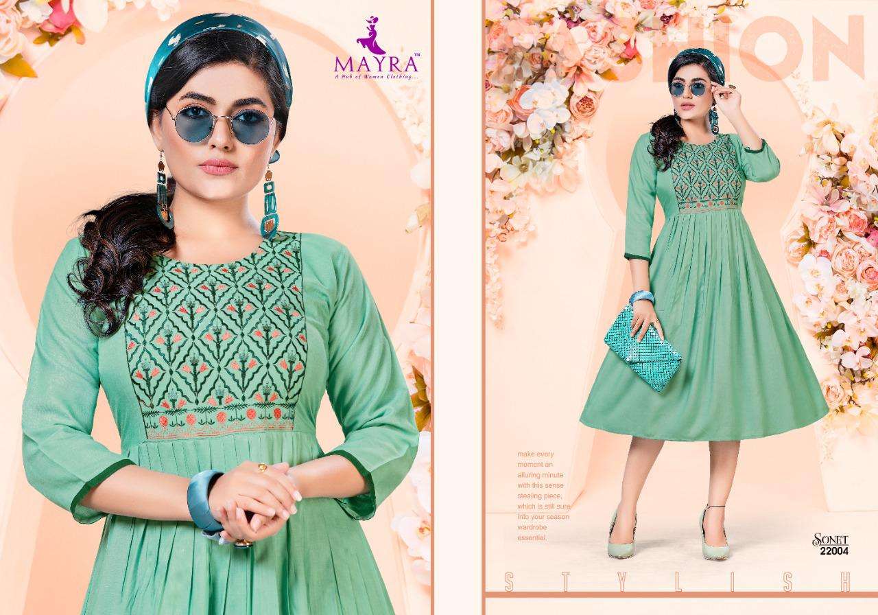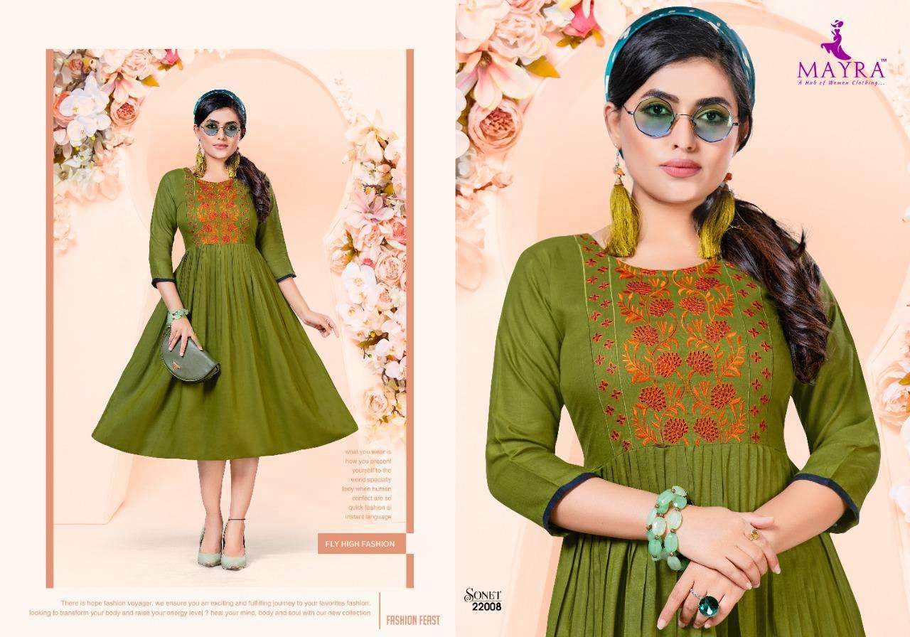 | Other Details | Dear Customers, Welcome to MAYRA (KURTI) .., We are introducing MAYRA 'S  new catalog Catalogue:- SONET cloth :- REYON SLUB WITH EMBROYDREY CONCEPT concept :-Reyon slub with Embroydrey with stiching pattern Length :- 45âMINIMUM Size:- *M,L,XL,XXL,3XL * AVAILABLE 8 DESIGNS CATALOGUE  : Dispatch :- dispatch after 23 July 2021 Rate. :  405/- Always with you... Team MAYRA THANKS SIR/MADAM.. |