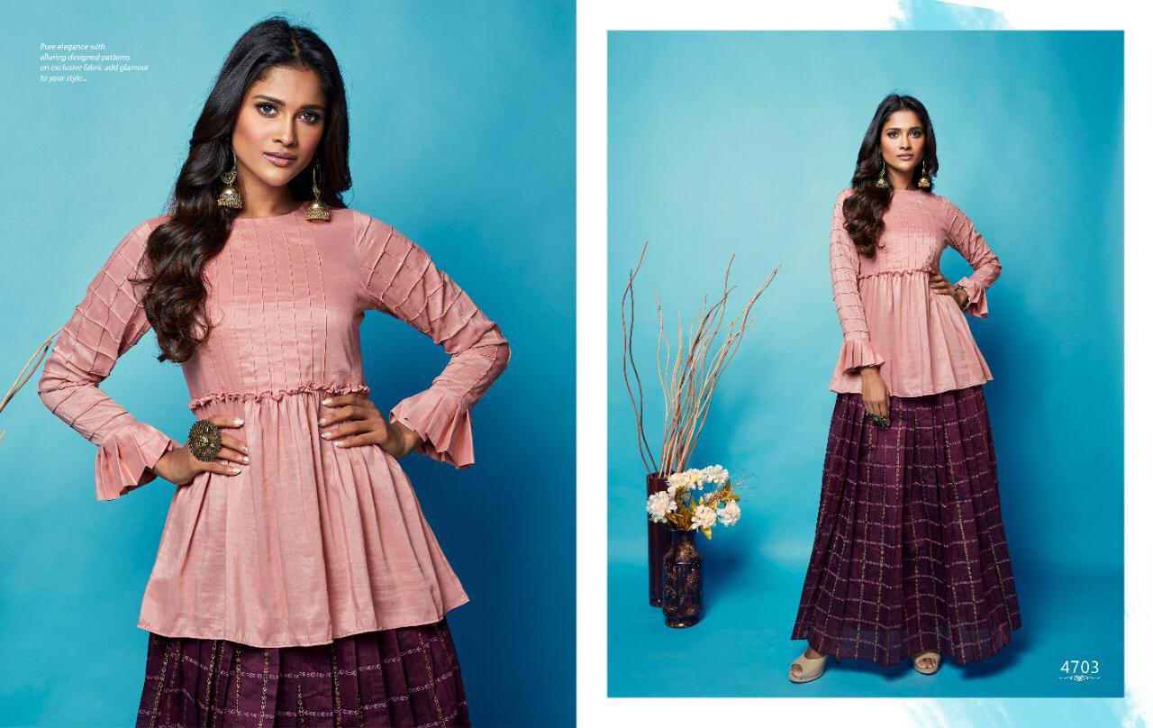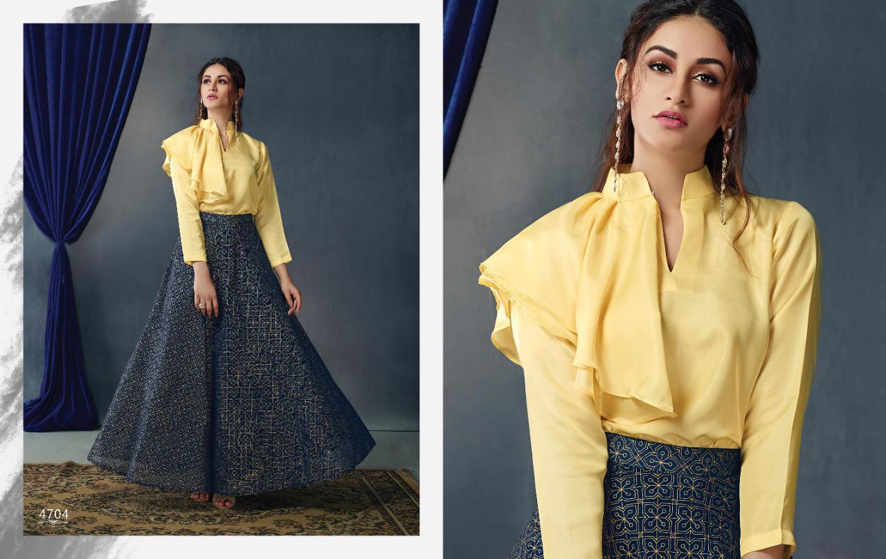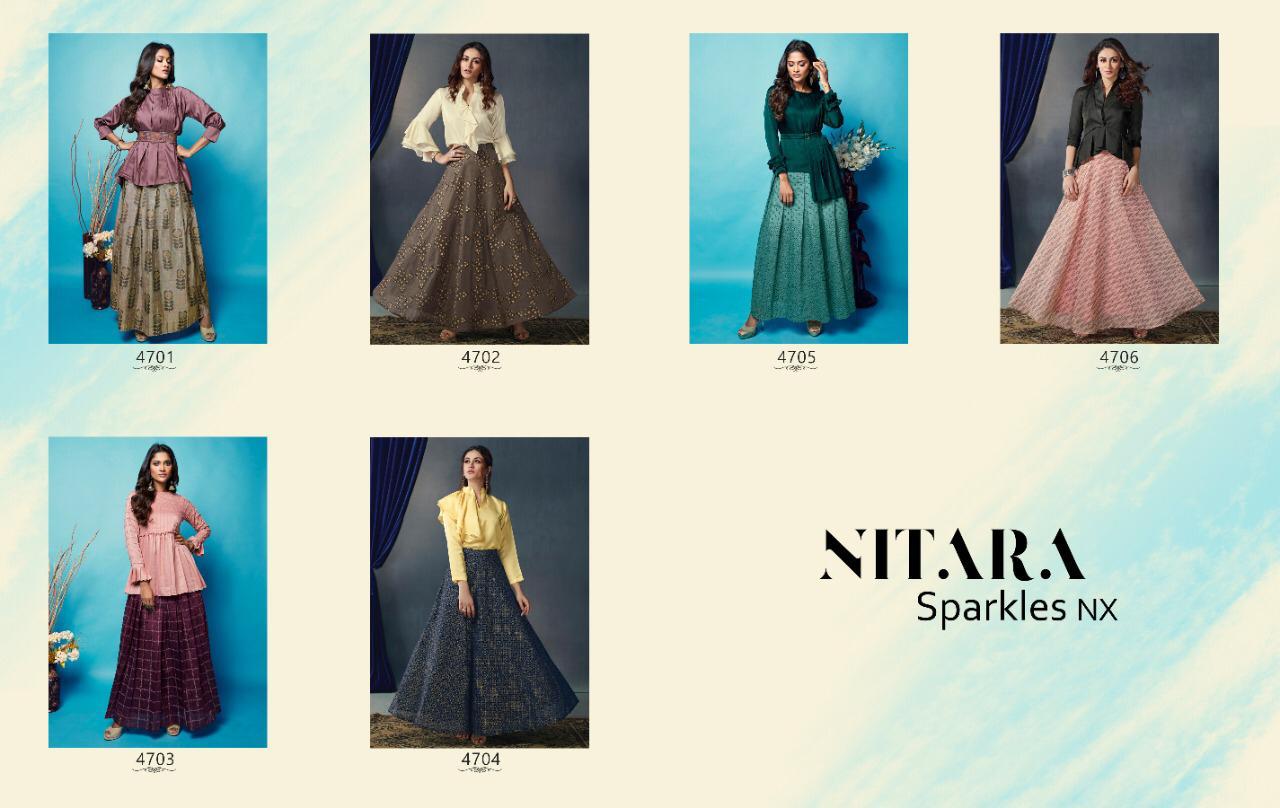 NITARA Brings back 5TH Volume Of its favorite collection, Sparkles, A perfect blend of its best selling designs, Sparkles NX, Most modern Party Wear. Catlog Name – Sparkles NX Fabric – Skirt – Chanderi, Top – Silk No. Of Pieces – 6 Avg. Price – 1130/- Sizes Available - M, L, XL, XXL Full Set only. All Designs Are two Seprate Pieces. Belts Included with two Design as Seen in picture. |