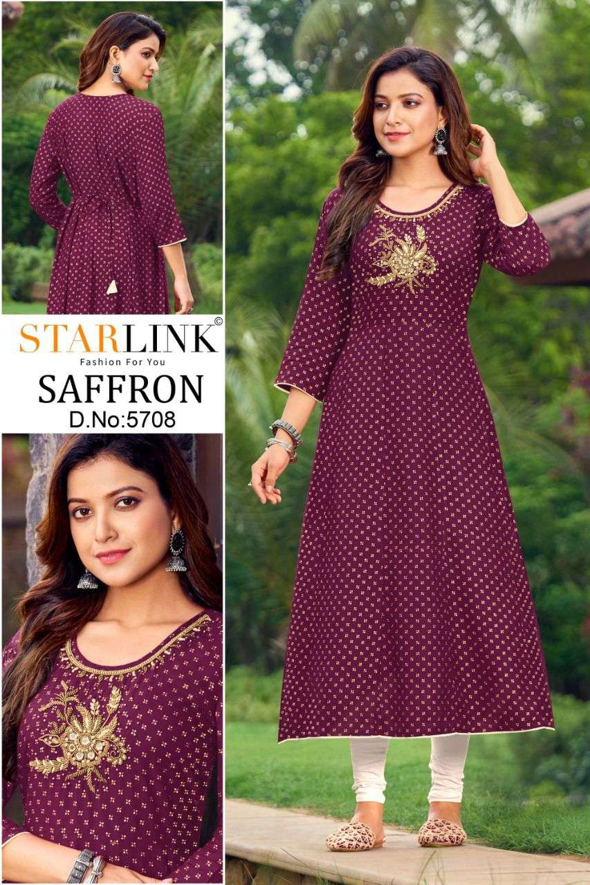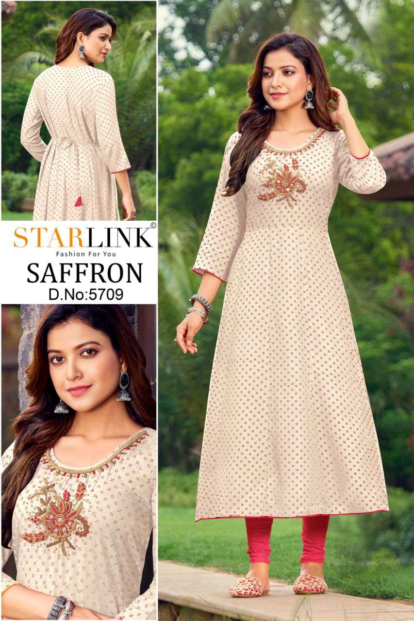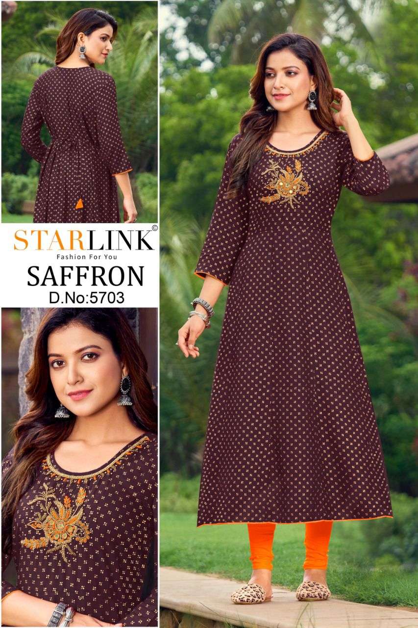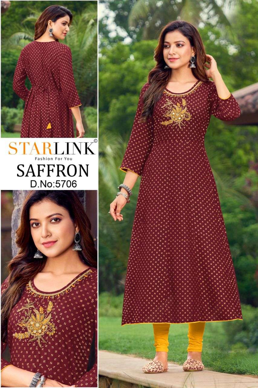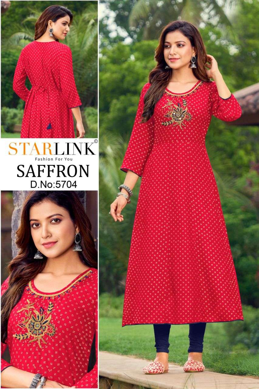 "STARLINK" is happy to announce the launch of new KURTI & READYMADE. 📒 Catlouge Name :- *SAFFRON * 🔻Description🔻 🔹 FABRIC- TOP-RAYON WITH FOIL WITH EMBROIDERY WORK |