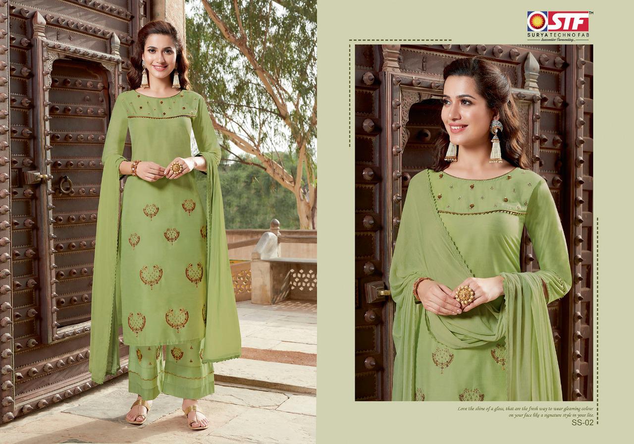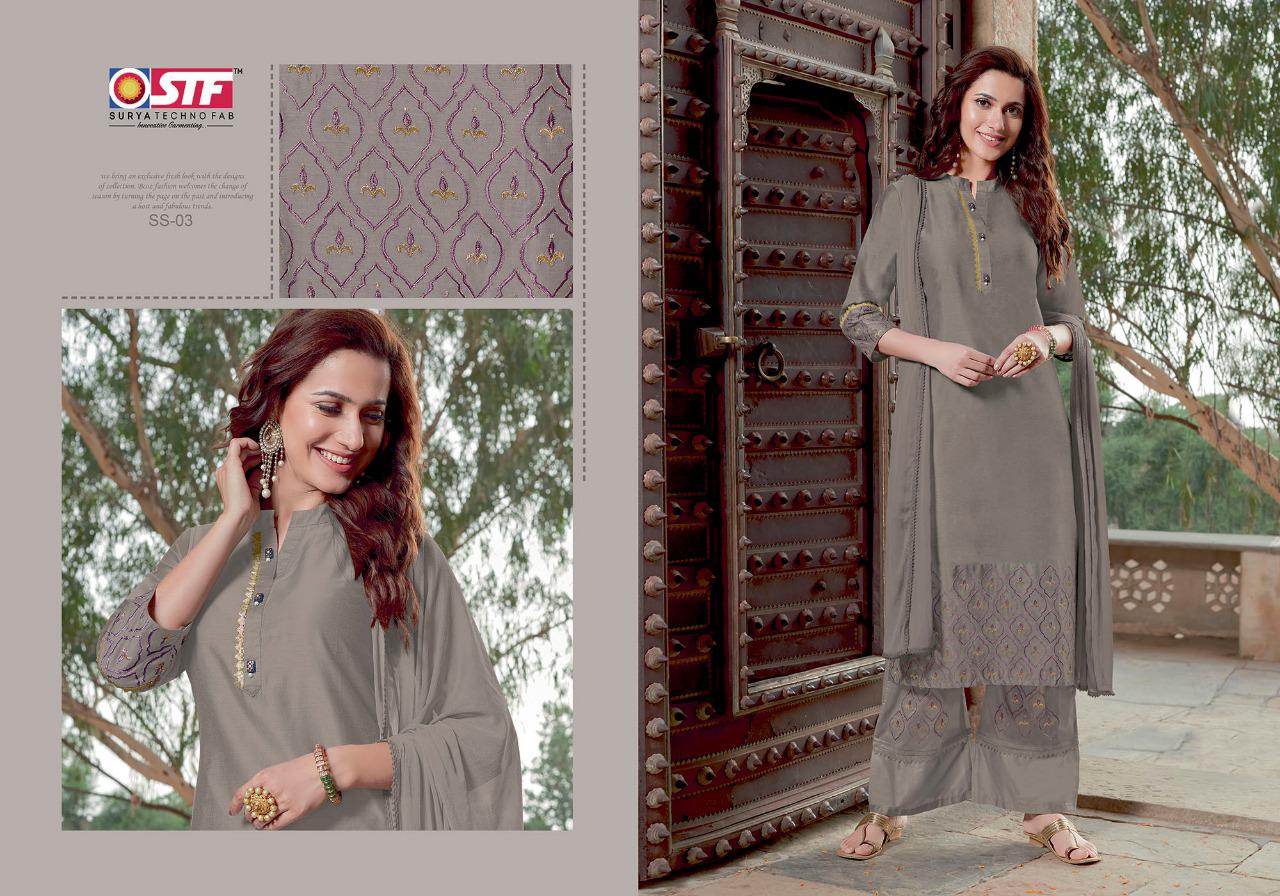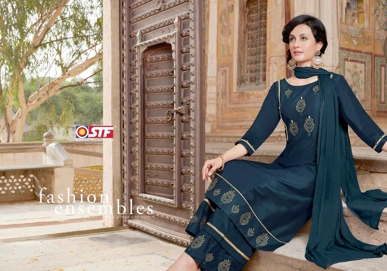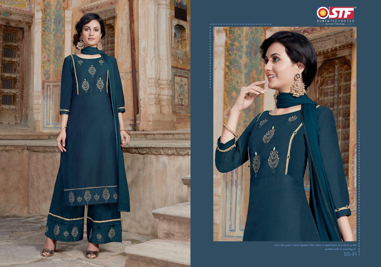 STF(Surya TechnoFab) Launches 3-Piece Festive Wear Ready to Wear Embroidered Straight Cut Pure Silk kurti with Embroidered Pallazo Pant and Duppatta Catalogue :- Silk Sansaar (Sober Embroidered Straight Cut Pure Silk kurtis with elegant Embroidered Pallazo Pants with & Pure Nazneen Duppatas) Fabrics :- Top :- Pure Banarasi Sattori Silk (With Embroidery) (with Aster) Bottom :- Pure Banarasi Sattori Silk (with Embroidery) Duppatta :- Pure Nazneen Length :- Top :- 46 inches Bottom:- 38-40 Inches Duppatta:- 34 Inches Flare:- Straight Cut with Side Slit & Pockets in Bottom _Available sizes _:- M - 38, L - 40, XL - 42, 2XL - 44 Bag - 6 Designs of 1 Size Rate :- ₹1195/- plus 5% GST |