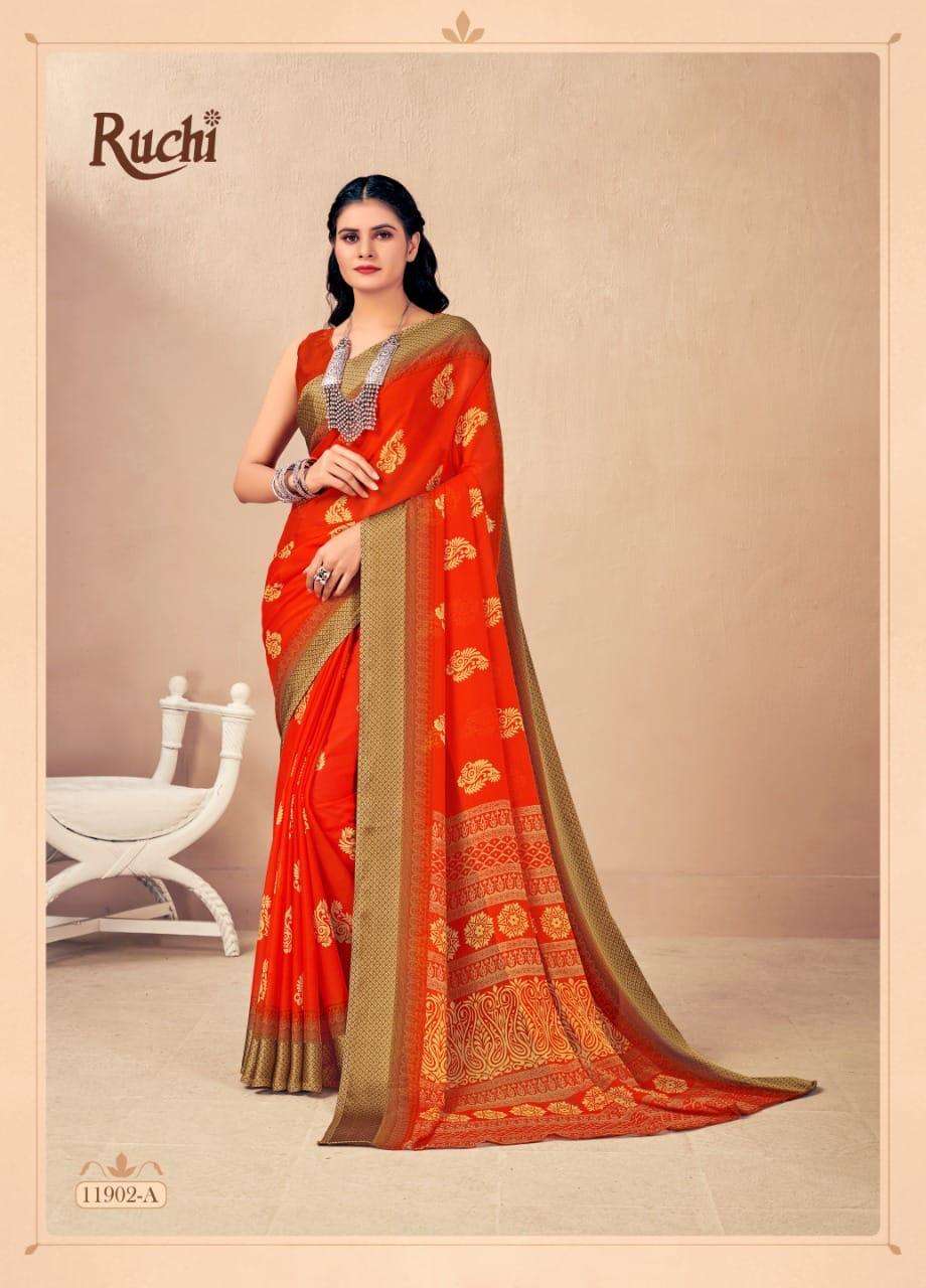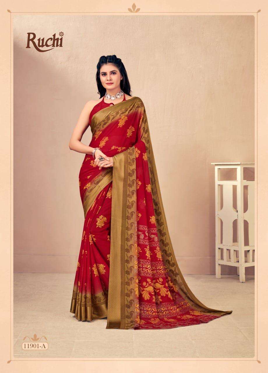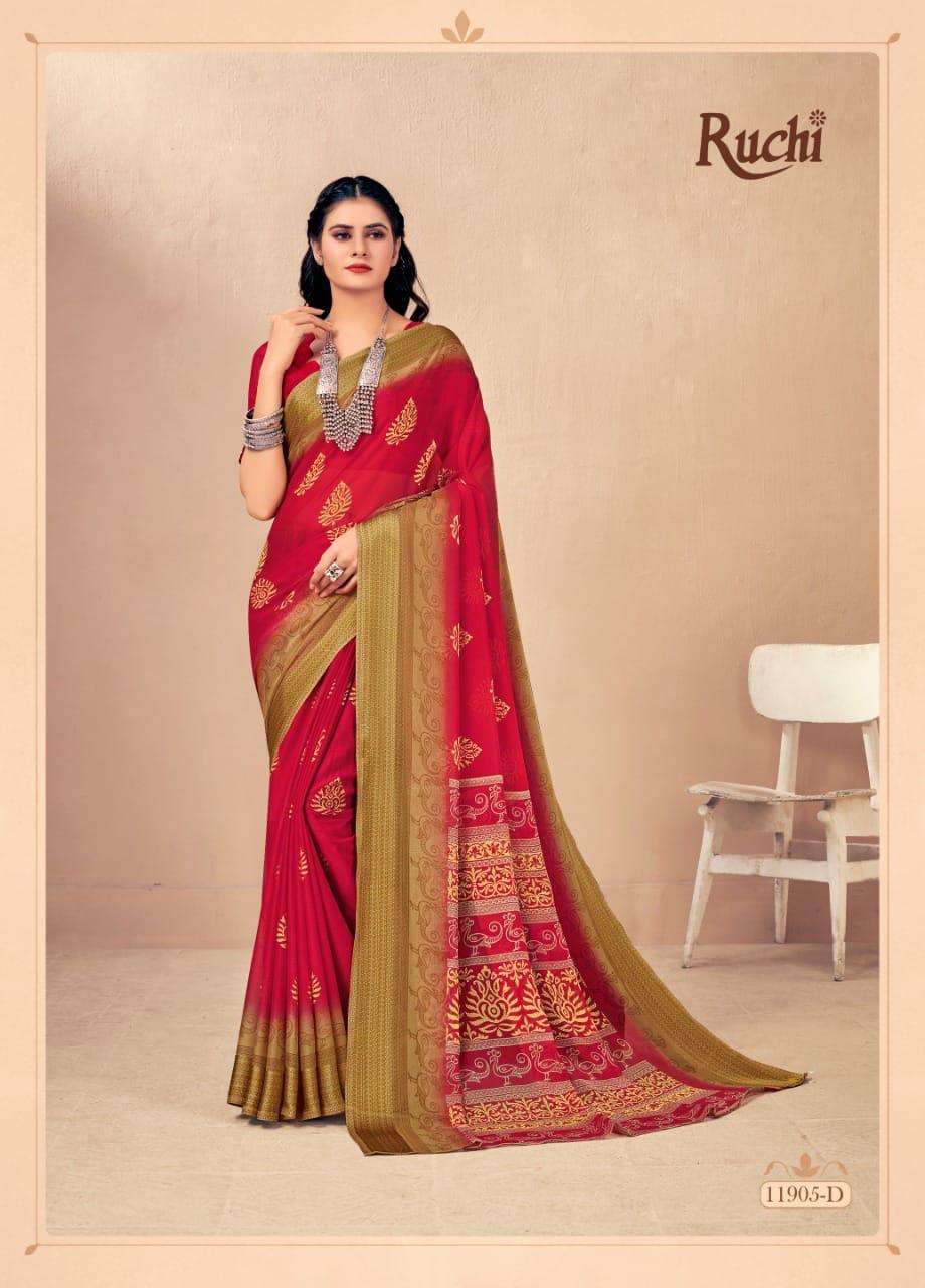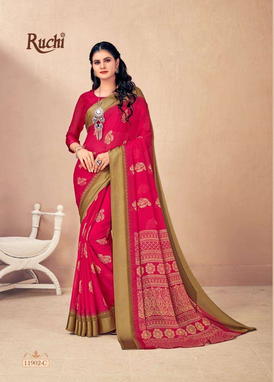 BRAND NAME-* RUCHI SAREES* 1. CATALOG - STRAWBERRY 17TH EDITION. 2. PCS.- 20. 3. FABRIC - SOFT CHIFFON WITH SARTIN WEAVED BORDER. 4. WEIGHT - 450 GRAMS APPROX. SERIES- 11901 TO 11905 COLOURS (A TO D) *RATE- 460/- GST Â 5% EXTRA |