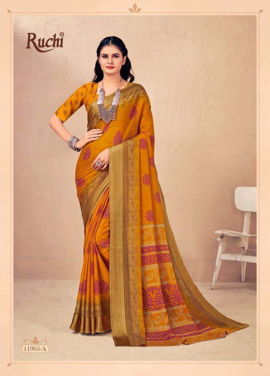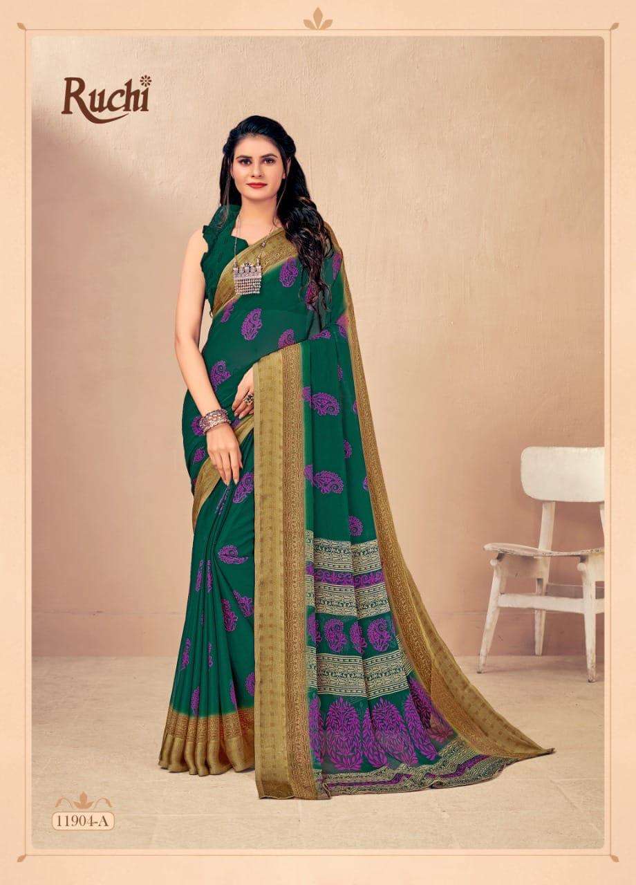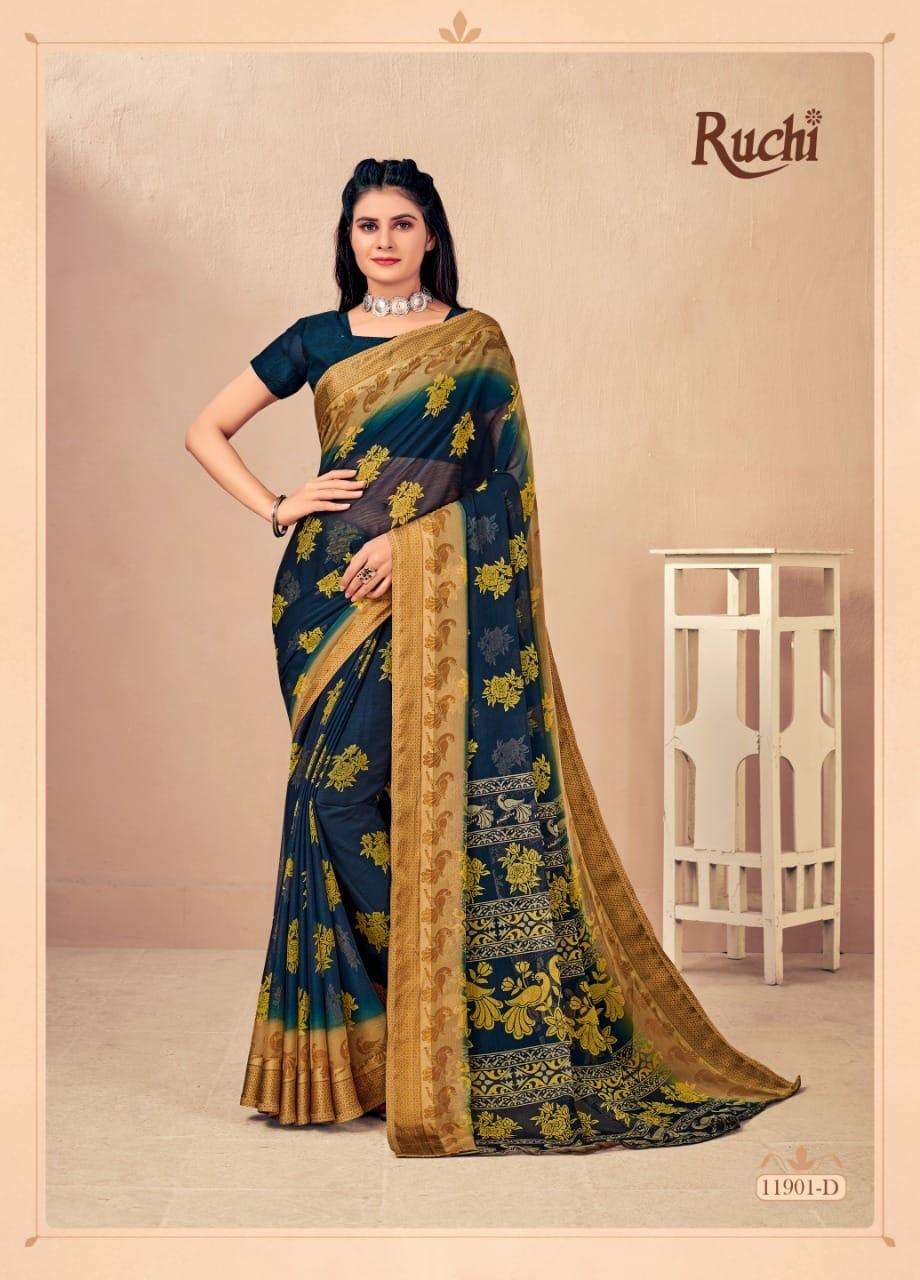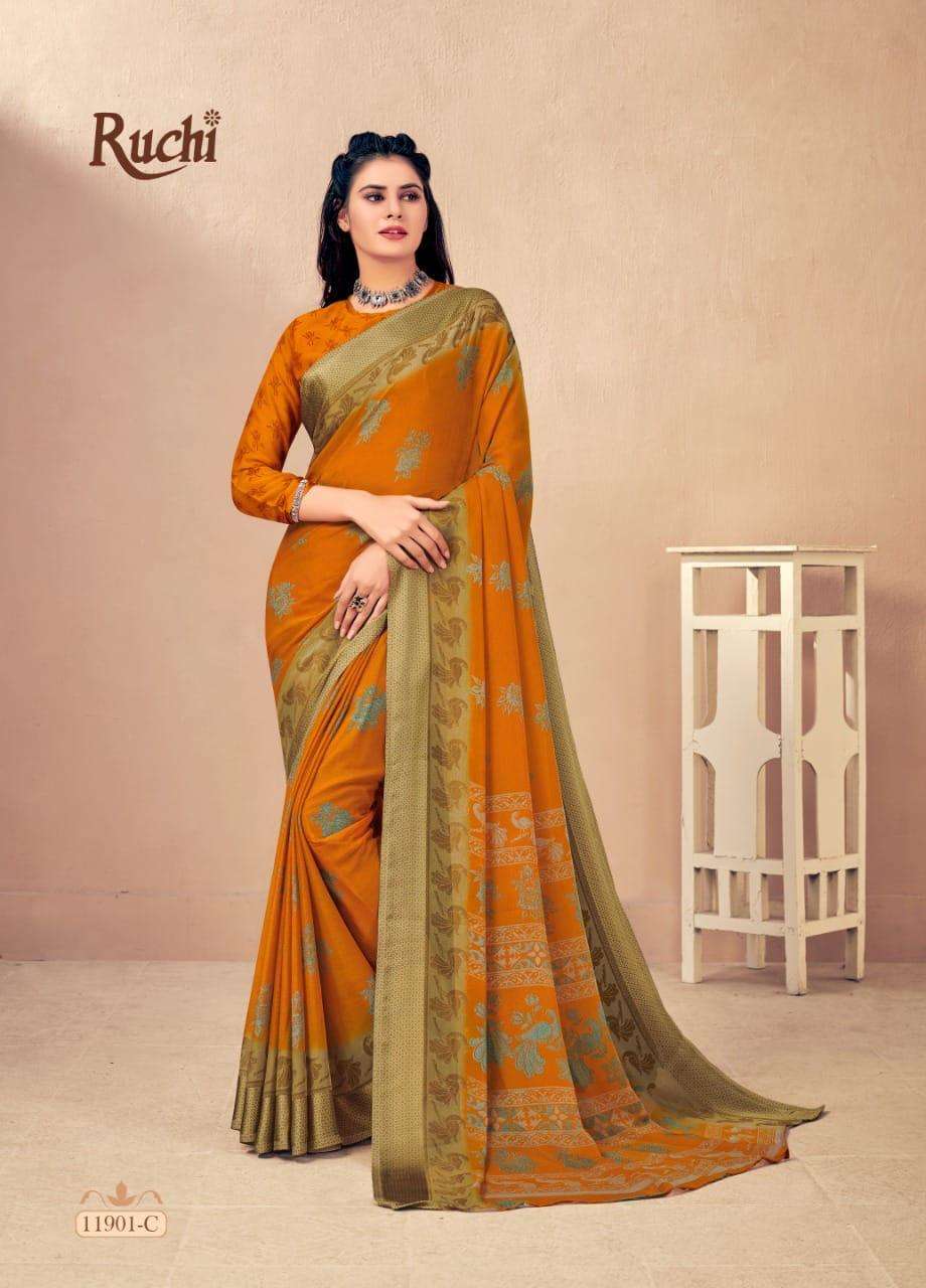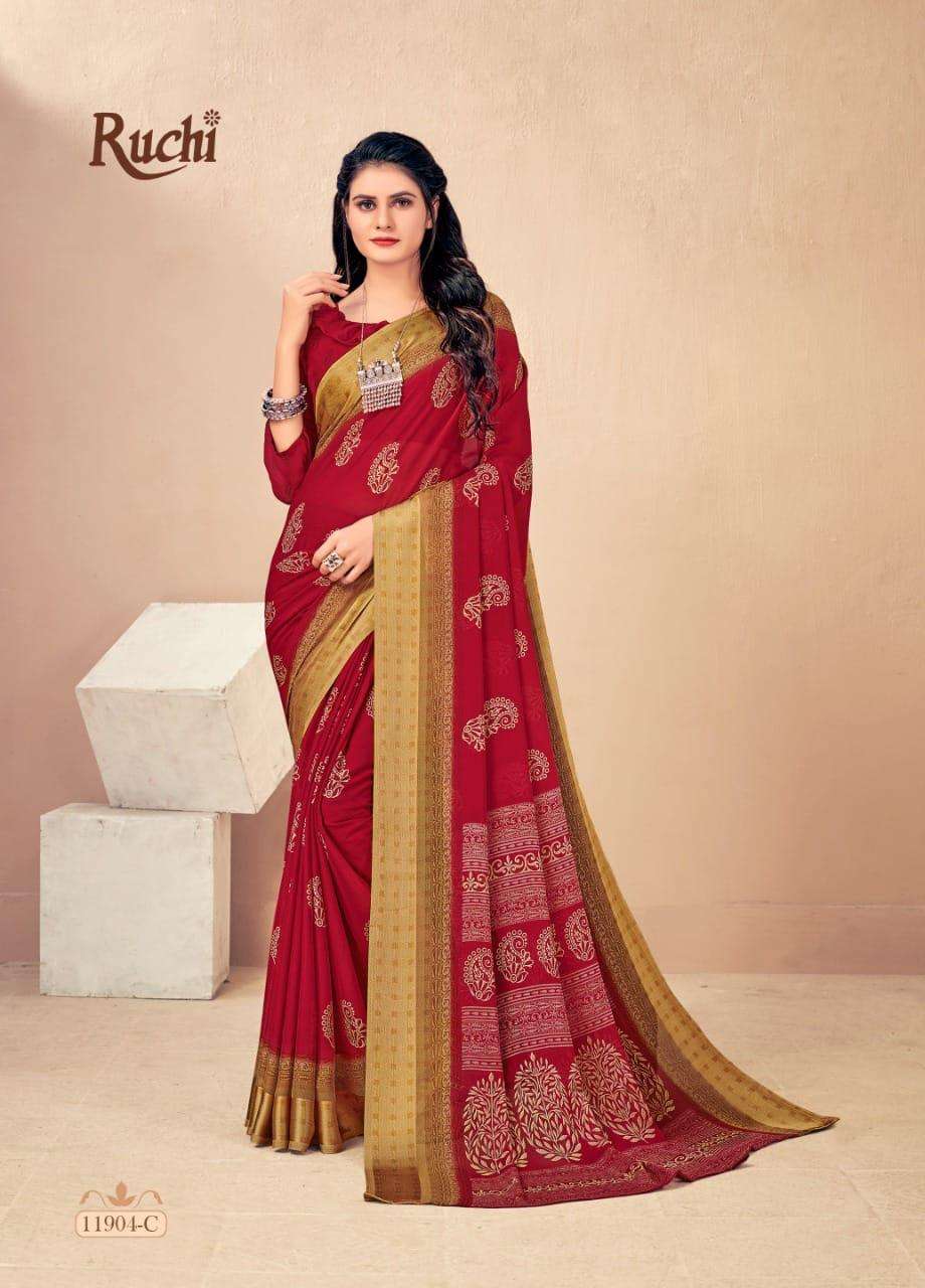BRAND NAME-* RUCHI SAREES* 1. CATALOG - STRAWBERRY 17TH EDITION. 2. PCS.- 20. 3. FABRIC - SOFT CHIFFON WITH SARTIN WEAVED BORDER. 4. WEIGHT - 450 GRAMS APPROX. SERIES- 11901 TO 11905 COLOURS (A TO D) *RATE- 460/- GST Â 5% EXTRA |