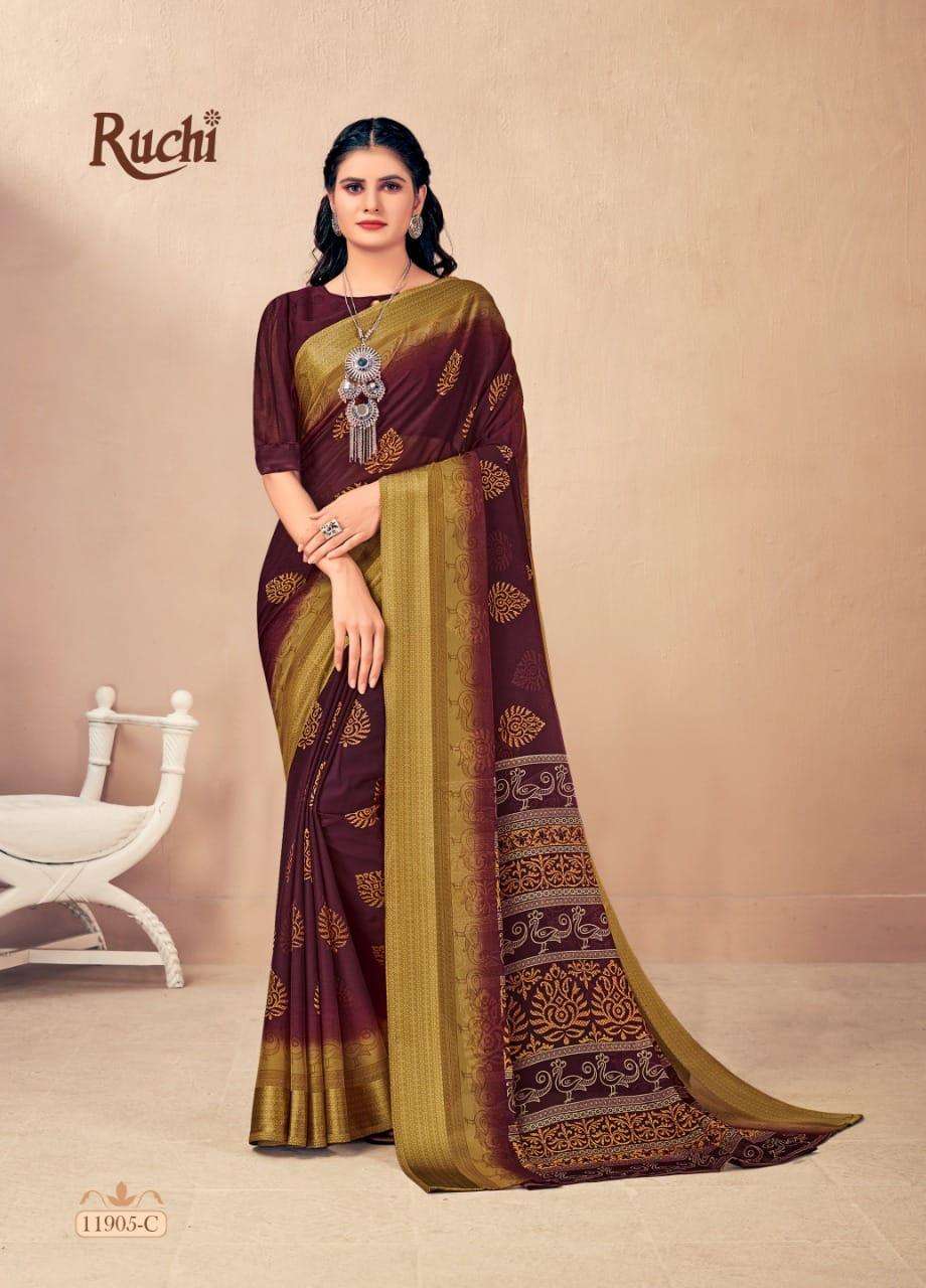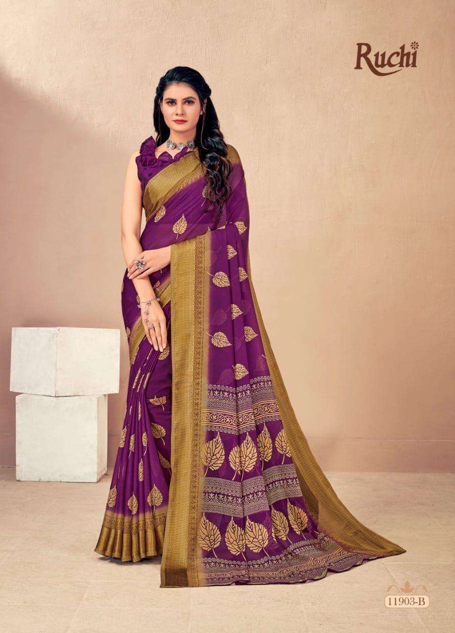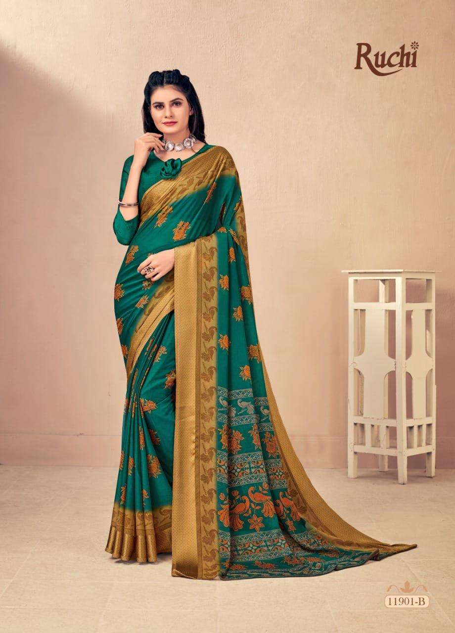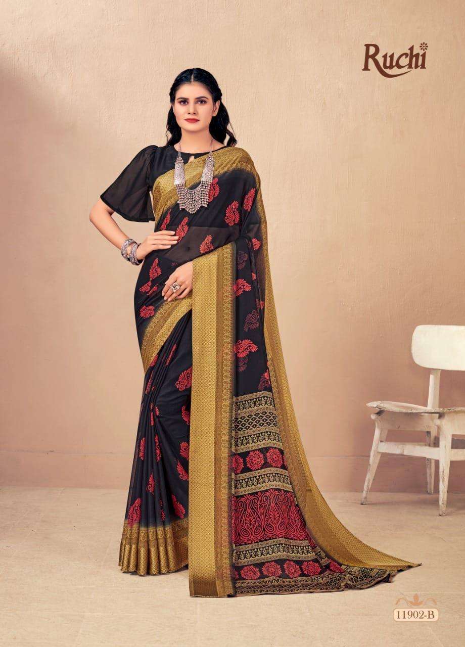 BRAND NAME-* RUCHI SAREES* 1. CATALOG - STRAWBERRY 17TH EDITION. 2. PCS.- 20. 3. FABRIC - SOFT CHIFFON WITH SARTIN WEAVED BORDER. 4. WEIGHT - 450 GRAMS APPROX. SERIES- 11901 TO 11905 COLOURS (A TO D) *RATE- 460/- GST Â 5% EXTRA |