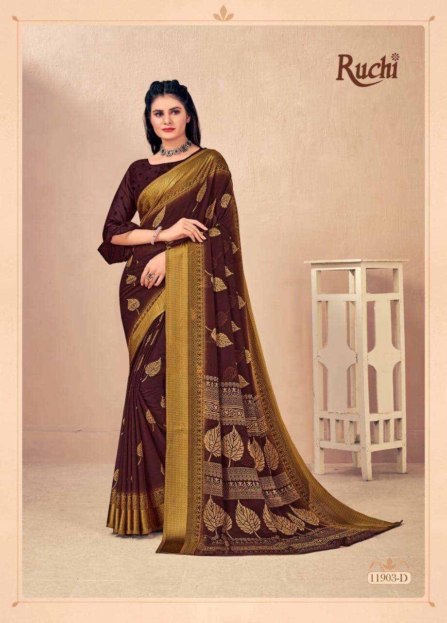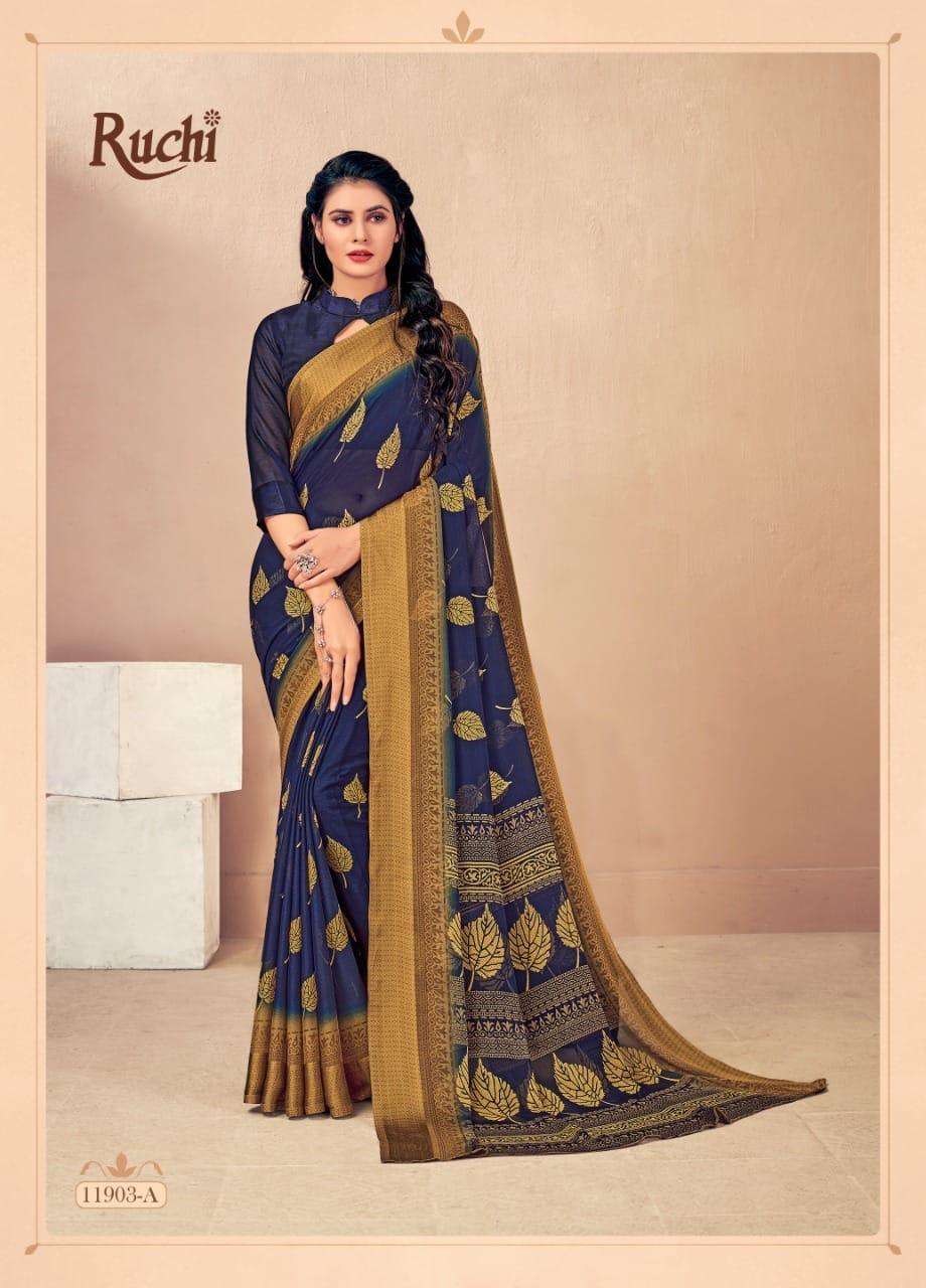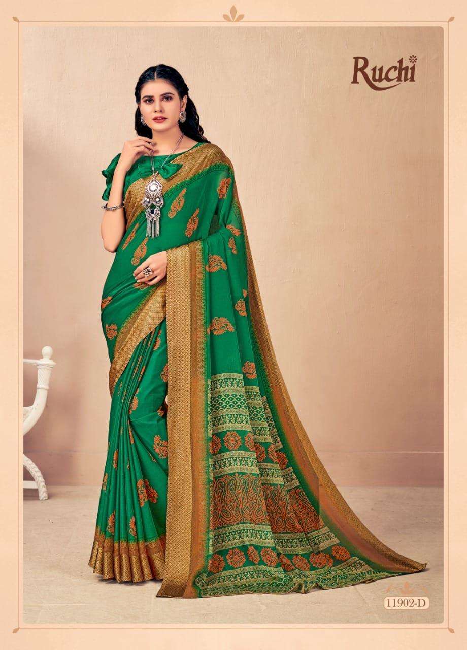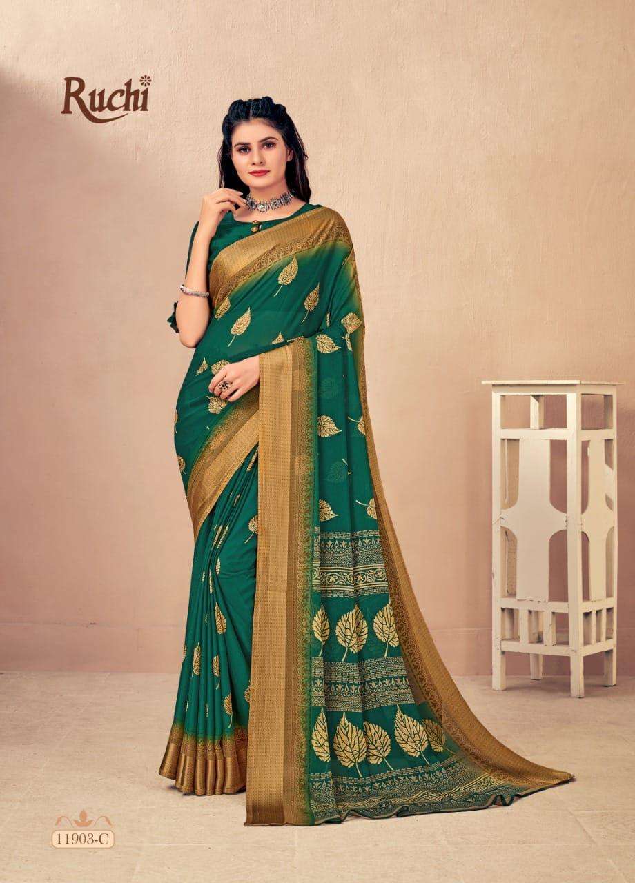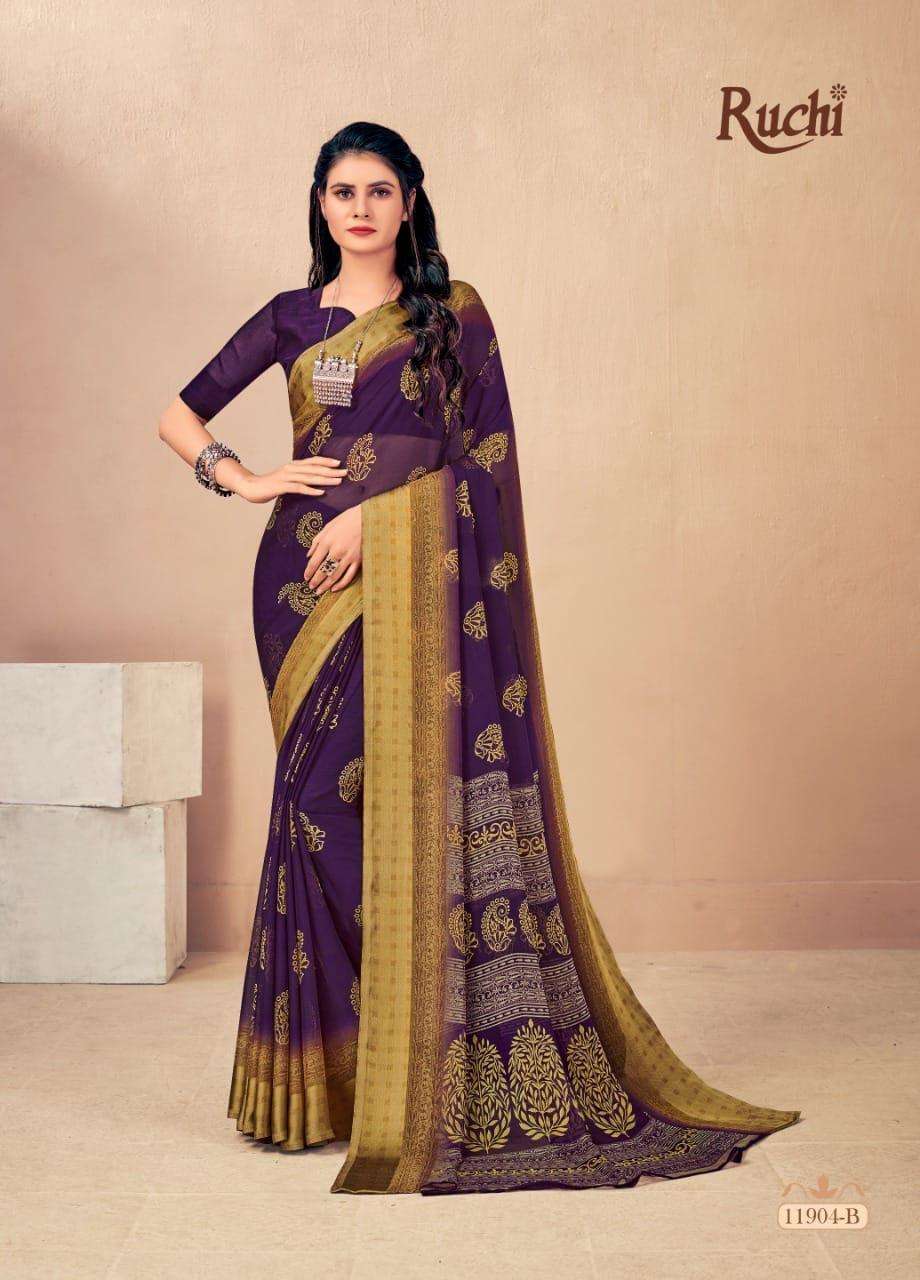 BRAND NAME-* RUCHI SAREES* 1. CATALOG - STRAWBERRY 17TH EDITION. 2. PCS.- 20. 3. FABRIC - SOFT CHIFFON WITH SARTIN WEAVED BORDER. 4. WEIGHT - 450 GRAMS APPROX. SERIES- 11901 TO 11905 COLOURS (A TO D) *RATE- 460/- GST Â 5% EXTRA |