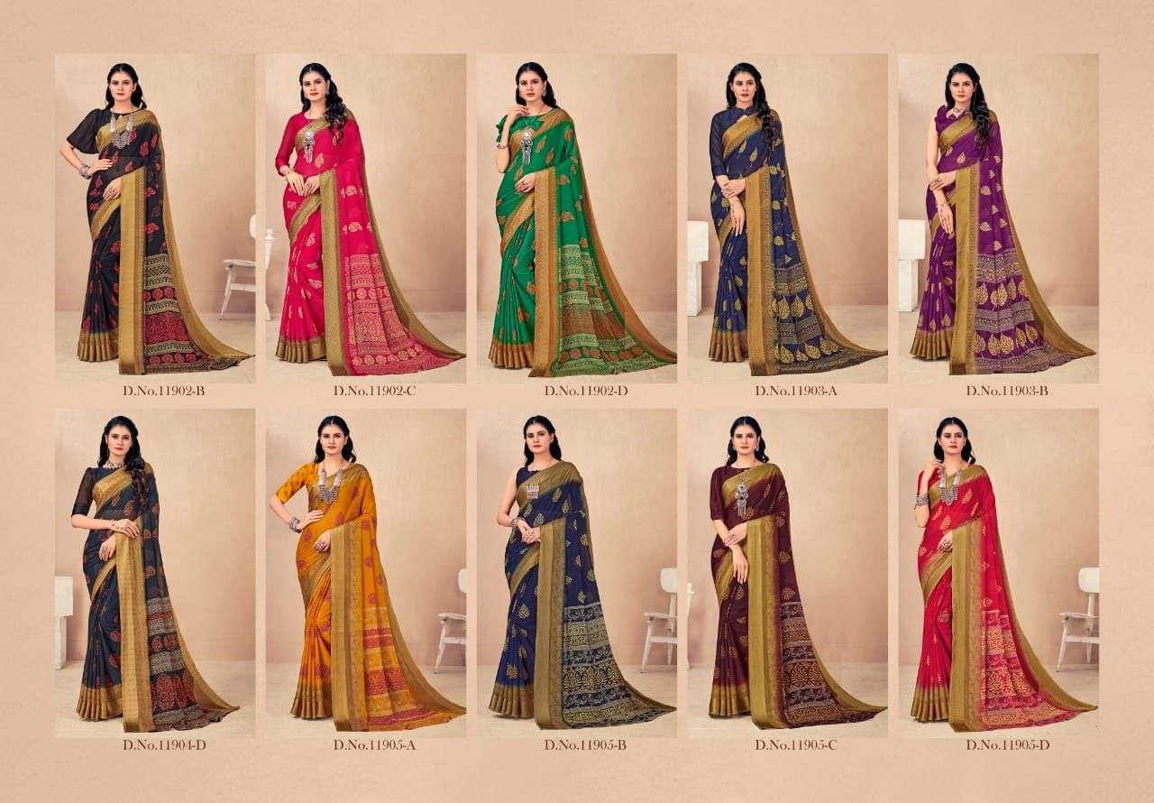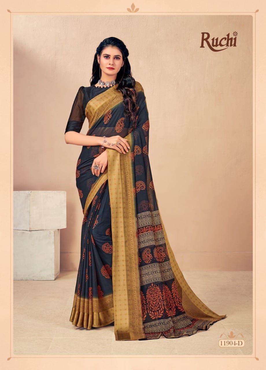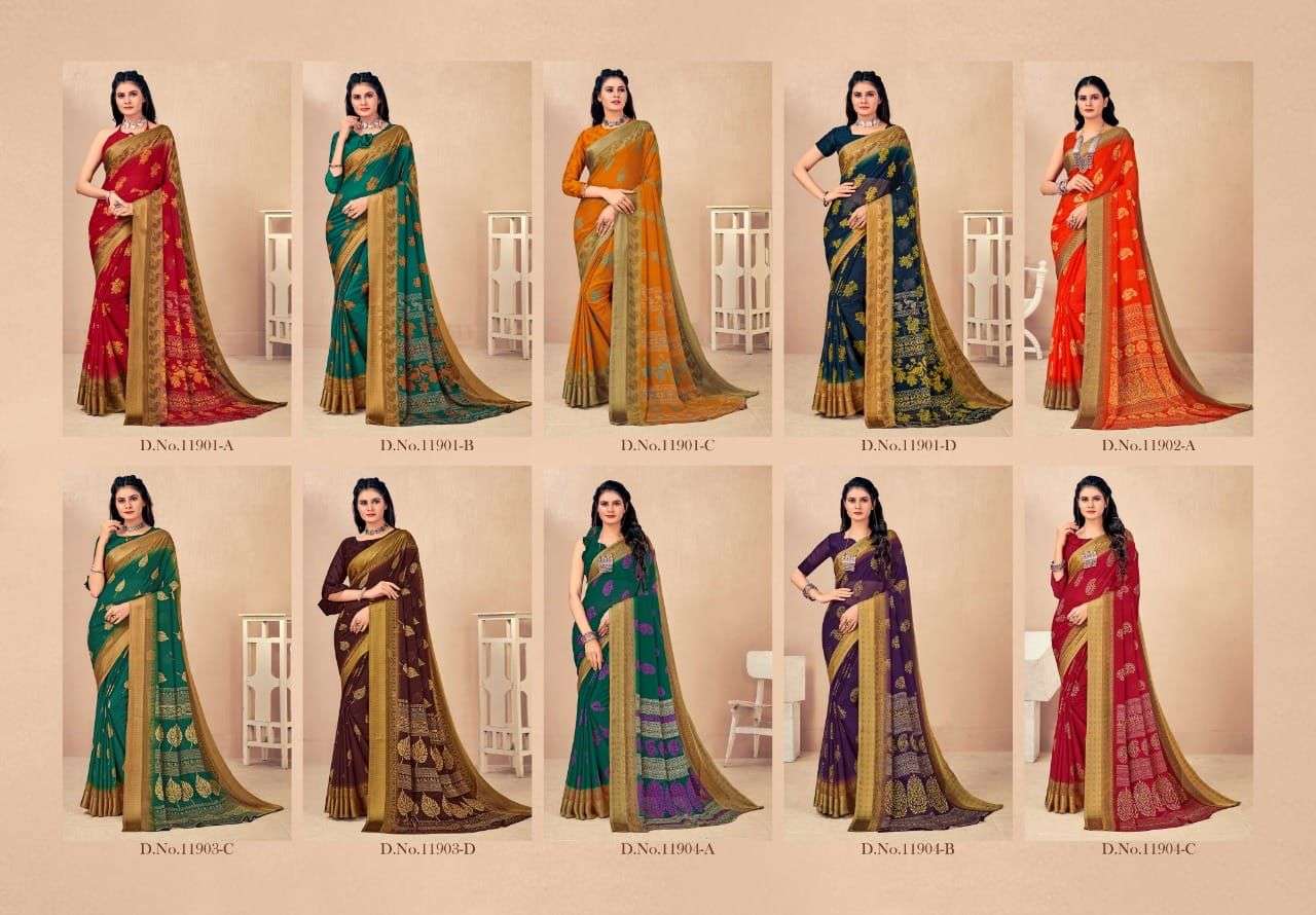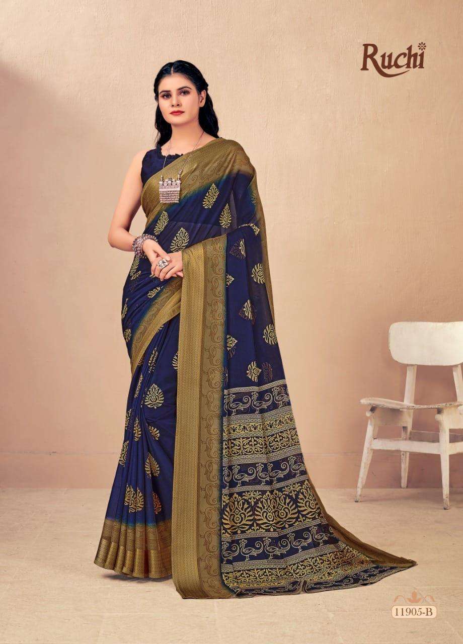 BRAND NAME-* RUCHI SAREES* 1. CATALOG - STRAWBERRY 17TH EDITION. 2. PCS.- 20. 3. FABRIC - SOFT CHIFFON WITH SARTIN WEAVED BORDER. 4. WEIGHT - 450 GRAMS APPROX. SERIES- 11901 TO 11905 COLOURS (A TO D) *RATE- 460/- GST Â 5% EXTRA |