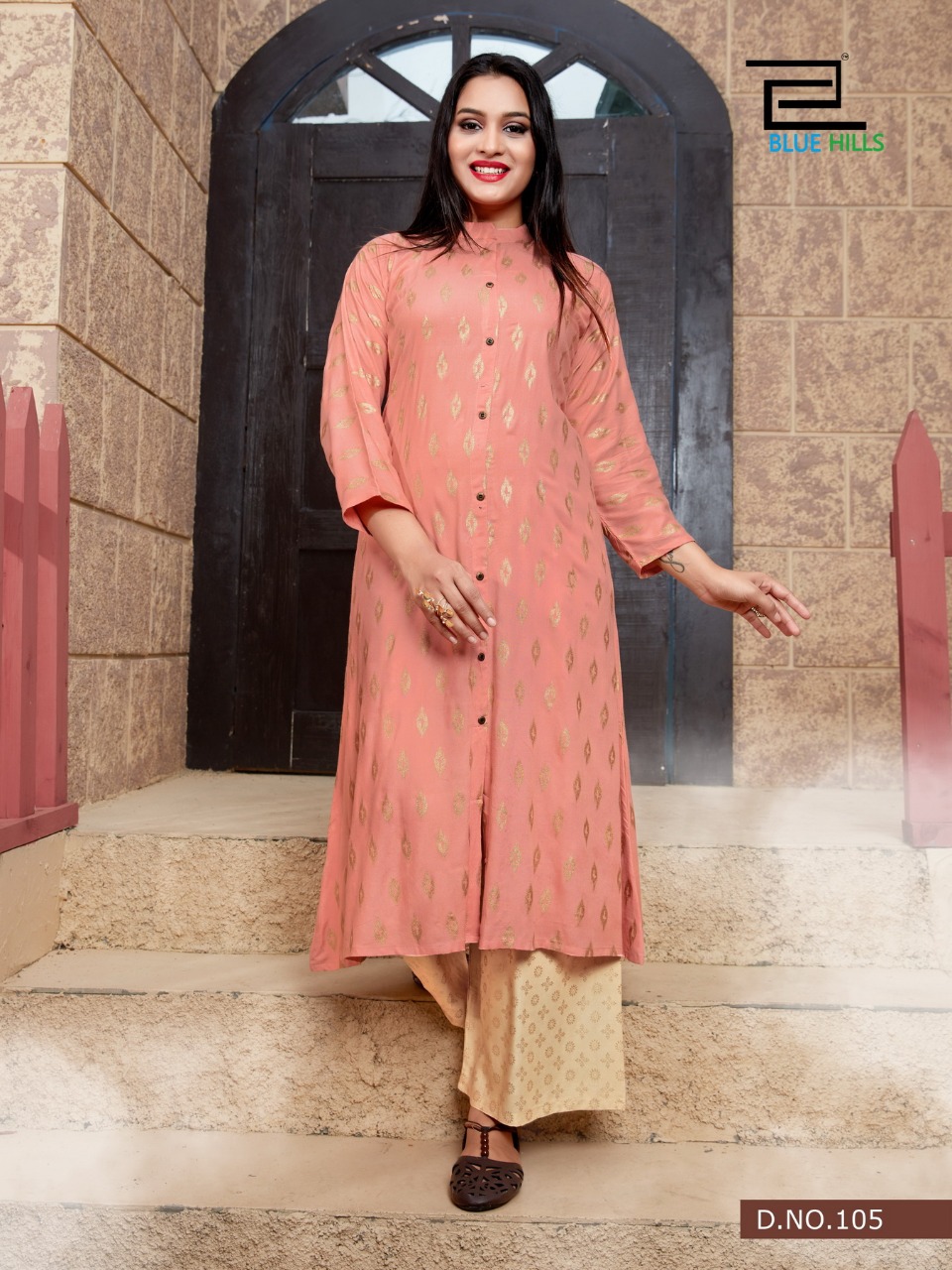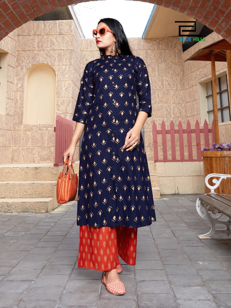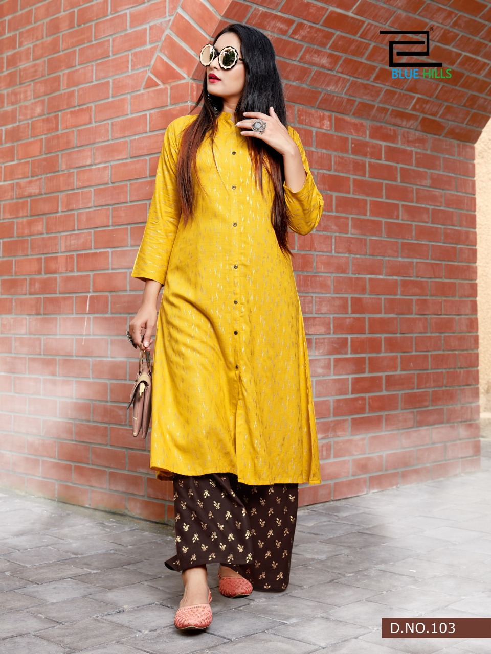 Style In Vol 3 By Blue Hills Rayon Gold Printed Long Kurti And Plazzo Pair Collection