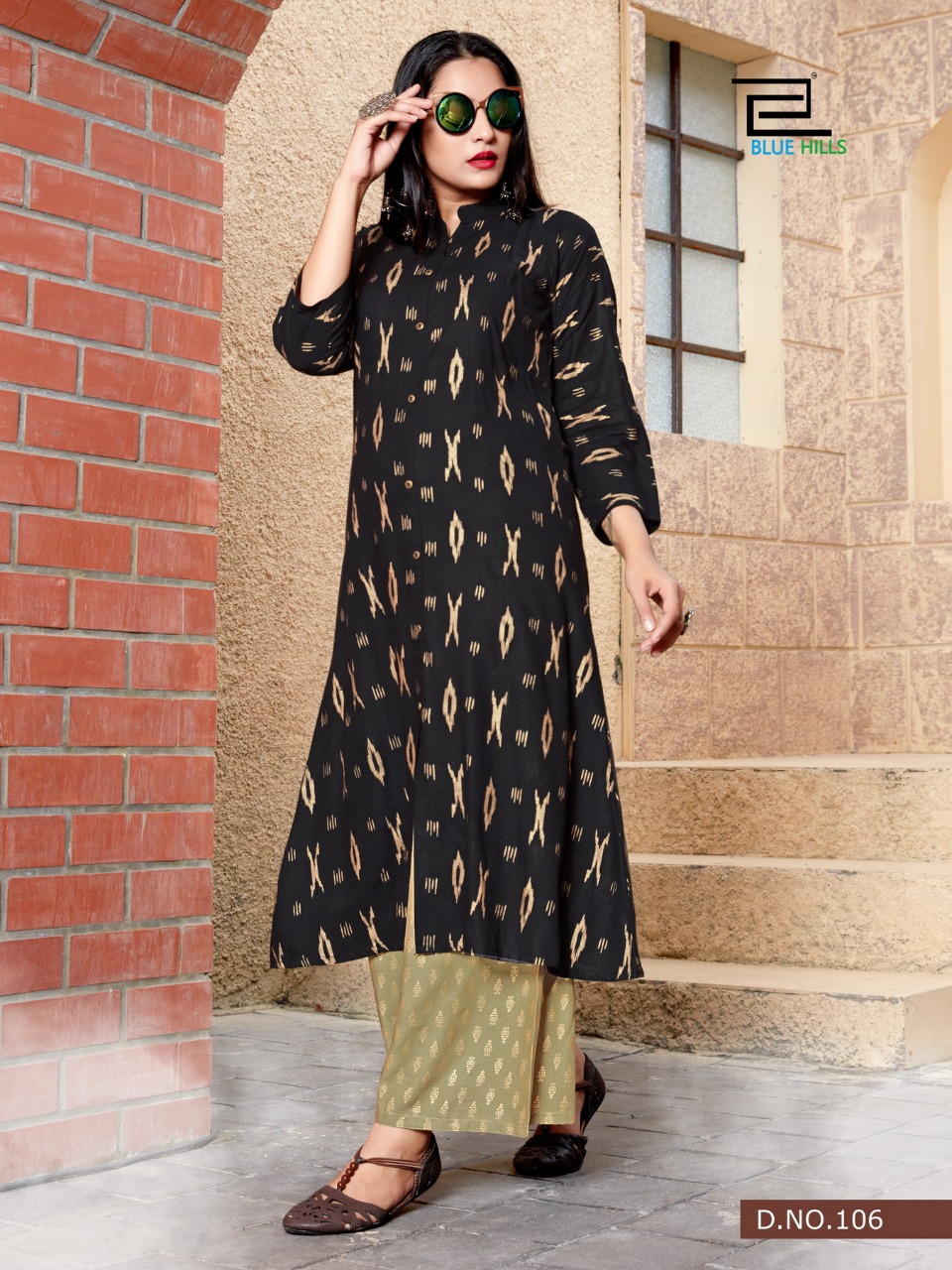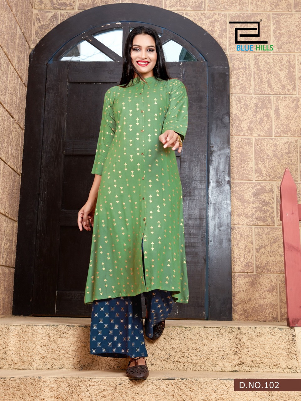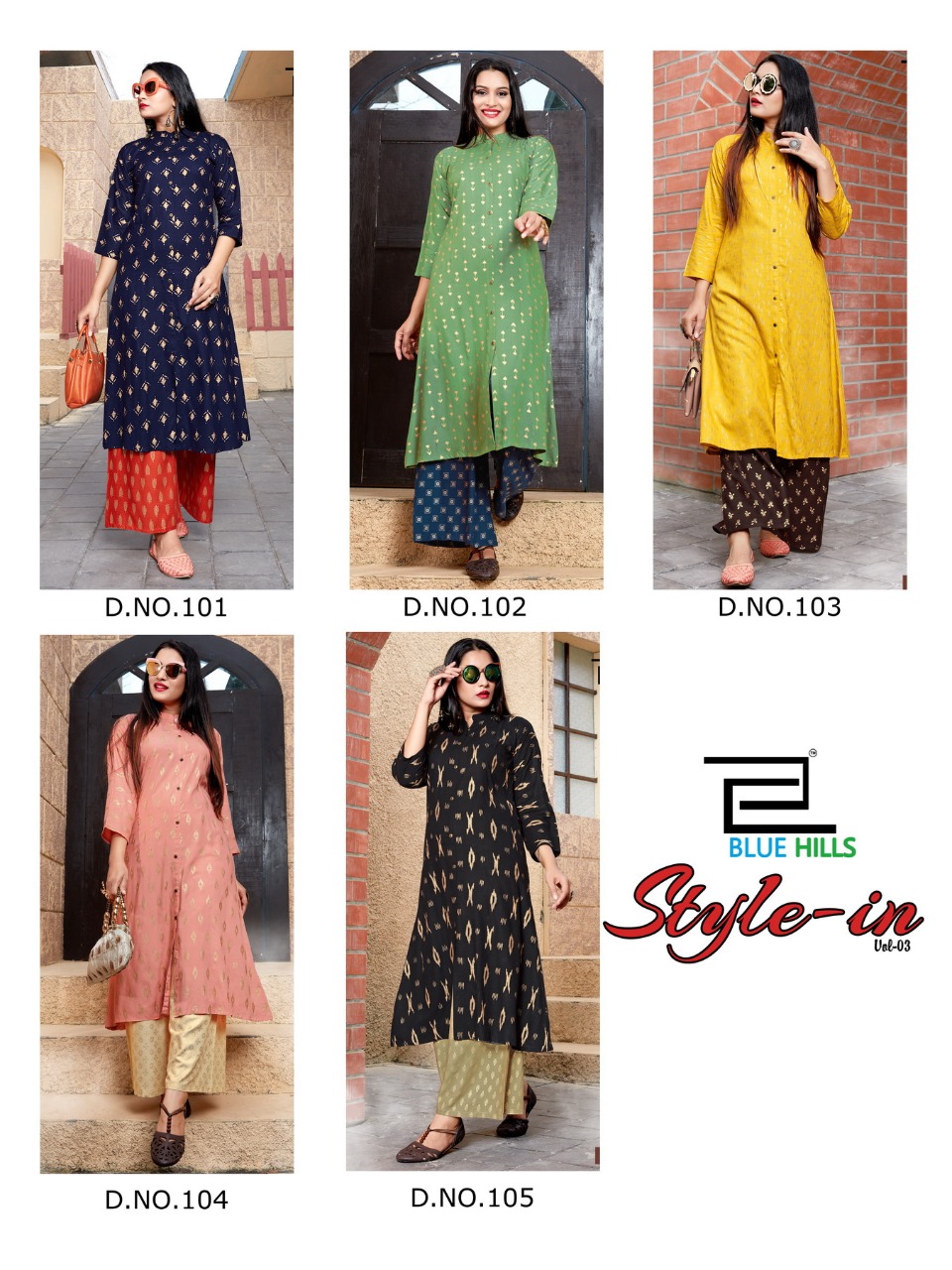 Style In Vol 3 By Blue Hills Rayon Gold Printed Long Kurti And Plazzo Pair Collection