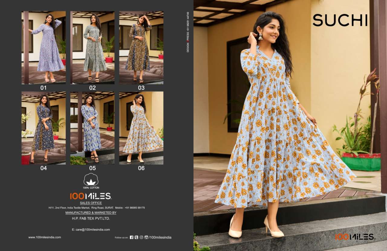Catalog : SUCHI Style : Pure cotton Printed long dress with lace and Pintex detailing and with flair gathers. Length: 49-50 BRAND : 100MILES® SIZES : M to 2XL RATE : 535/- Pieces: 6 per Bag |
