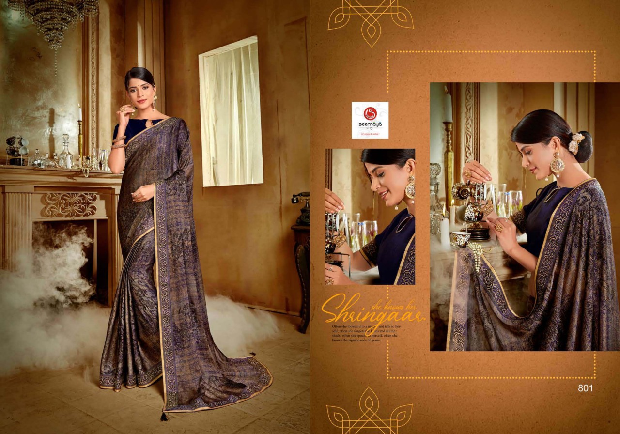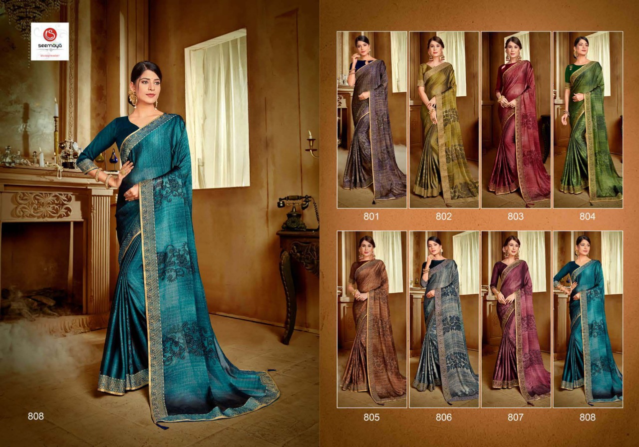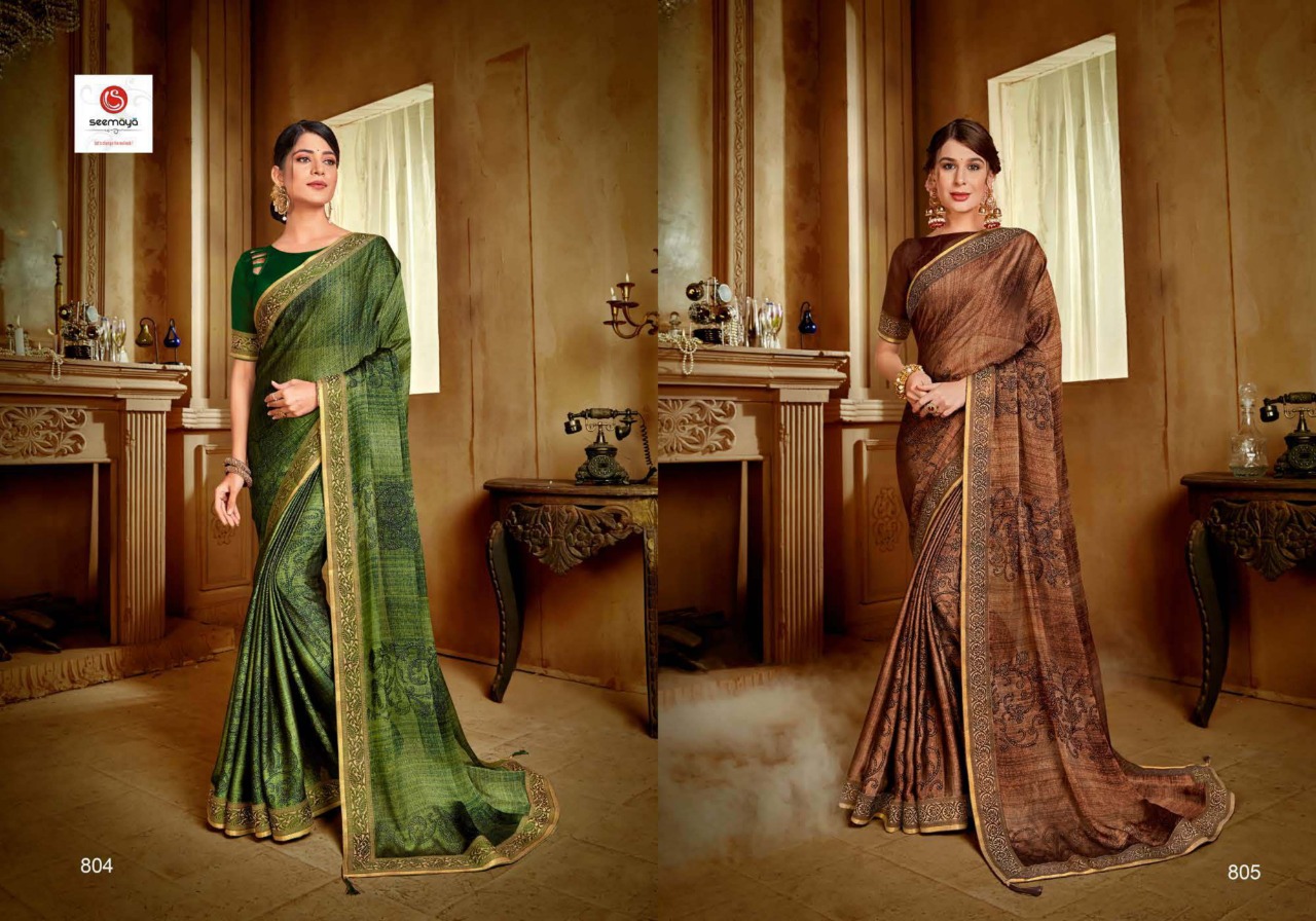 _SUGANDHA Brand:- SEEMAYA _Rate:- 555 per pcs Fabric:- FANCY CXP MOSS CHIFFON WITH FANCY DYEBLE BIG BORDER Total Designs:- 8 _Packing pcs :- set to set Matching :- SINGLE COLOR Cut :- 6/30 mtr |