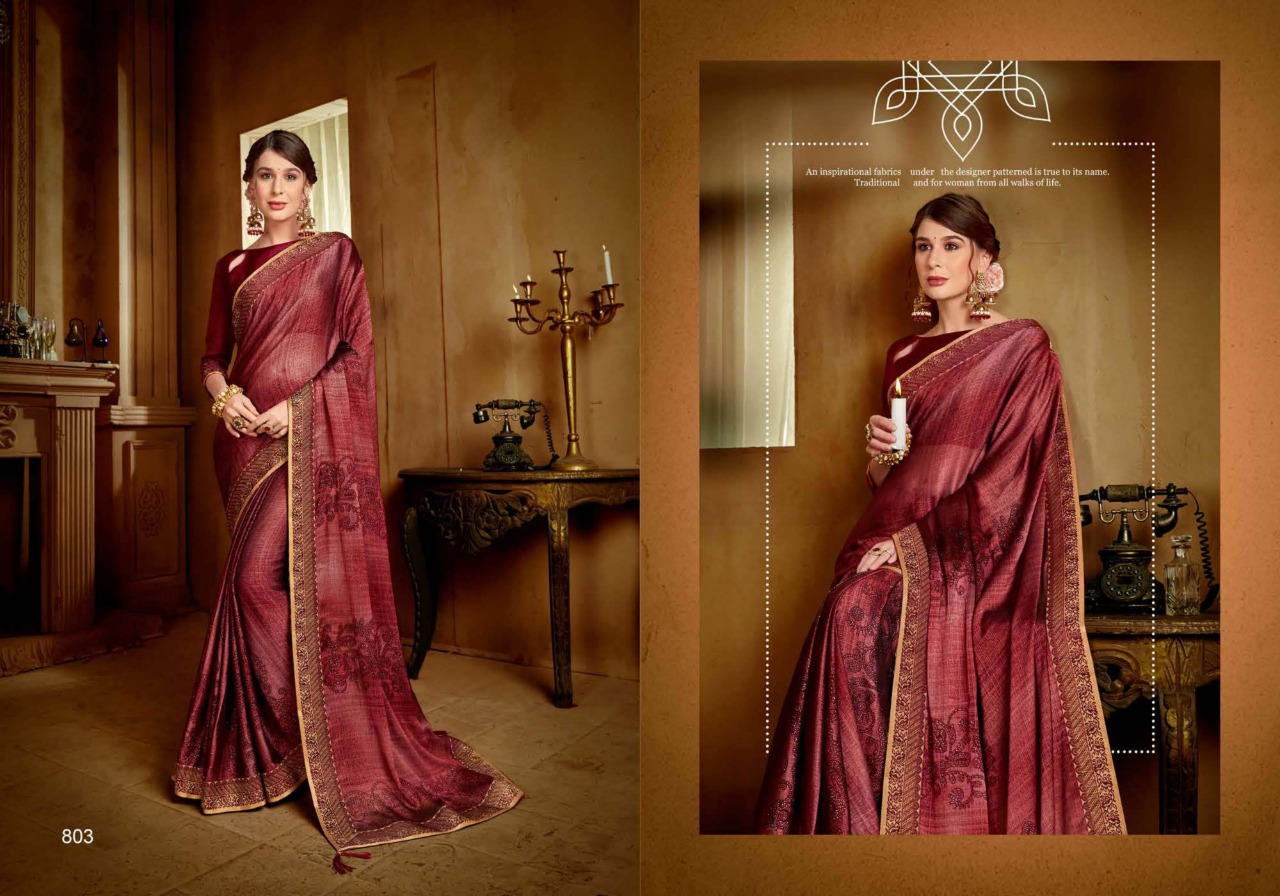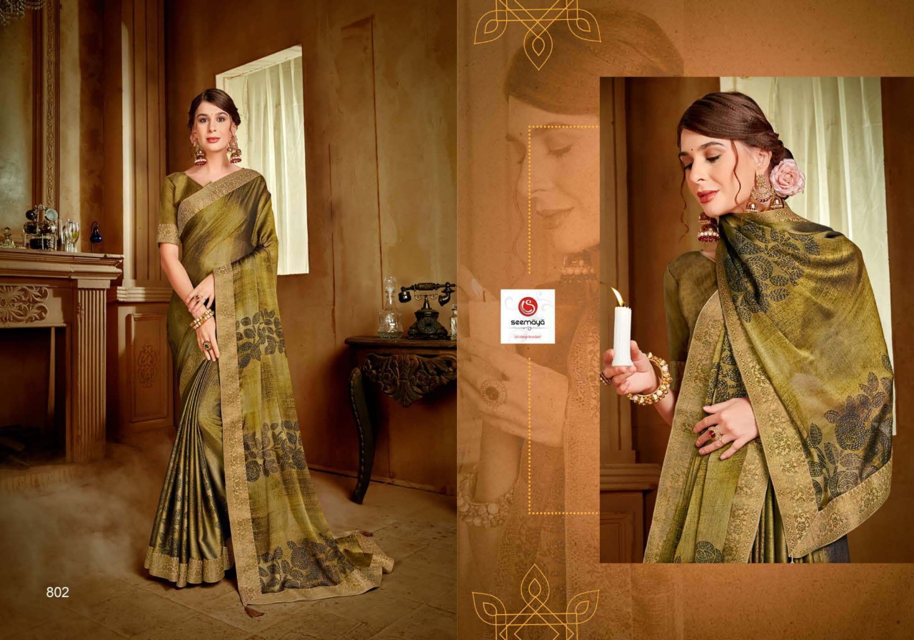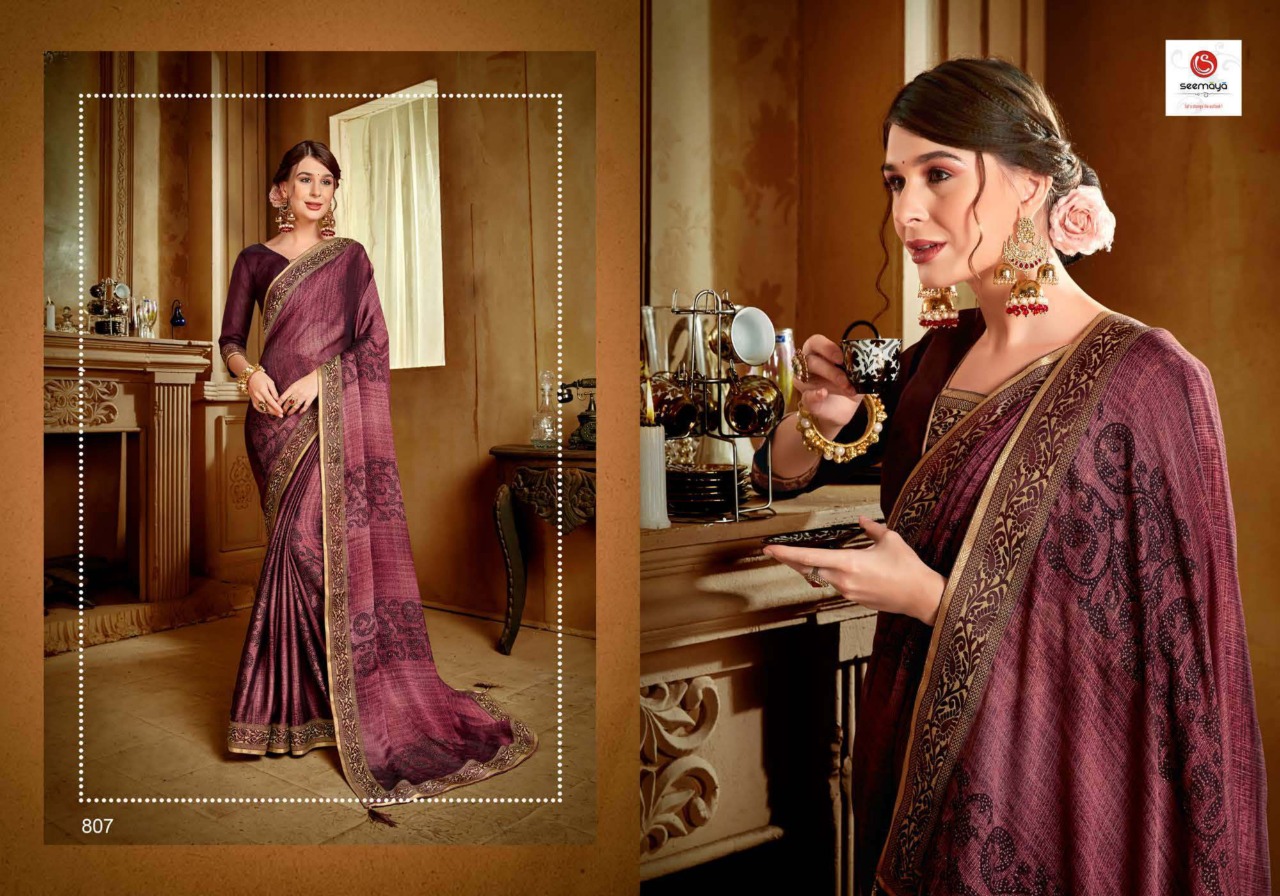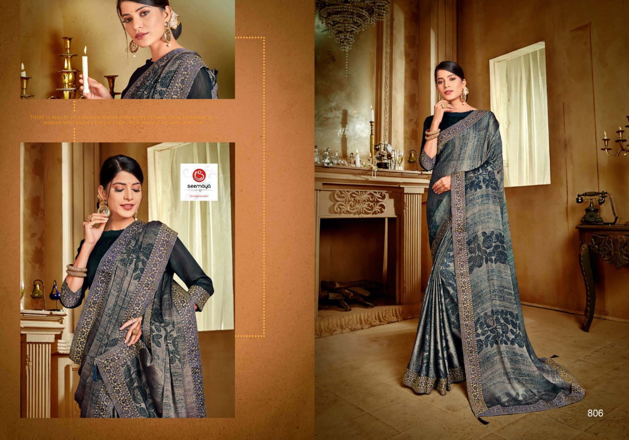 _SUGANDHA Brand:- SEEMAYA _Rate:- 555 per pcs Fabric:- FANCY CXP MOSS CHIFFON WITH FANCY DYEBLE BIG BORDER Total Designs:- 8 _Packing pcs :- set to set Matching :- SINGLE COLOR Cut :- 6/30 mtr |