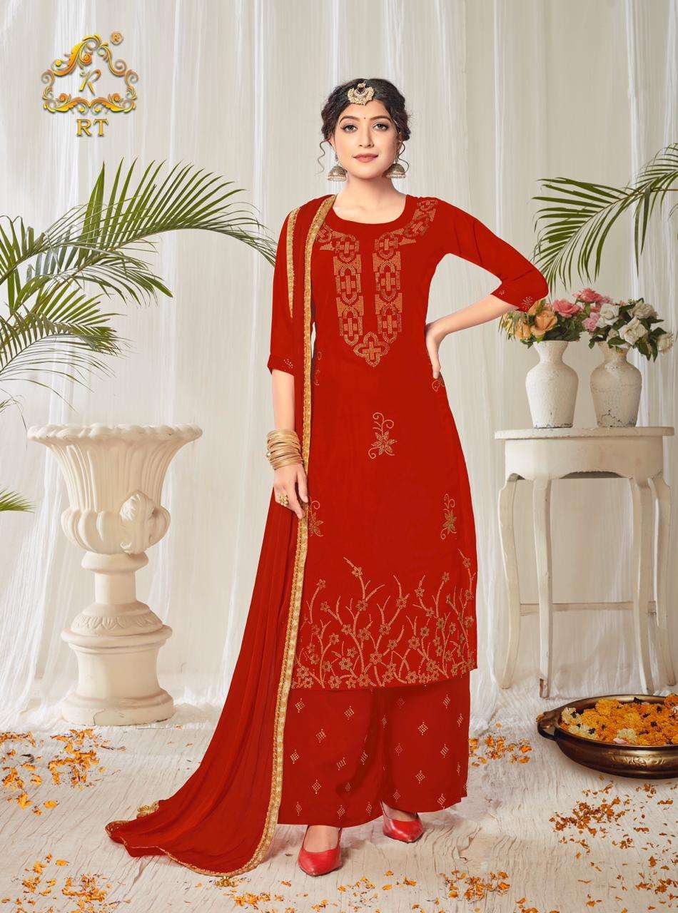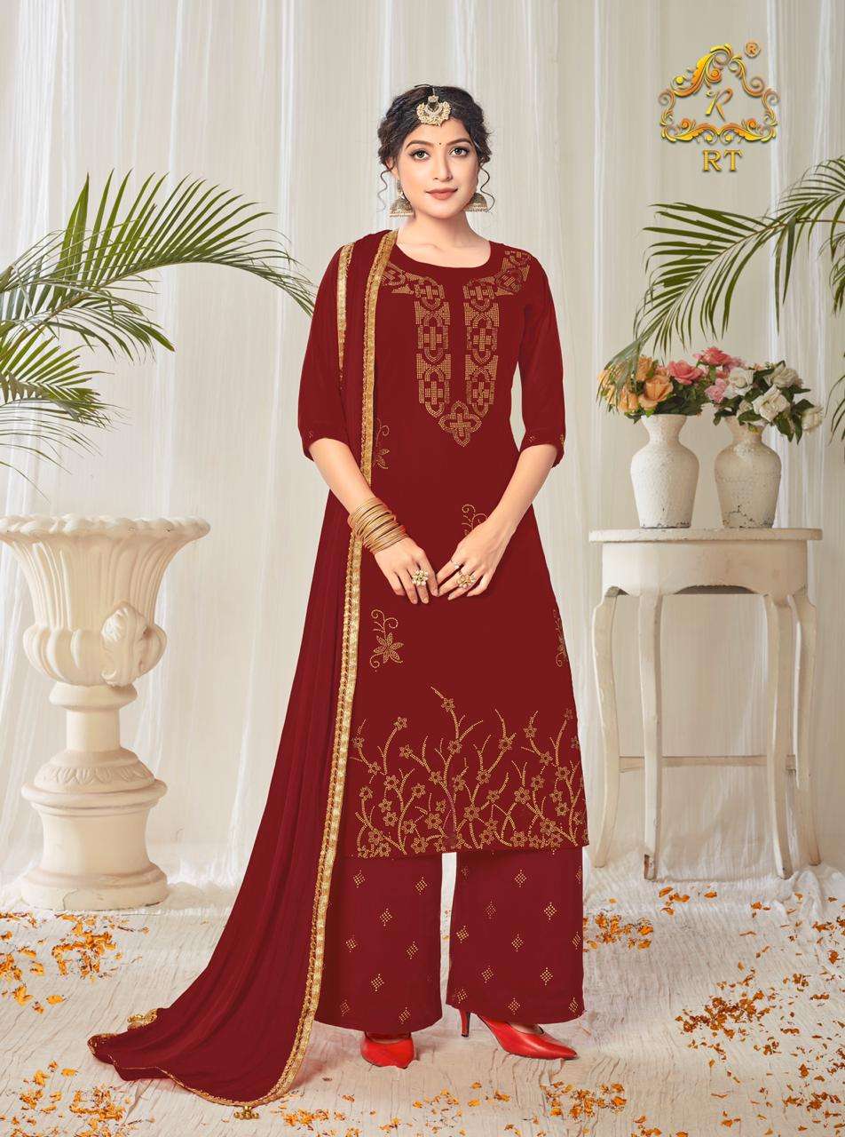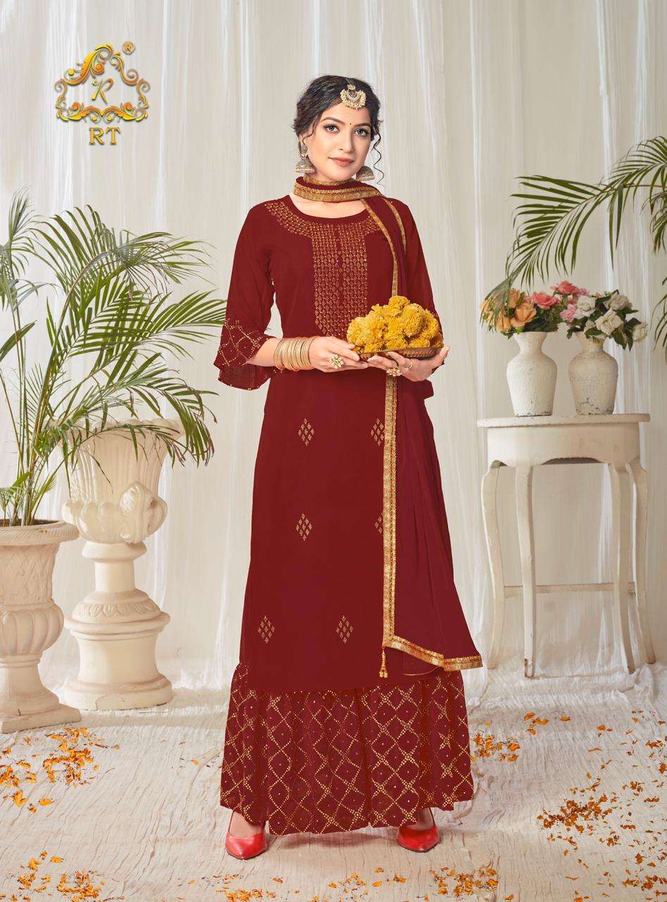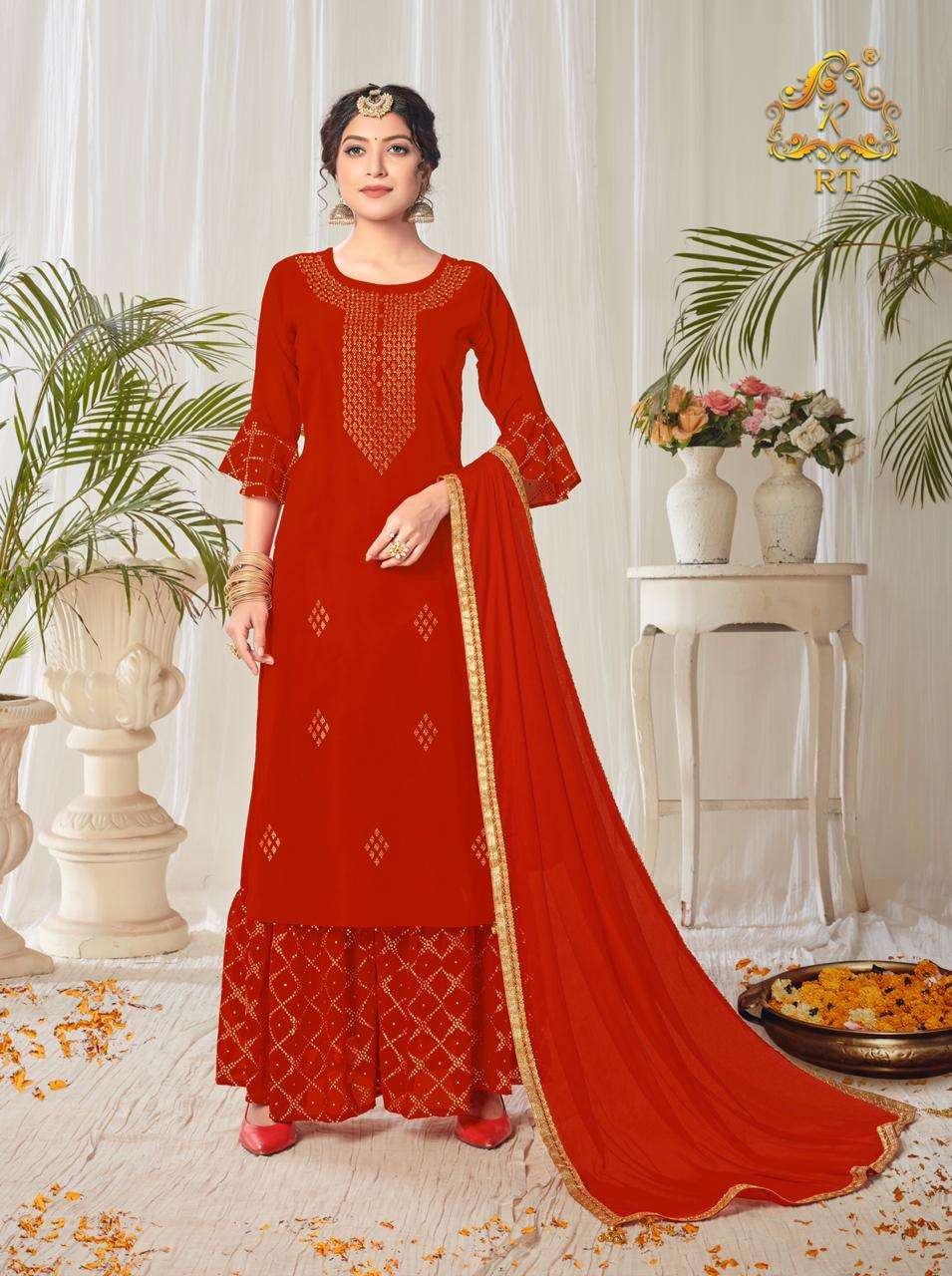 Suhaag  by RIJIYA TRENDS (RT) Kurti with plazzo/sharara and dupatta (Full stitched) Design: 4 pieces Fabric: (Top/Bottom) Georgette with full inner (Dupatta) Chinon silk with four side lace            border Pattern: (Top) Diamond work (Bottom) Mukaish work Size:  L(40), XL(42), XXL(44) Rate:  1,175/- + (5% GST) Book your order now |