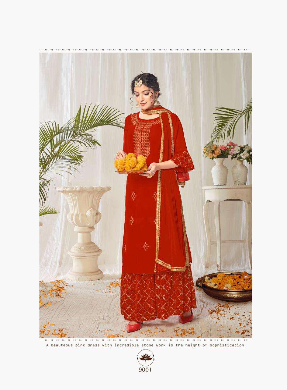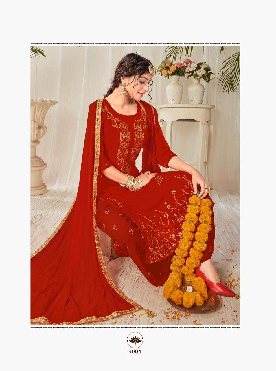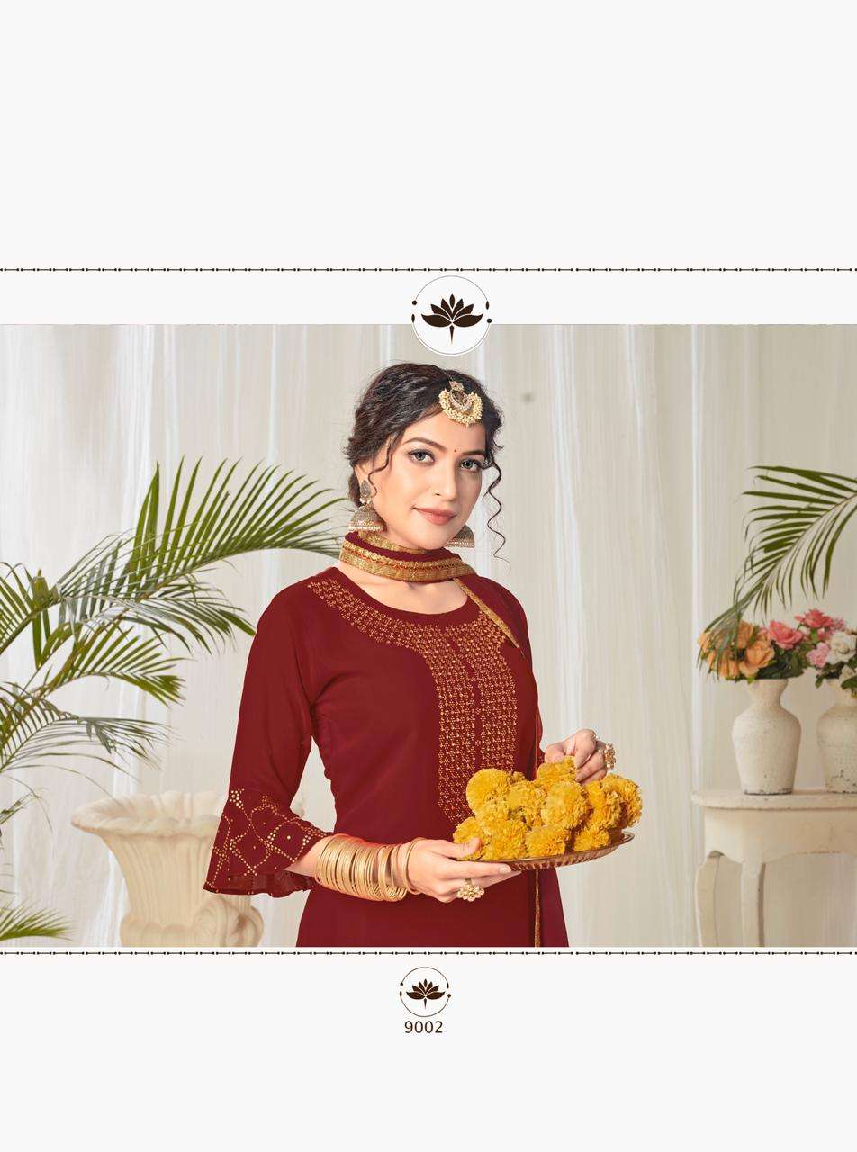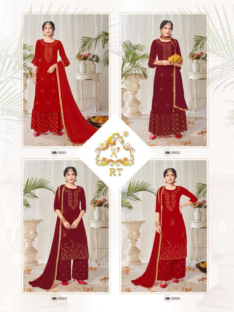 Suhaag  by RIJIYA TRENDS (RT) Kurti with plazzo/sharara and dupatta (Full stitched) Design: 4 pieces Fabric: (Top/Bottom) Georgette with full inner (Dupatta) Chinon silk with four side lace            border Pattern: (Top) Diamond work (Bottom) Mukaish work Size:  L(40), XL(42), XXL(44) Rate:  1,175/- + (5% GST) Book your order now |