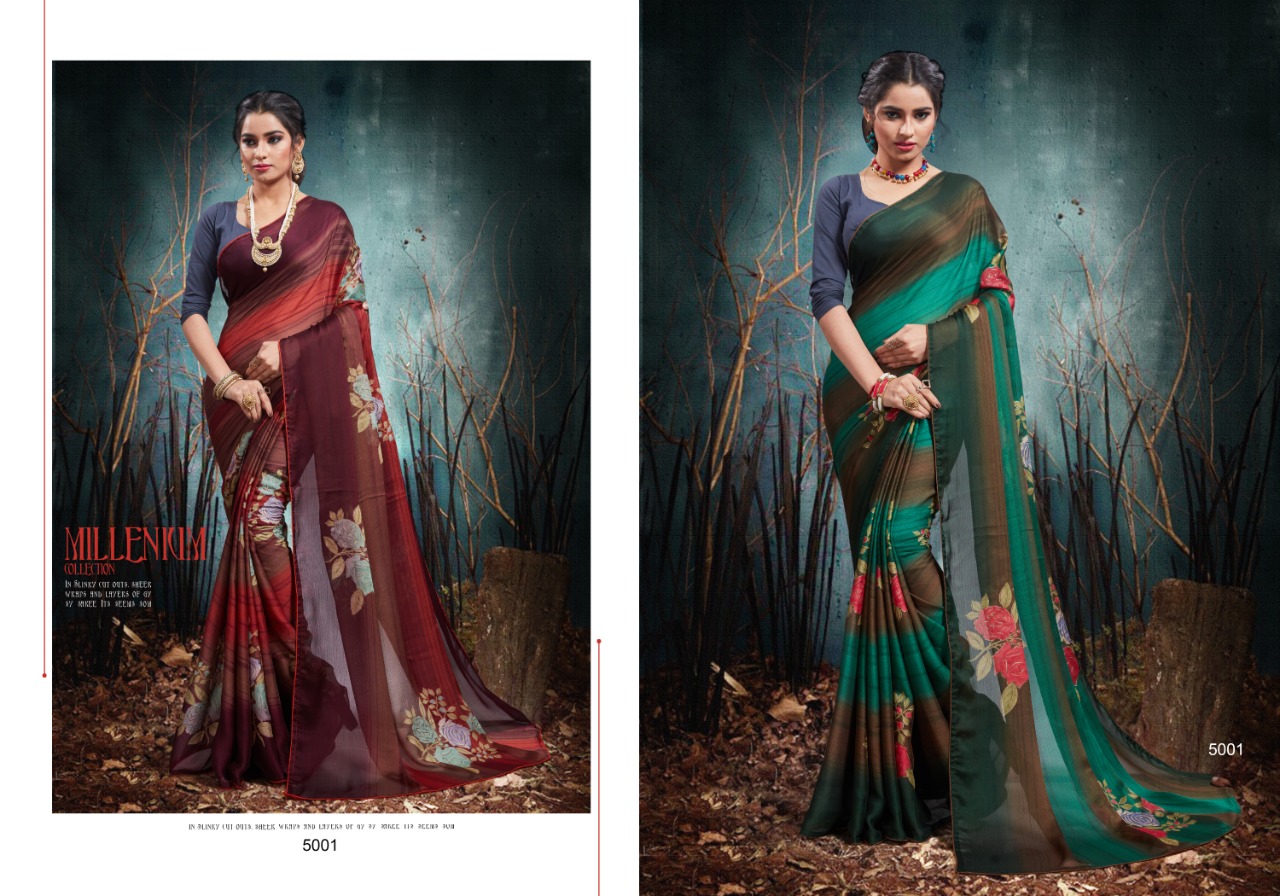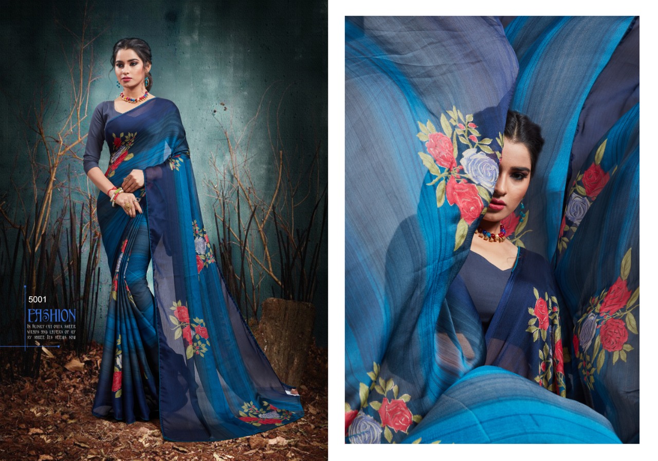 Suhanee Brand:- MANSAROVER FASHION Rate:- 410/- _Fabric:- Moss CHIFFON sprey print with Dori piping WITH EXCLUSIVE American blouse Total Designs:- 08 _Packing :- set to set Matching :- Eight COLOR Eight designh Matching WITH BLOUSE Delivery from today |
