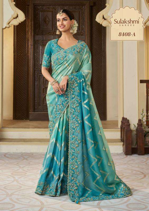 This Pure tissue silk saree drapes elegantly, creating a flowing silhouette that accentuates the beauty of the wearer. With its regal presence and intricate craftsmanship, this saree is sure to turn heads and steal hearts. Brand : Sulakshmi Catalog Name : Wedding Saga Hit Colours Saree Fabric : Pure Tissue Silk Fabric With Embroidery, Stone, Pearl, Real Mirror Work On Border With Zari Weaving Across The all Over Saree Blouse Fabric : Silk With Work Rate : List Attached +5% Gst Occasion : Wedding Wear, Ceremonial, Party Wear |